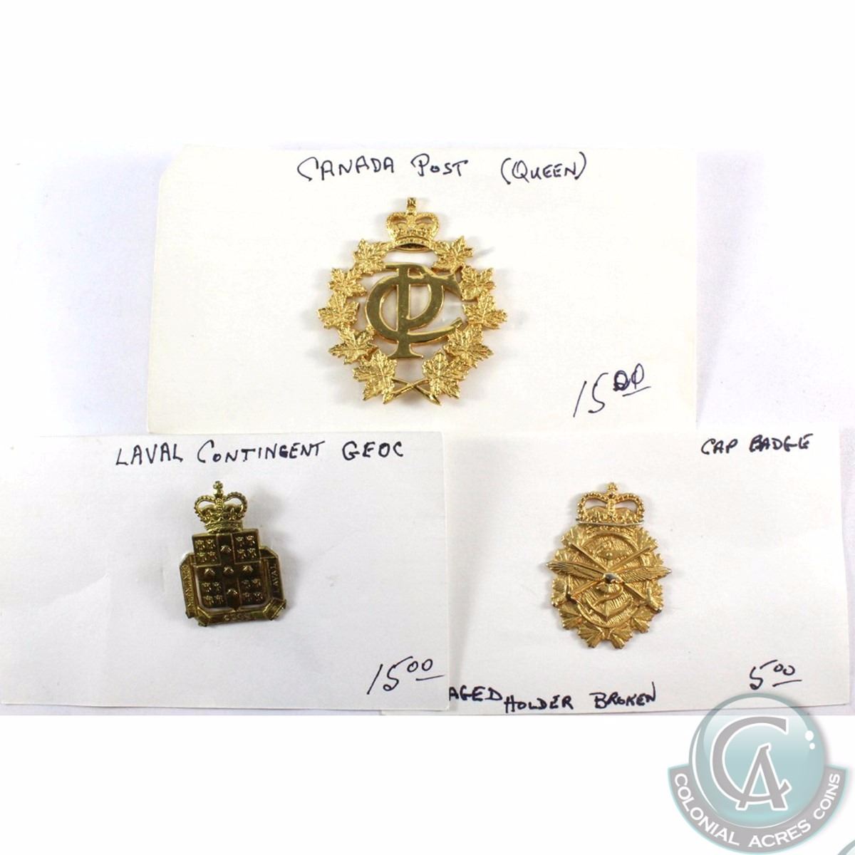 Mixed Lot of Badges. You will receive the Laval Contingent CEOC, a cap badge (damaged) and a Canada Post Badge. 3pcs