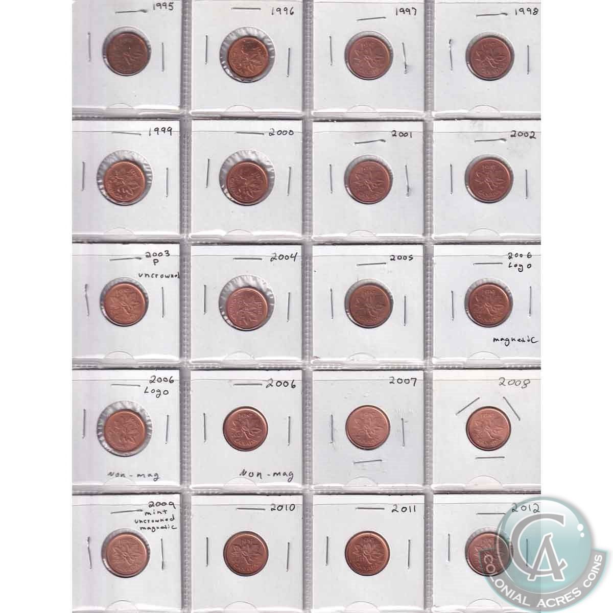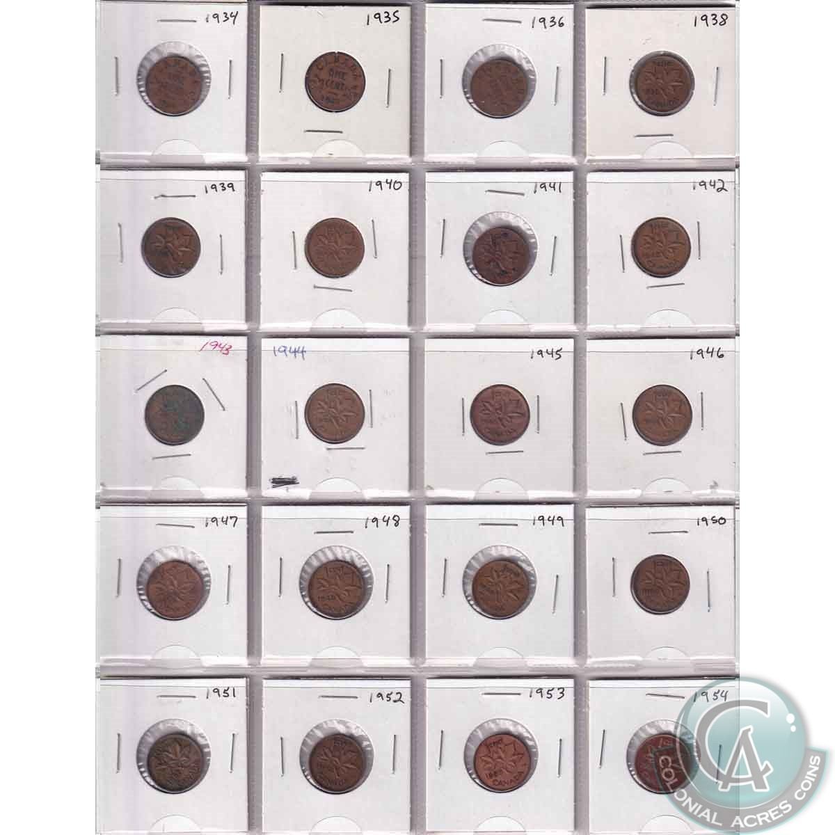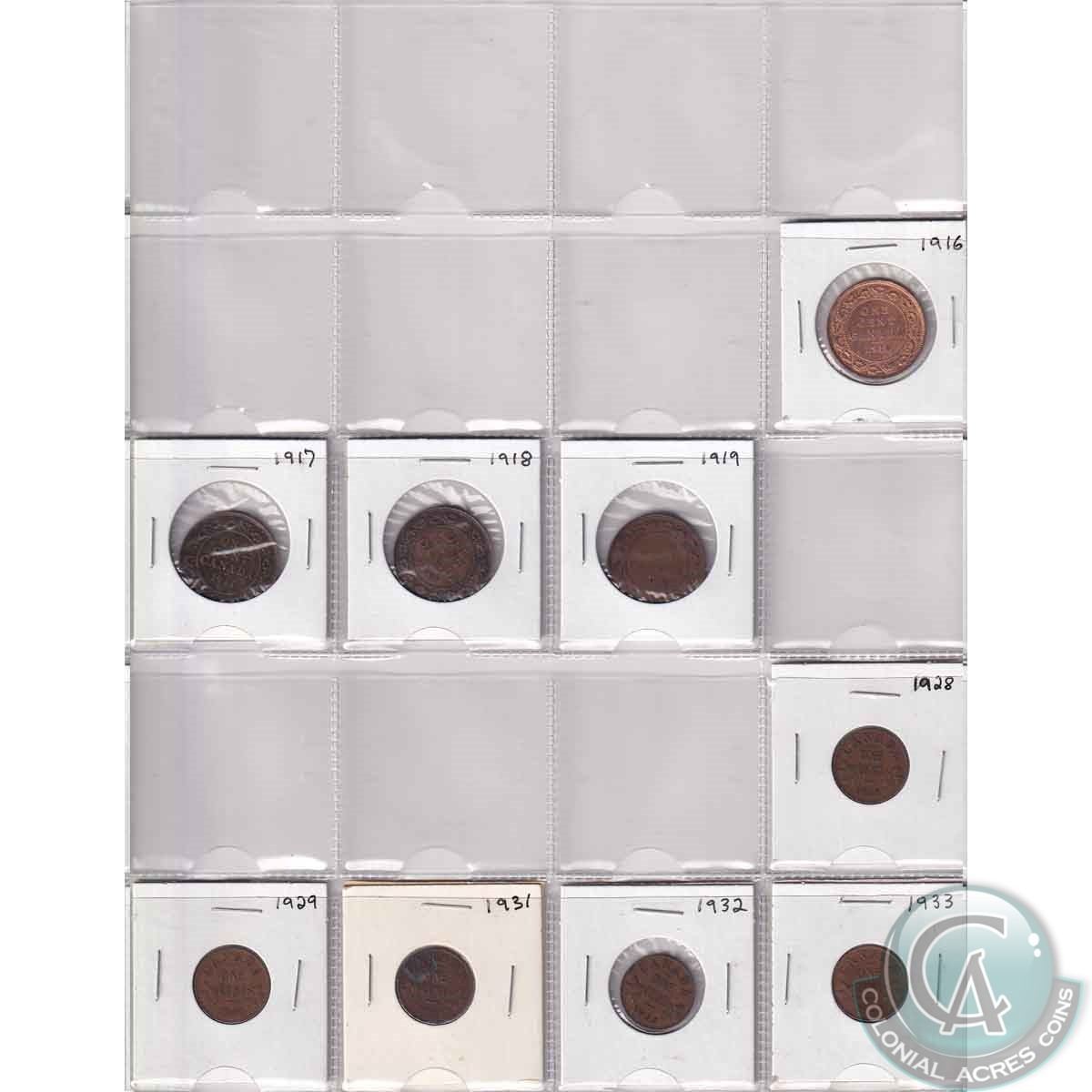 Mixed Lot of Canadian 1-cents dated 1916-2012. You will receive 1916-1919, 1928, 1929, 1931-1936, 19