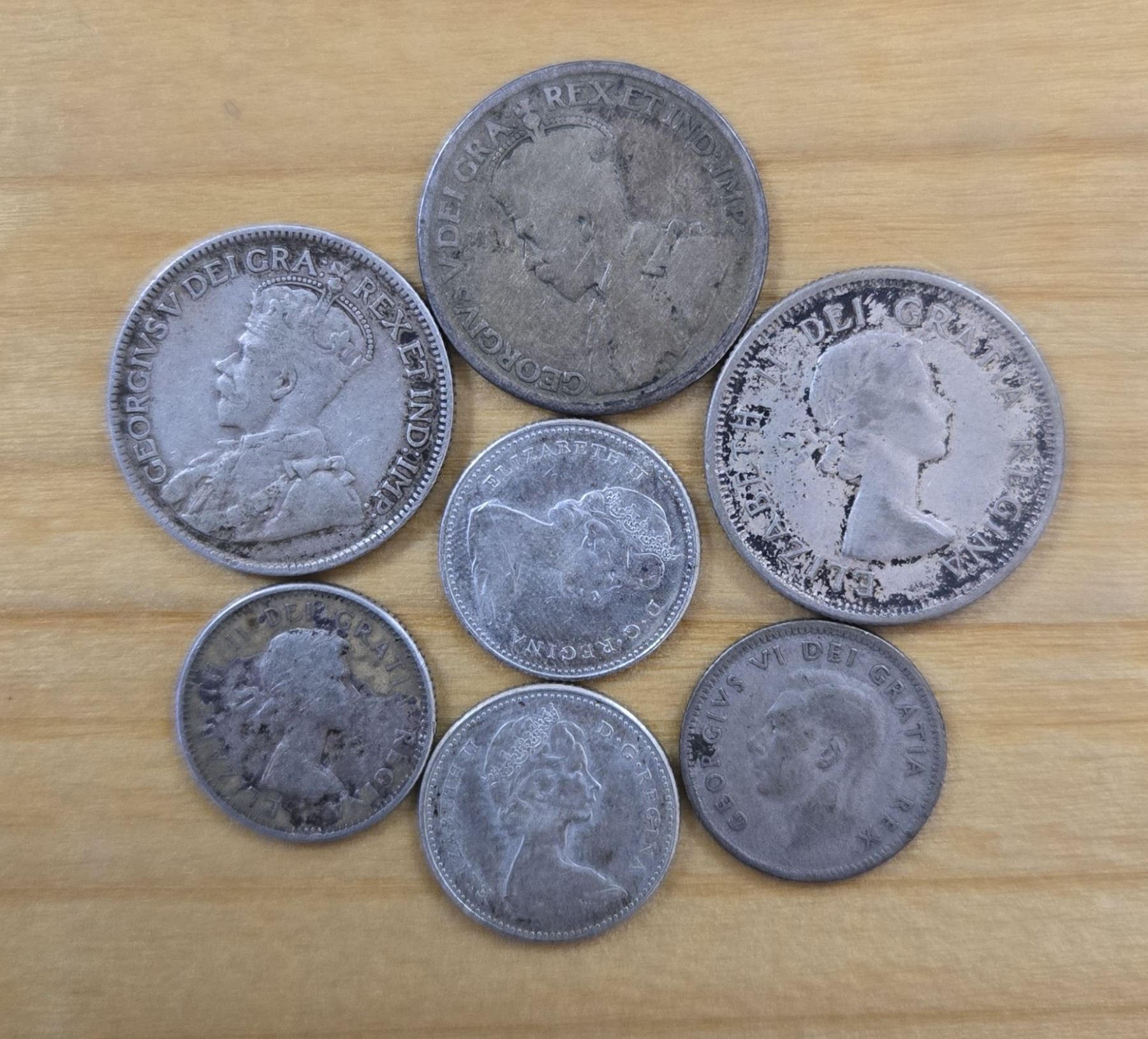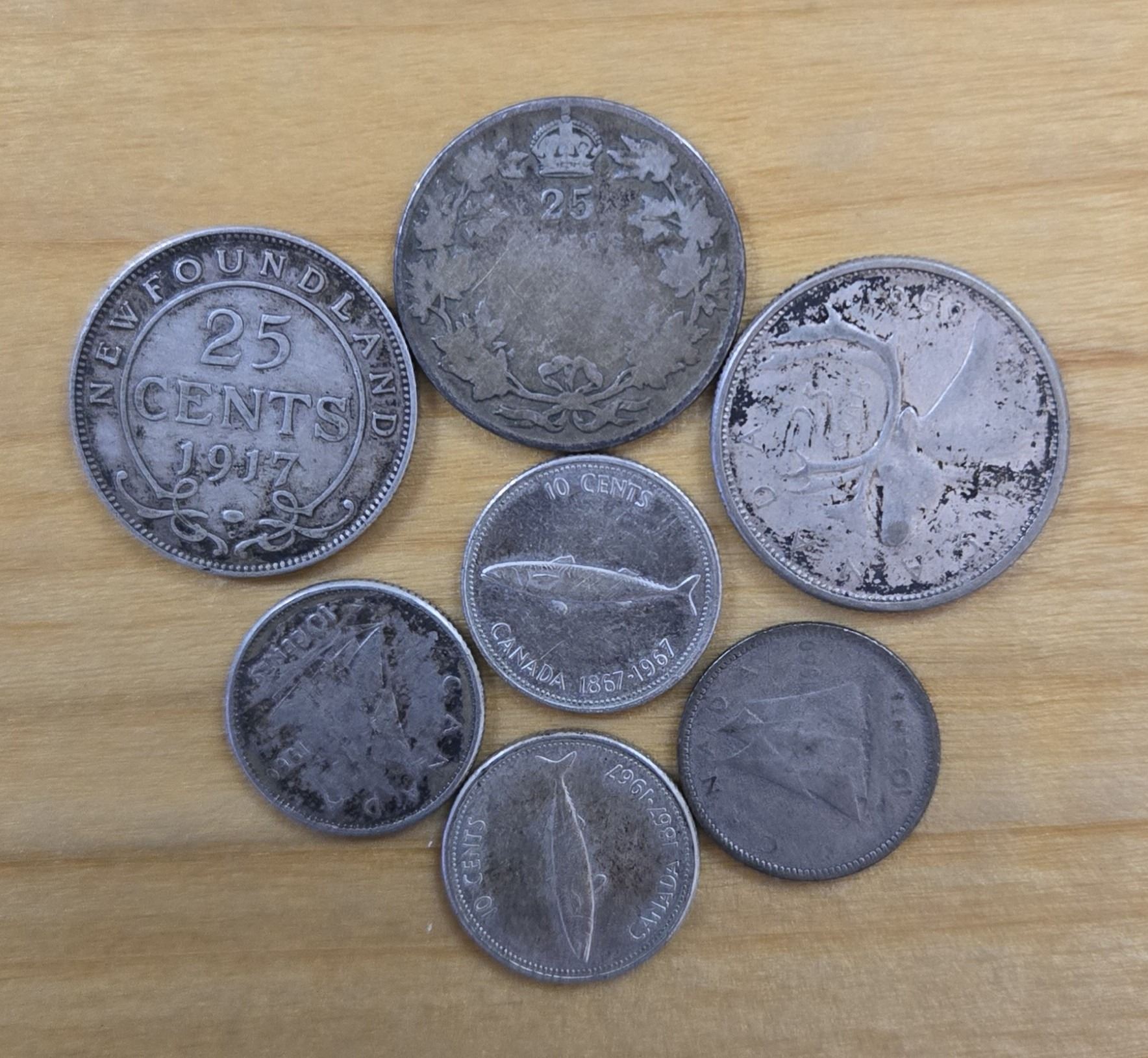 Mixed Lot of Canadian Silver Coins including one 1917 Newfoundland quarter, one 1917 quarter, one 1959 quarter, one 1950 dime, one 1959 dime and two 1967 dimes.