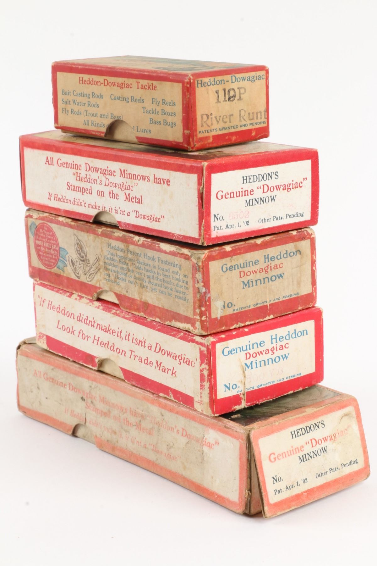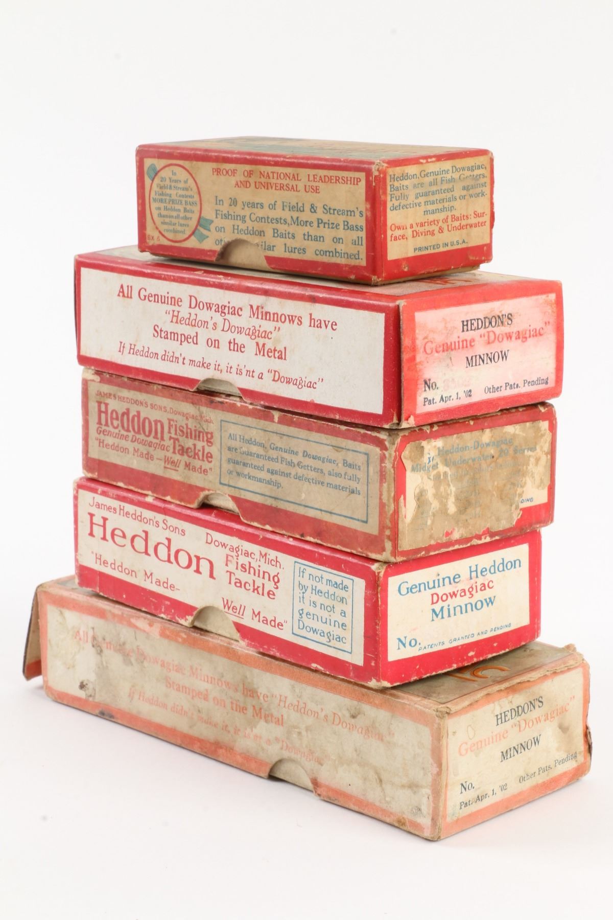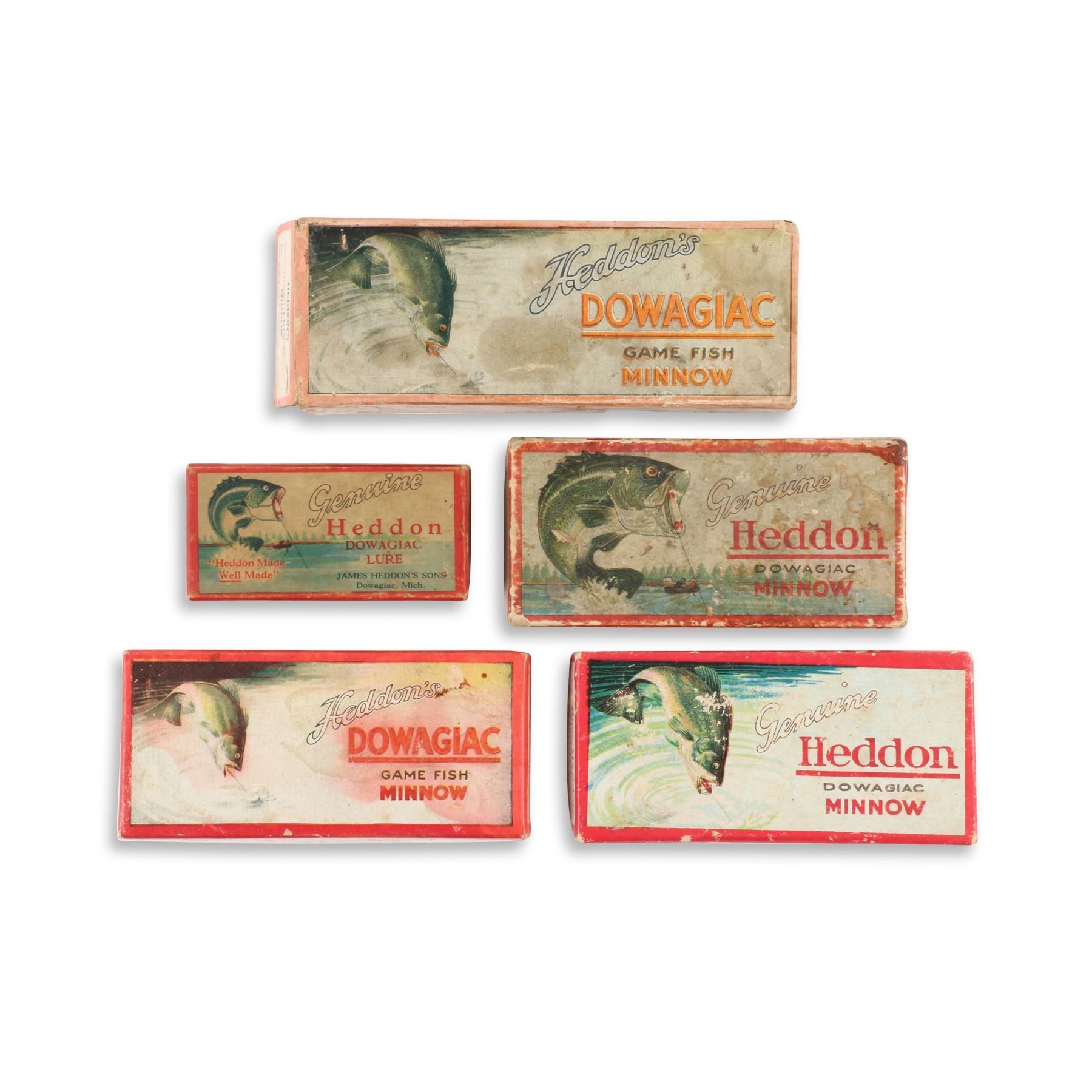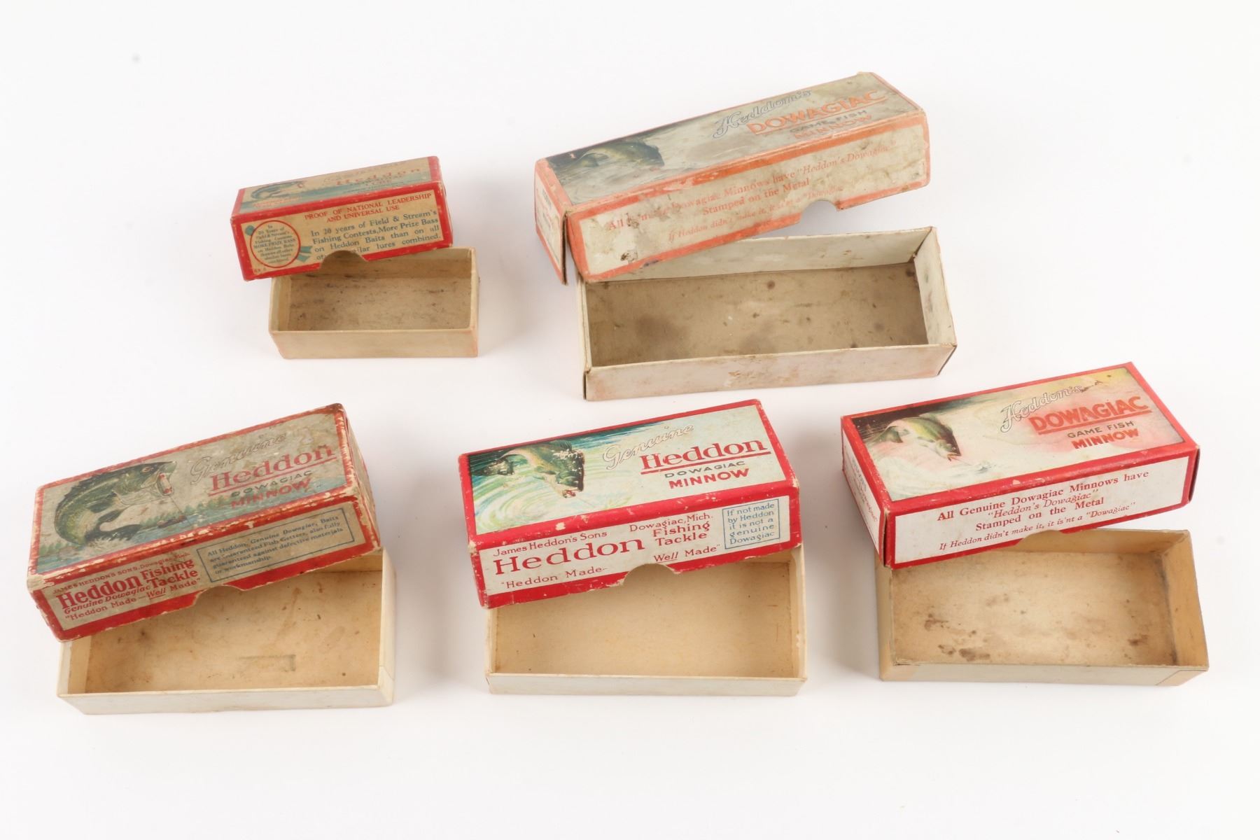 Heddon, United States. 1920s to 1940s. Material: Cardboard. Quantity: 5. Grade: VG. 4.50" - 5.75" boxes. Est. $100-125.