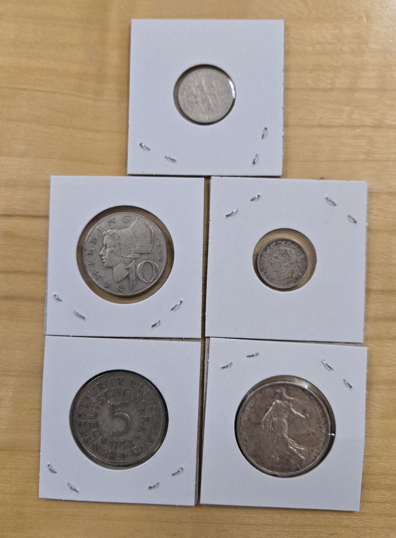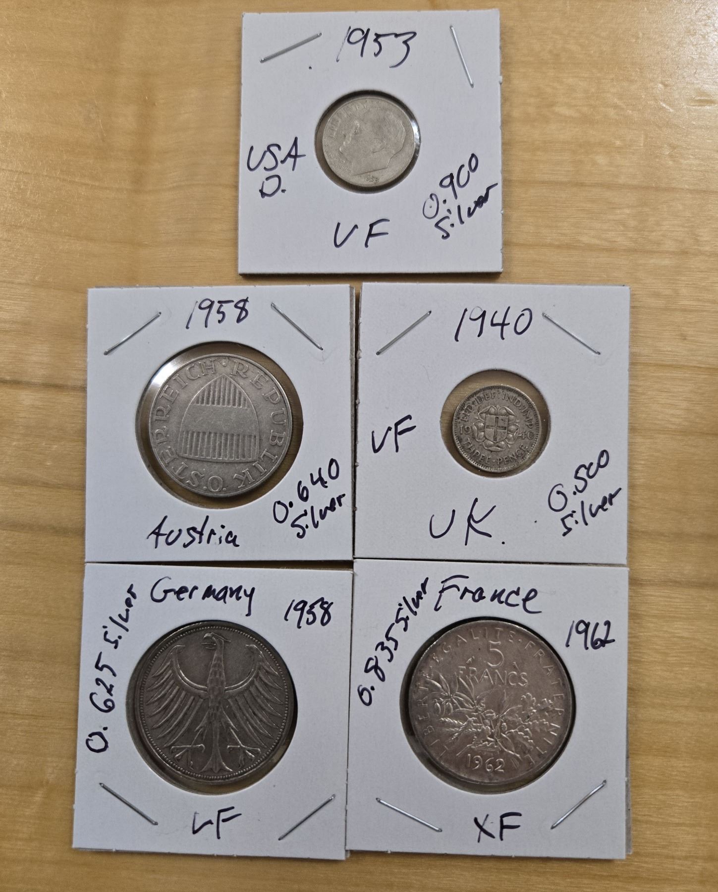 Mixed Lot of Five Foreign Silver Coins including one 1940 United Kingdom three pence, 1953 American dime, one 1958 Austrian 10 schilling, one 1958 German five mark, and one 1962 French five francs.