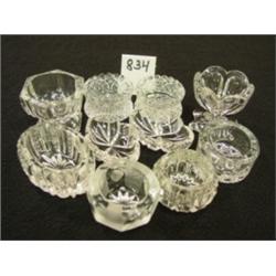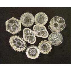 Ten assorted salt dips in various patterns. Unmarked. Two are footed. Includes star patterns, dots, fans, acid cuts, etc. Two pairs are alike. Condition: Excellent