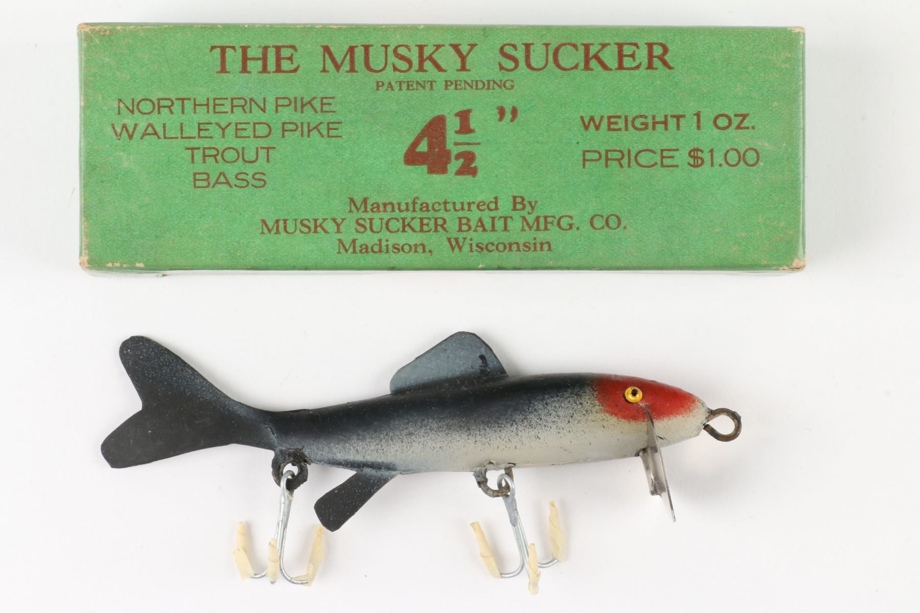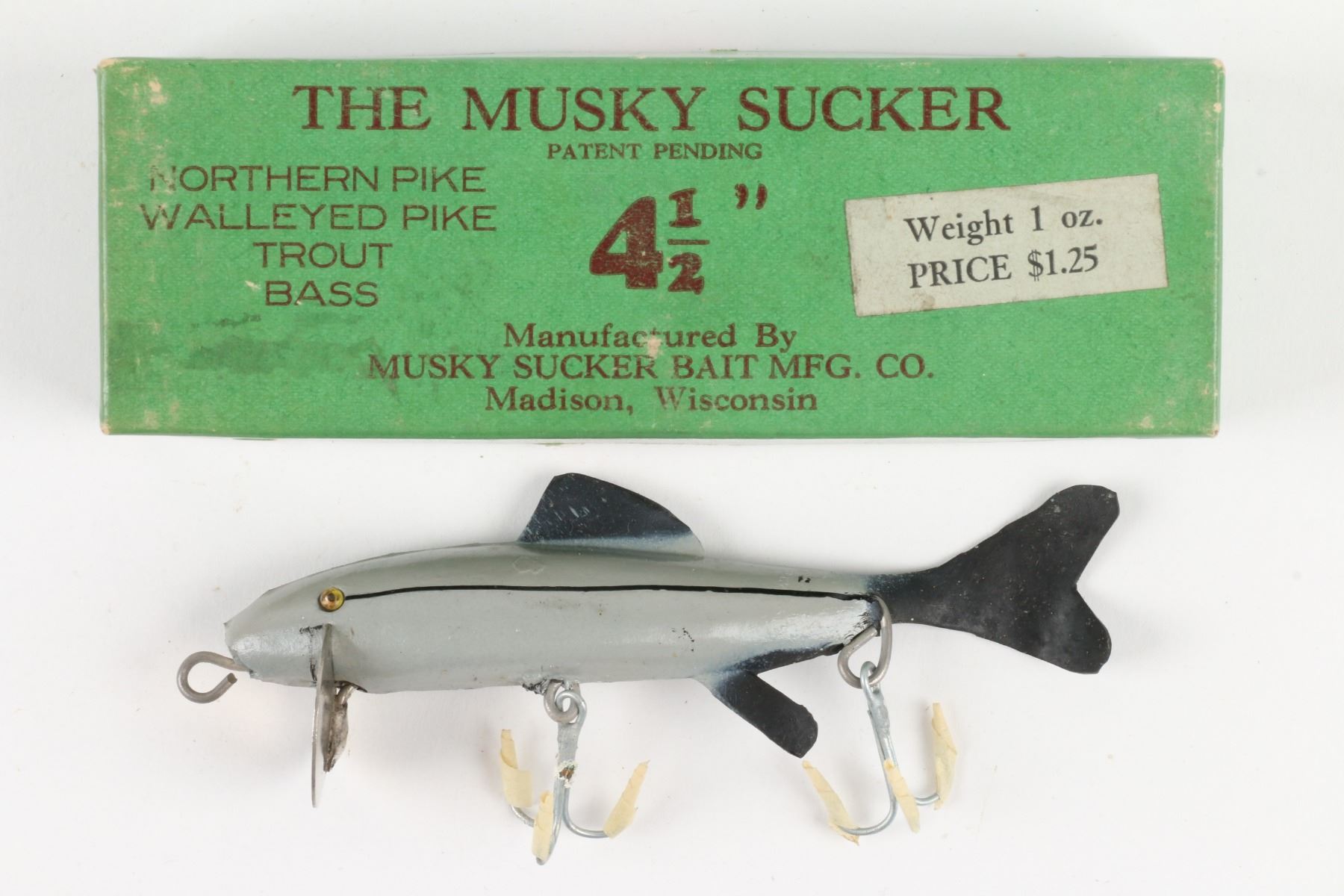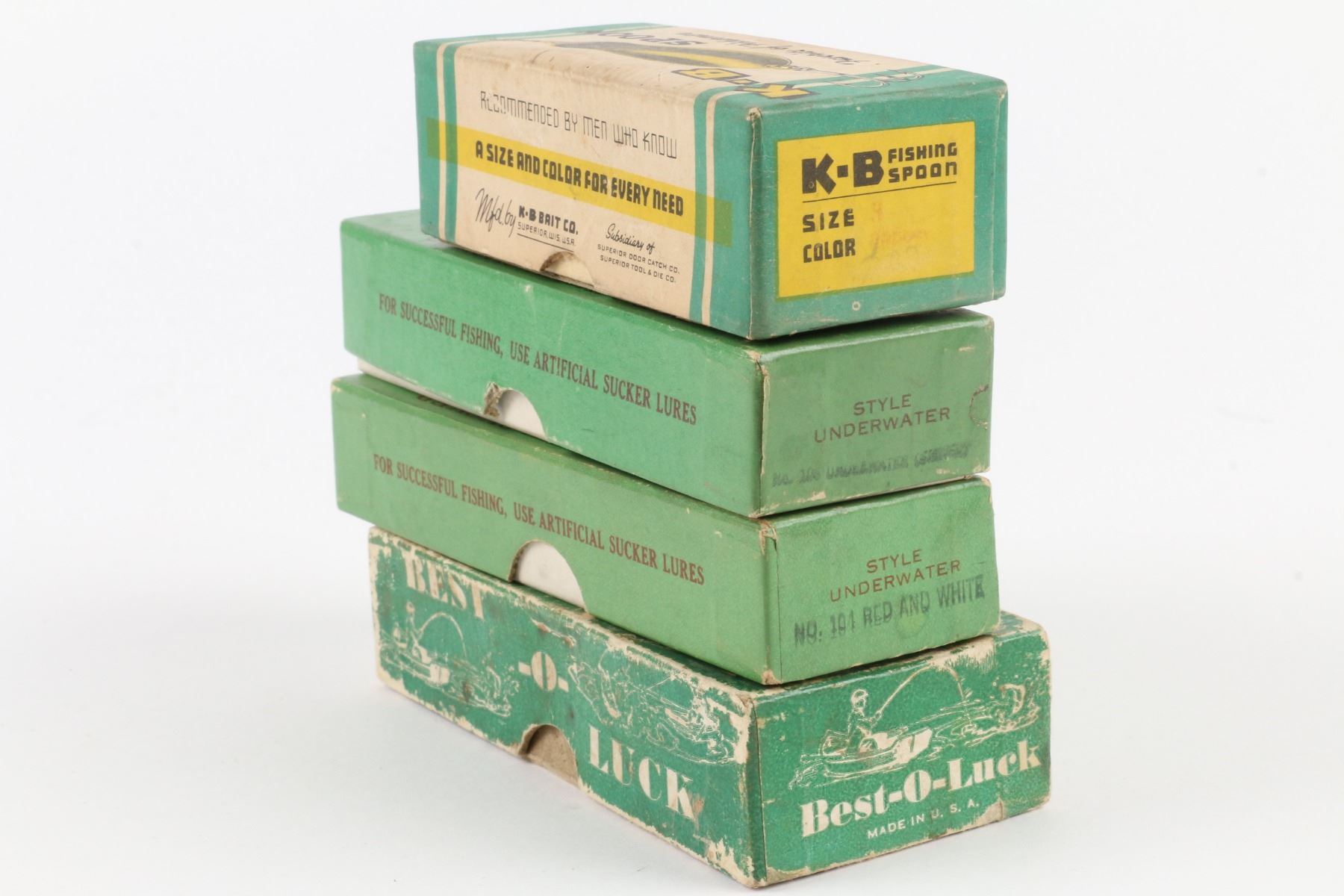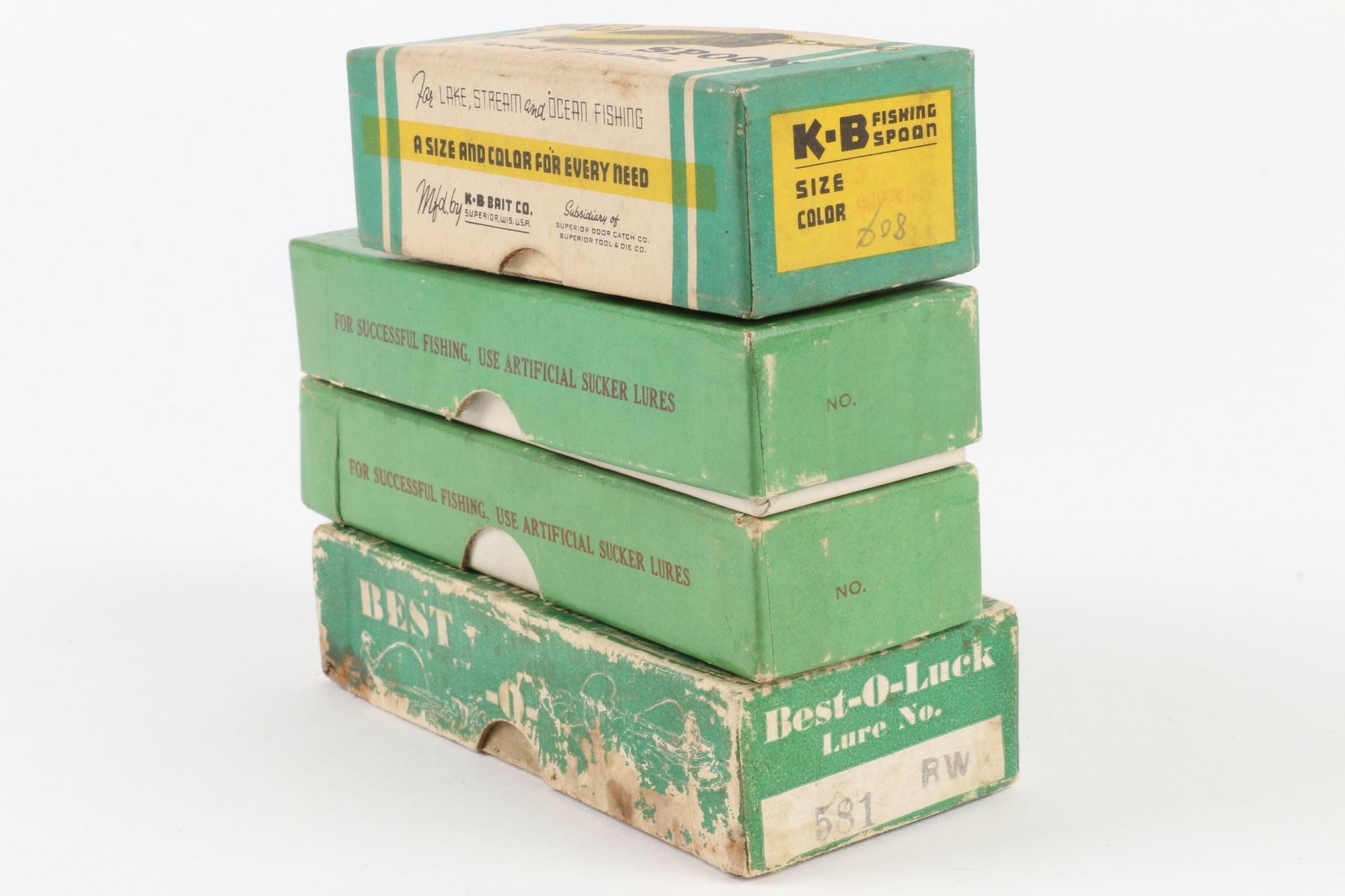 Musky Sucker Bait Company, Best-O-Luck, K-B Bait Co., United States. Boxed. Material: Mixed. Quantity: 4. Grade: VG. 3.75" - 4.5" boxes. Est. $100-125.