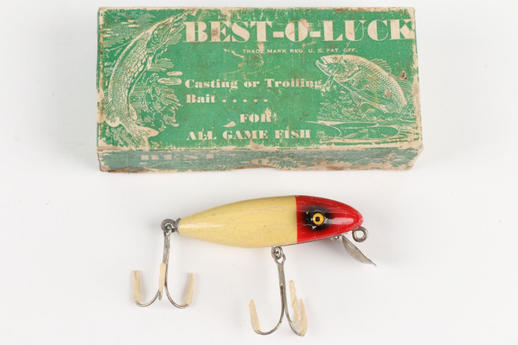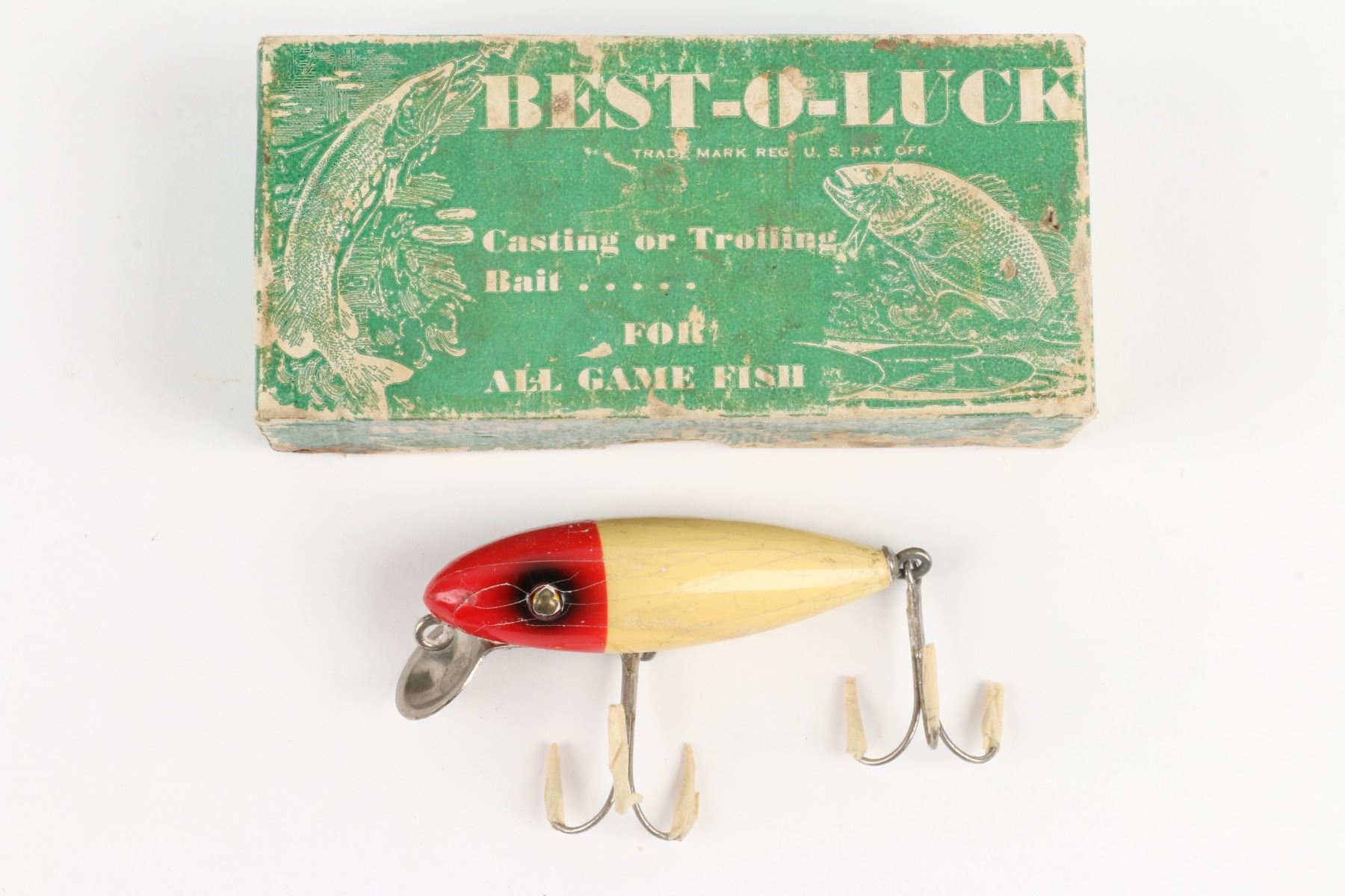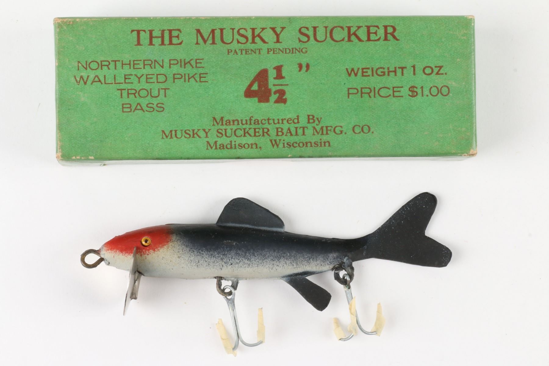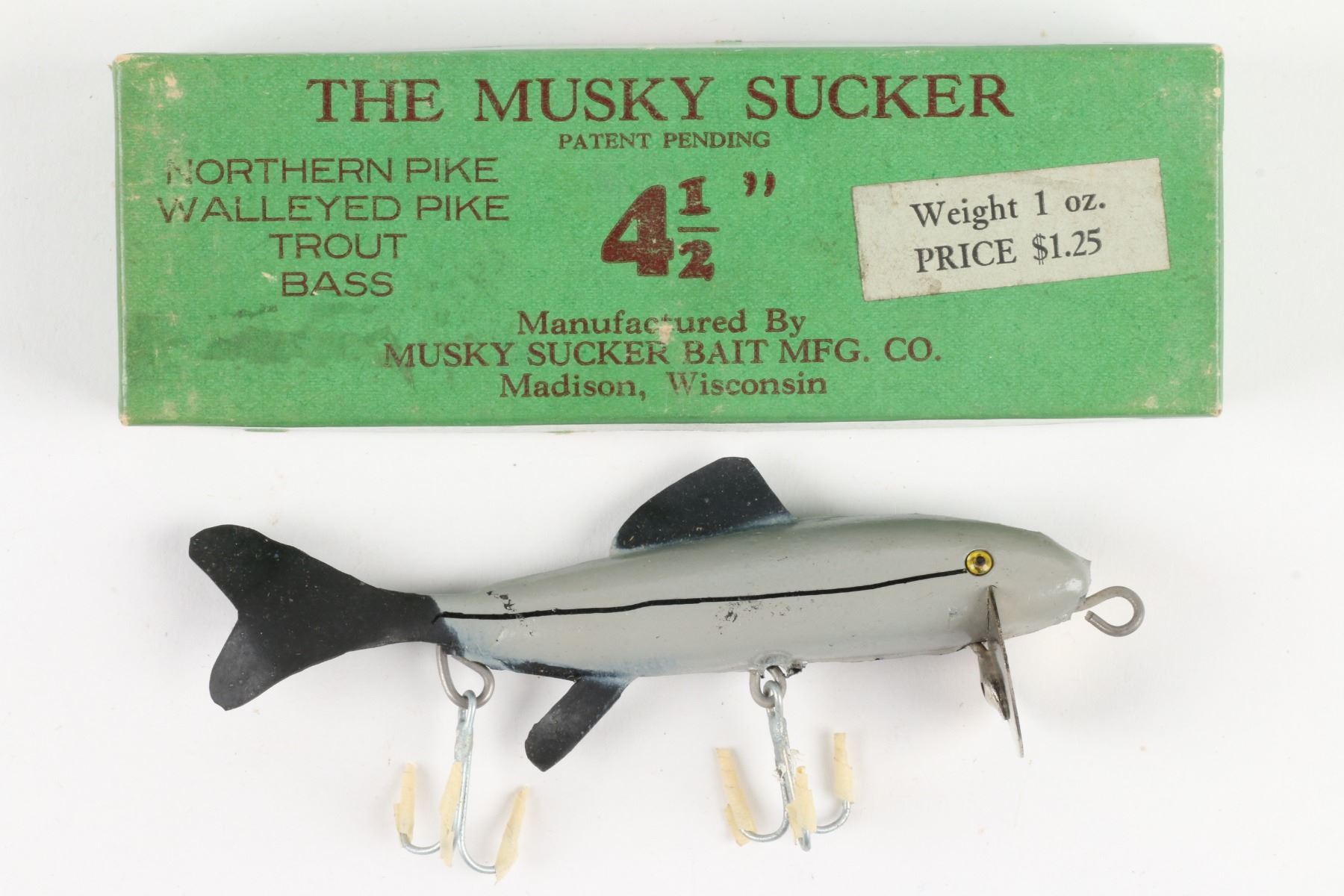Musky Sucker Bait Company, Best-O-Luck, K-B Bait Co., United States. Boxed. Material: Mixed. Quantity: 4. Grade: VG. 3.75" - 4.5" boxes. Est. $100-125.