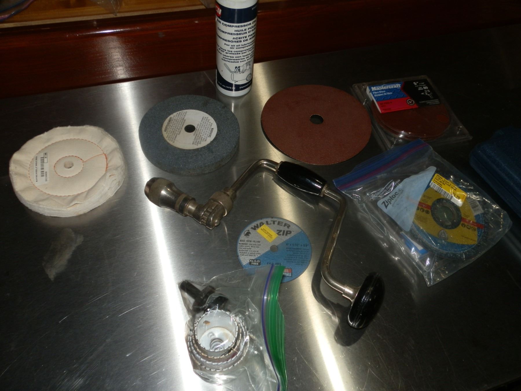 You get it all for one money, grinding discs, sanding discs, hole saw set, Auger brace, air compressor oil...Used