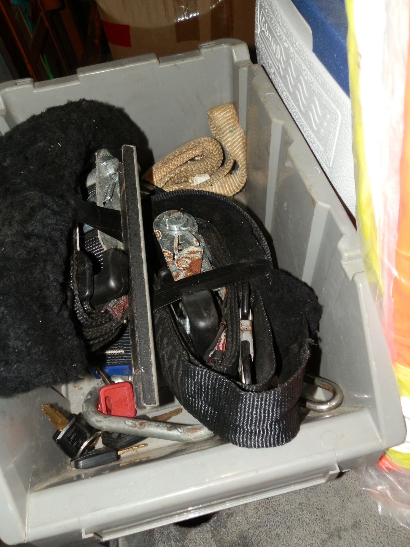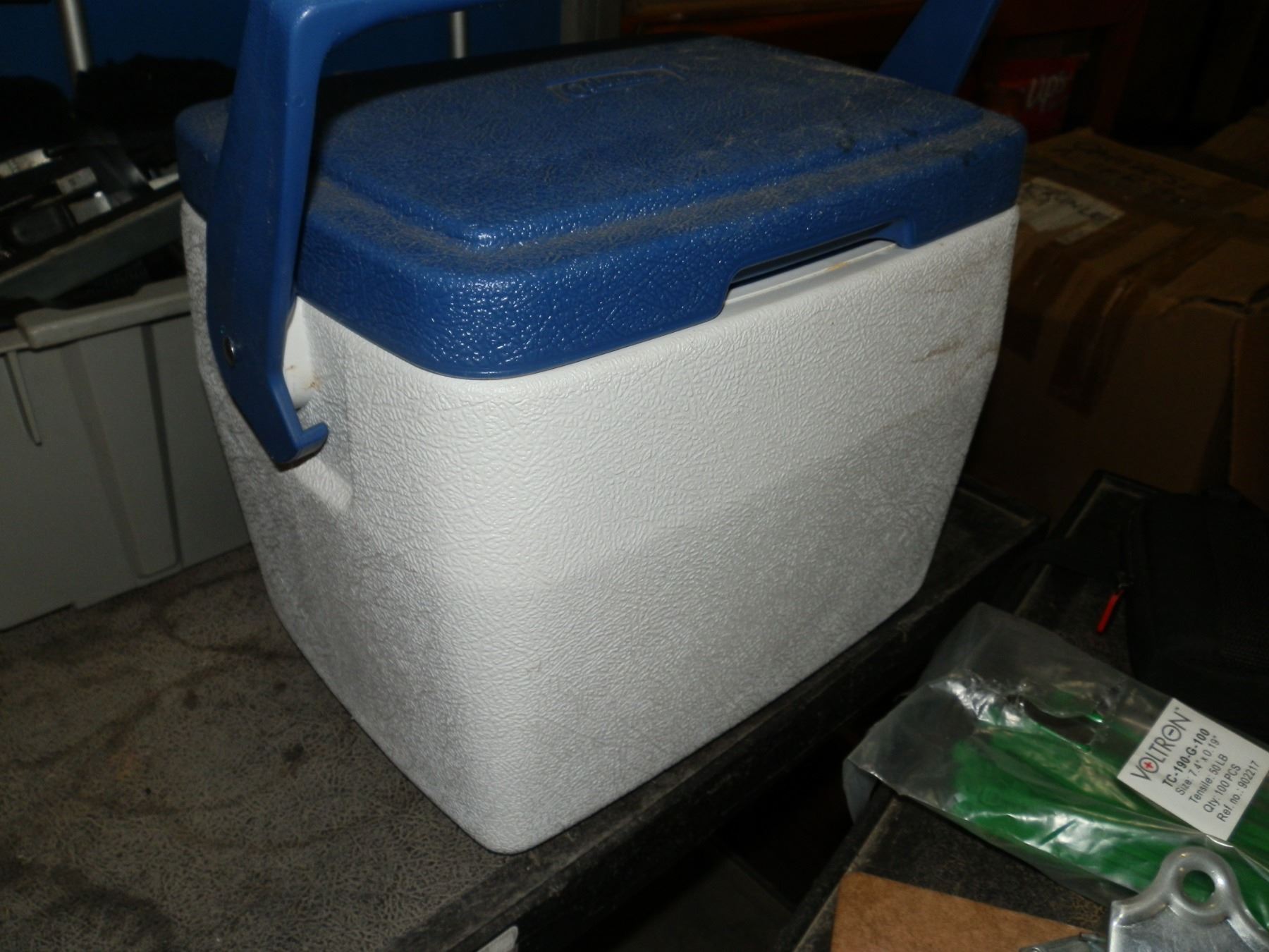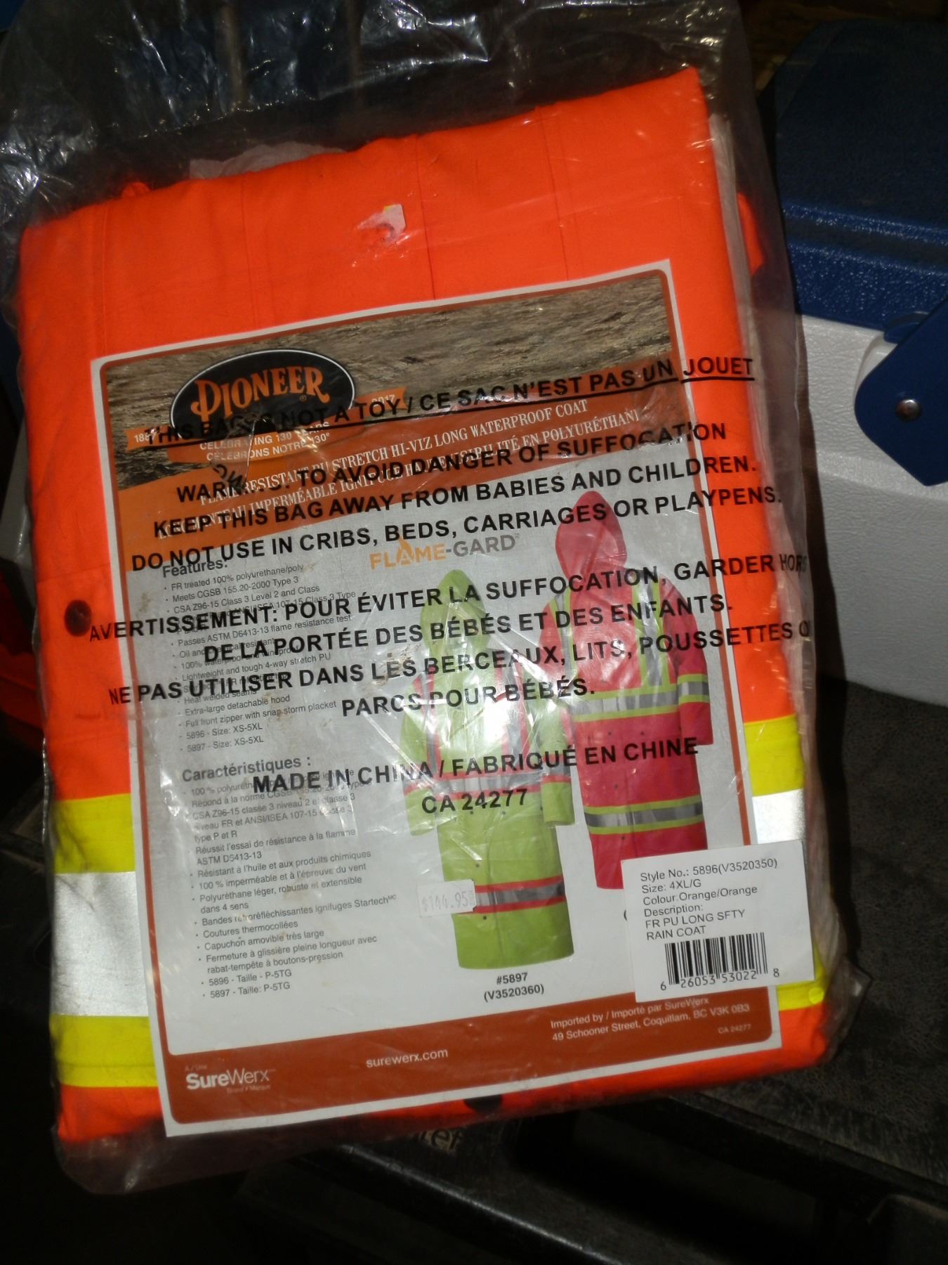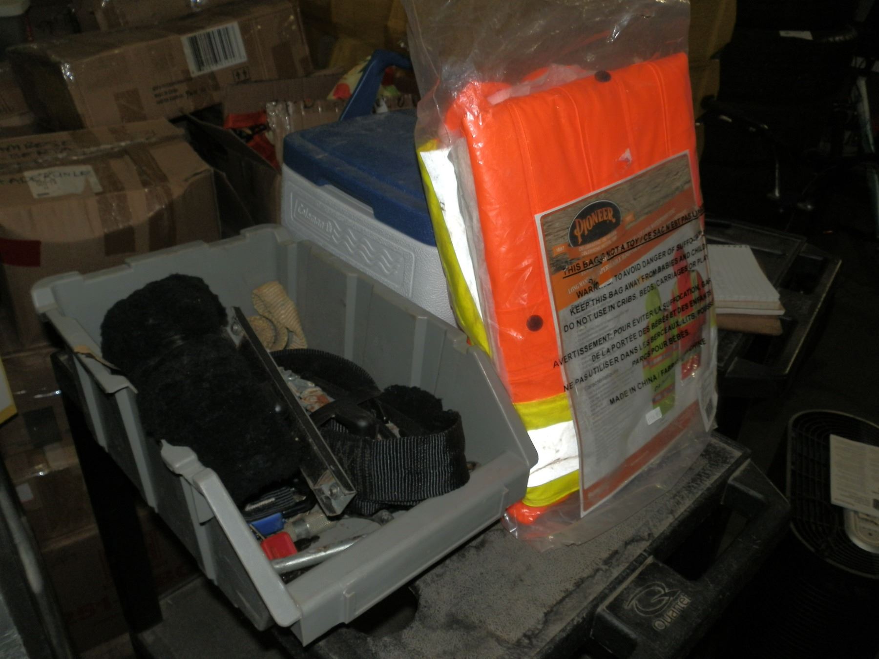 you get a small coleman cooler, tie down straps, and a fire resistant high visibility waterproof coat size 4xl.....