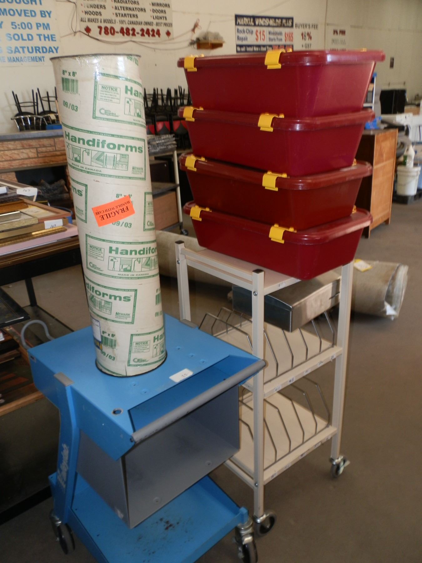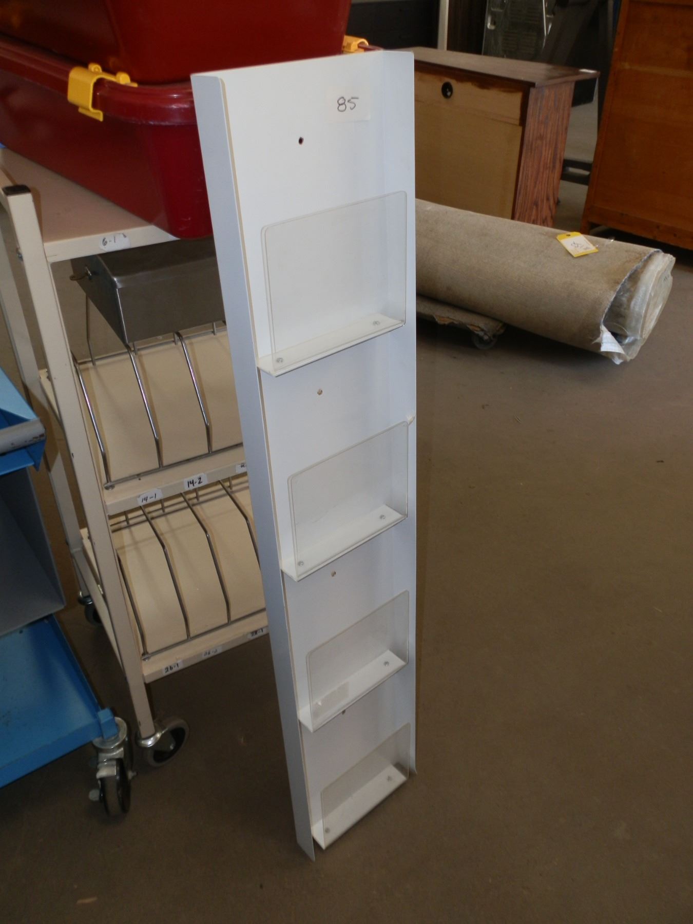 you get it all for one money, 4 storage bins, 1 paper towel dispenser, 2 small carts on wheels, 1 poster holder, 1 pamphlet holder...used
