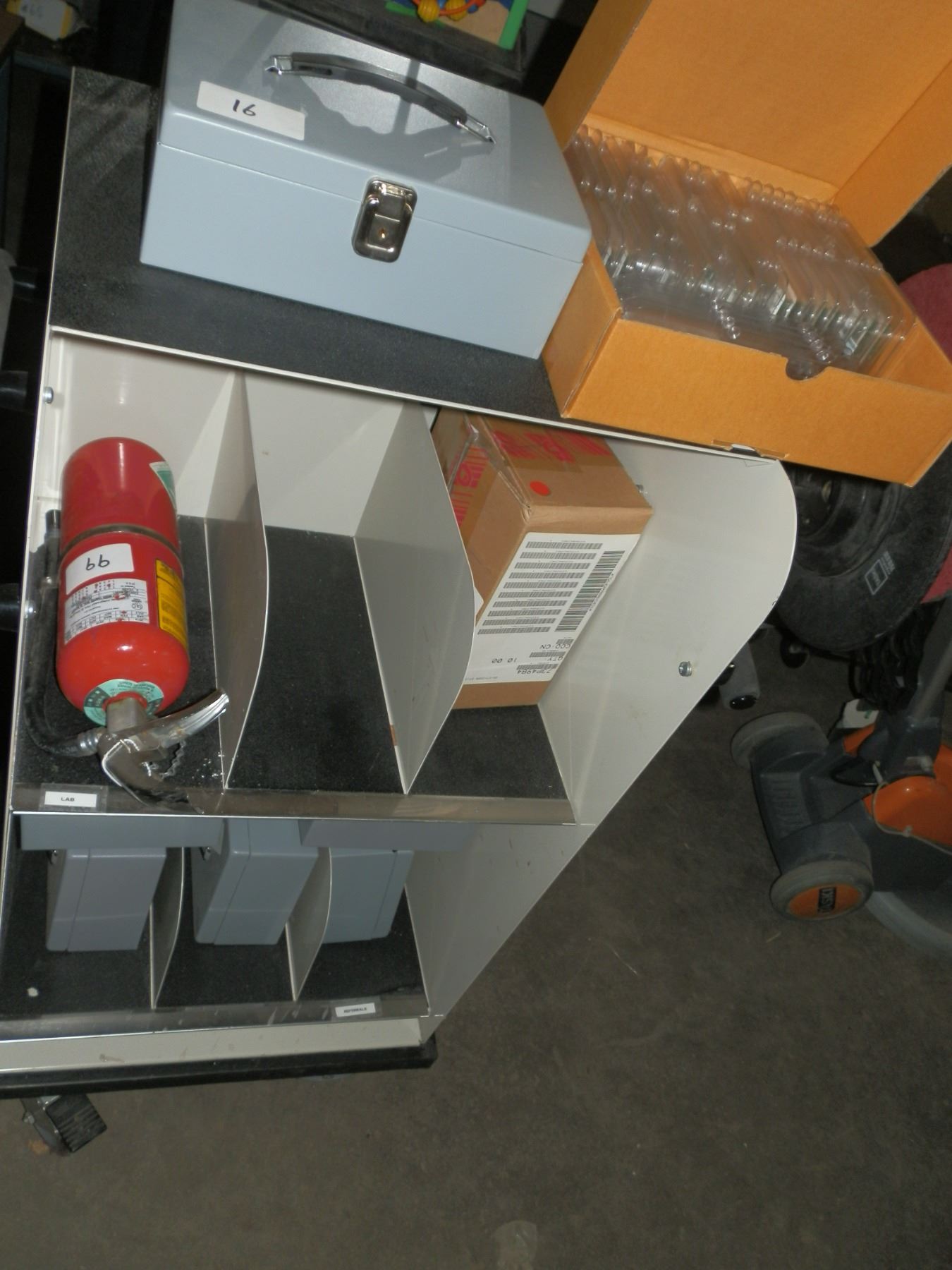 you get it all for one money, 6 small money boxes, case of computer hardware, a fire extinguisher and a small cart on wheels...used