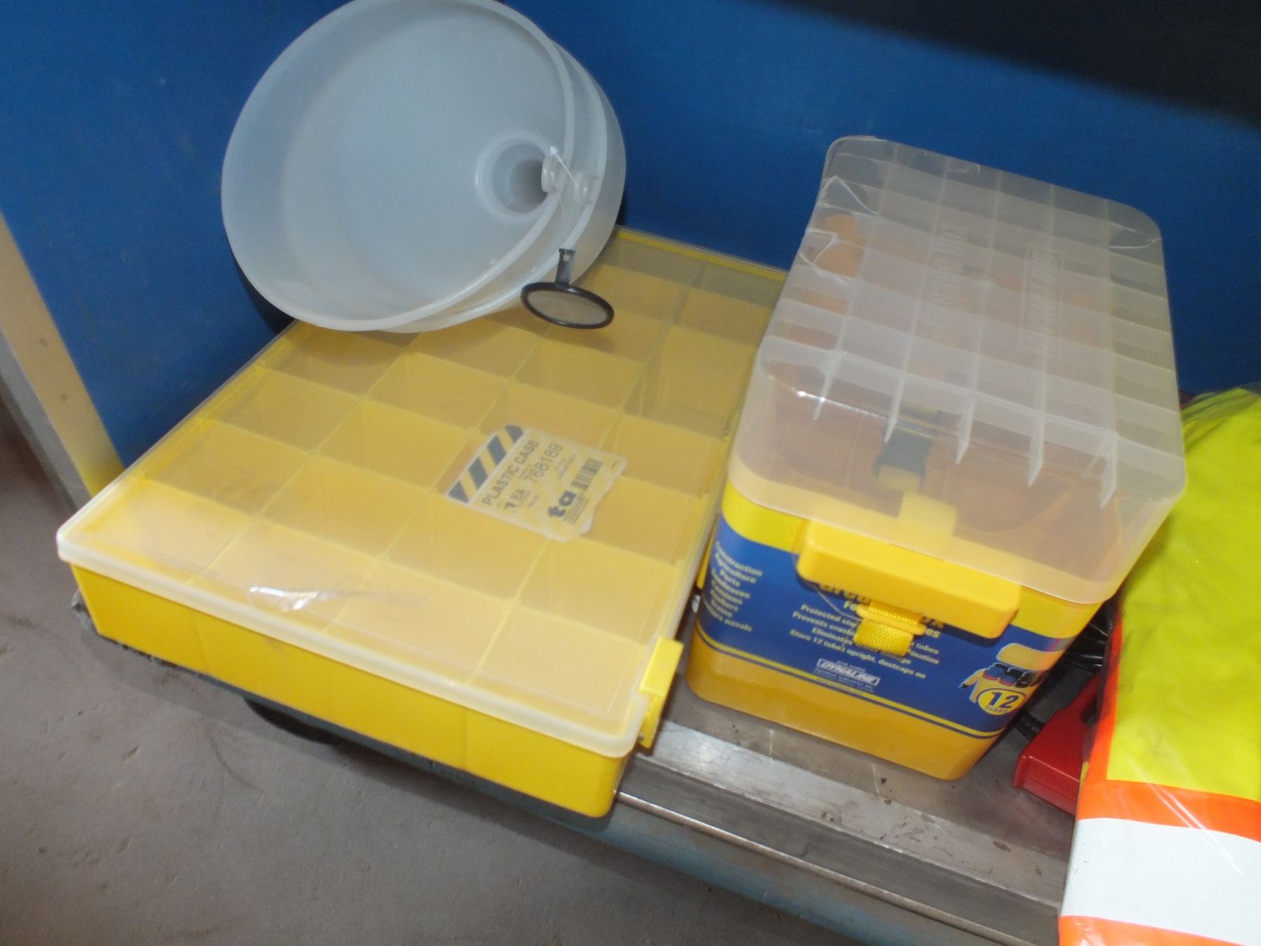 you get it all for one money, parts bins, oil funnel, grease gun, heat gun, cable clamps and a yellow reflective rain coat size 3x...new/used