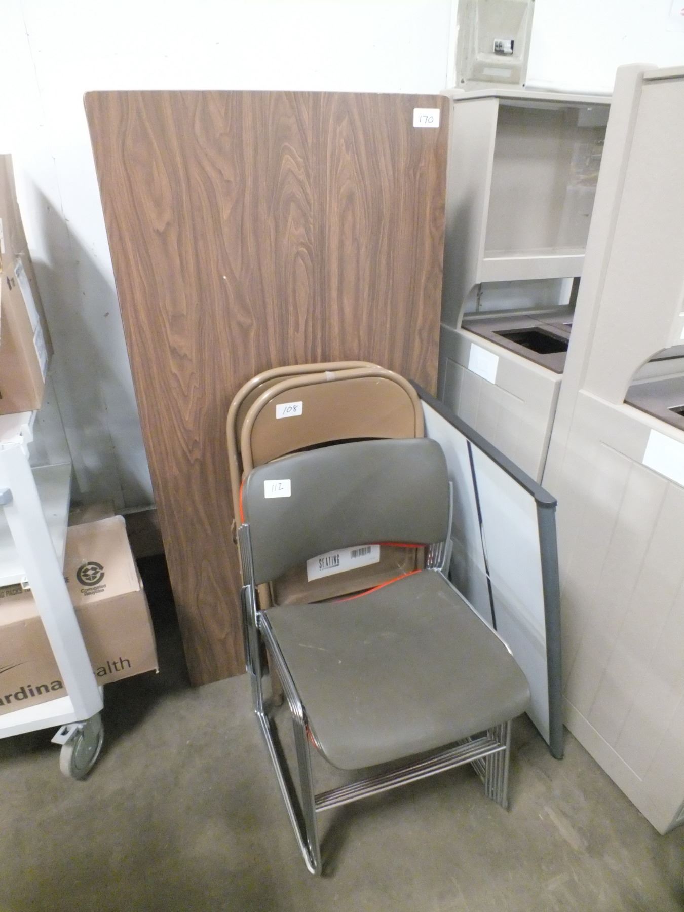 you get it all for one money, 3 brown folding tables, 5 stacking chairs, 2 folding chairs, 1 white board...used