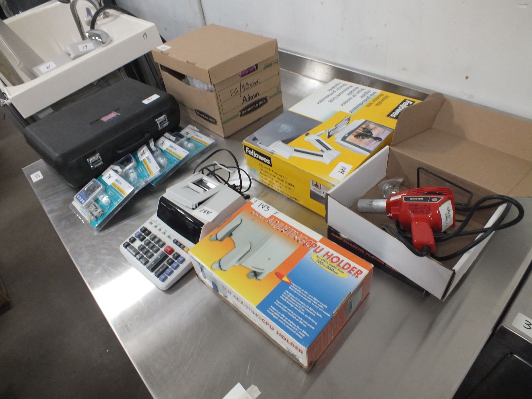 you get it all for one money, heat gun, electronic calculator, plastic case, Alarm thermometers, magnetic playing cards, self-adjusting cpu holder, adjustable monitor arm and binder dividers...new/used