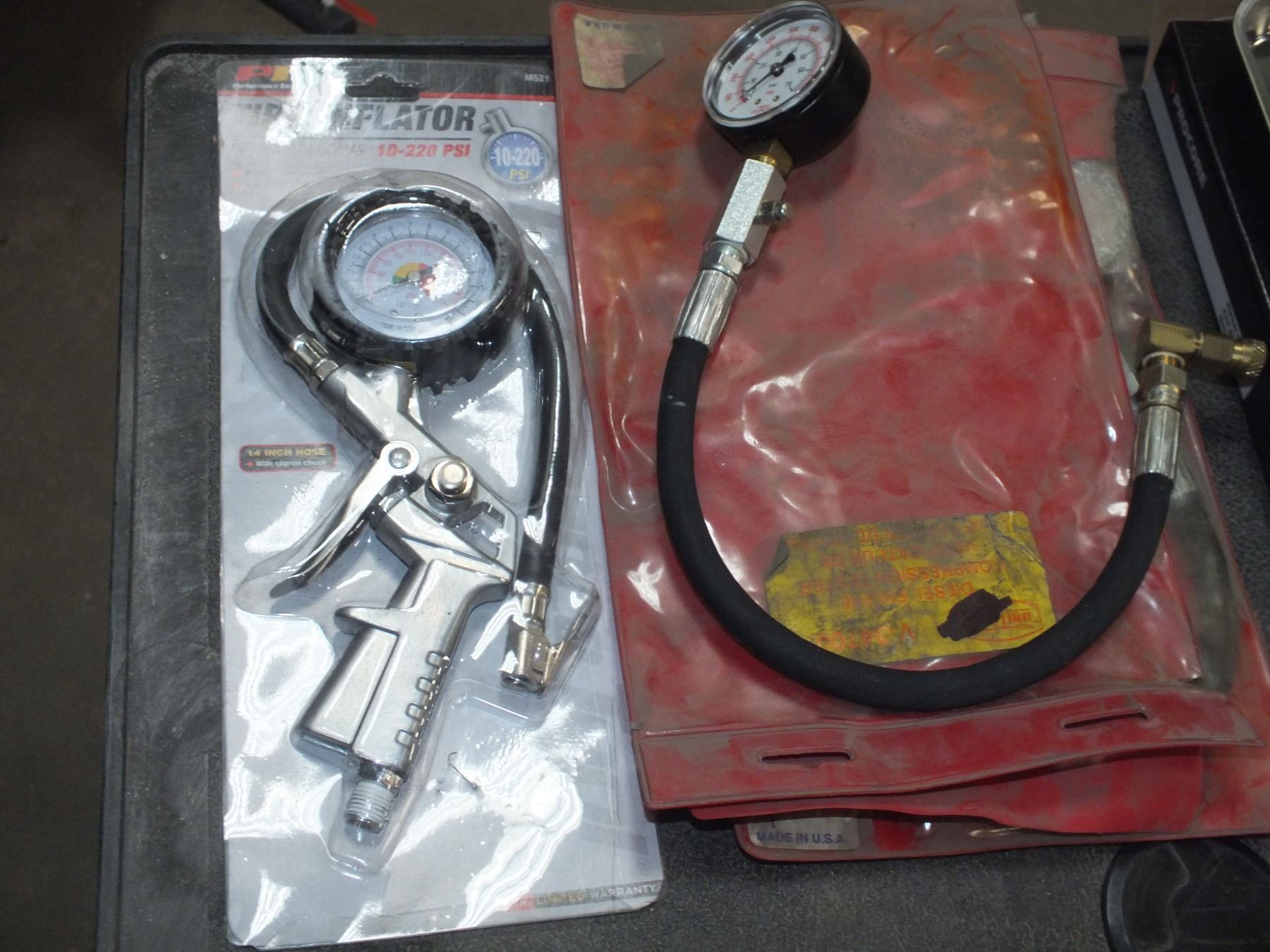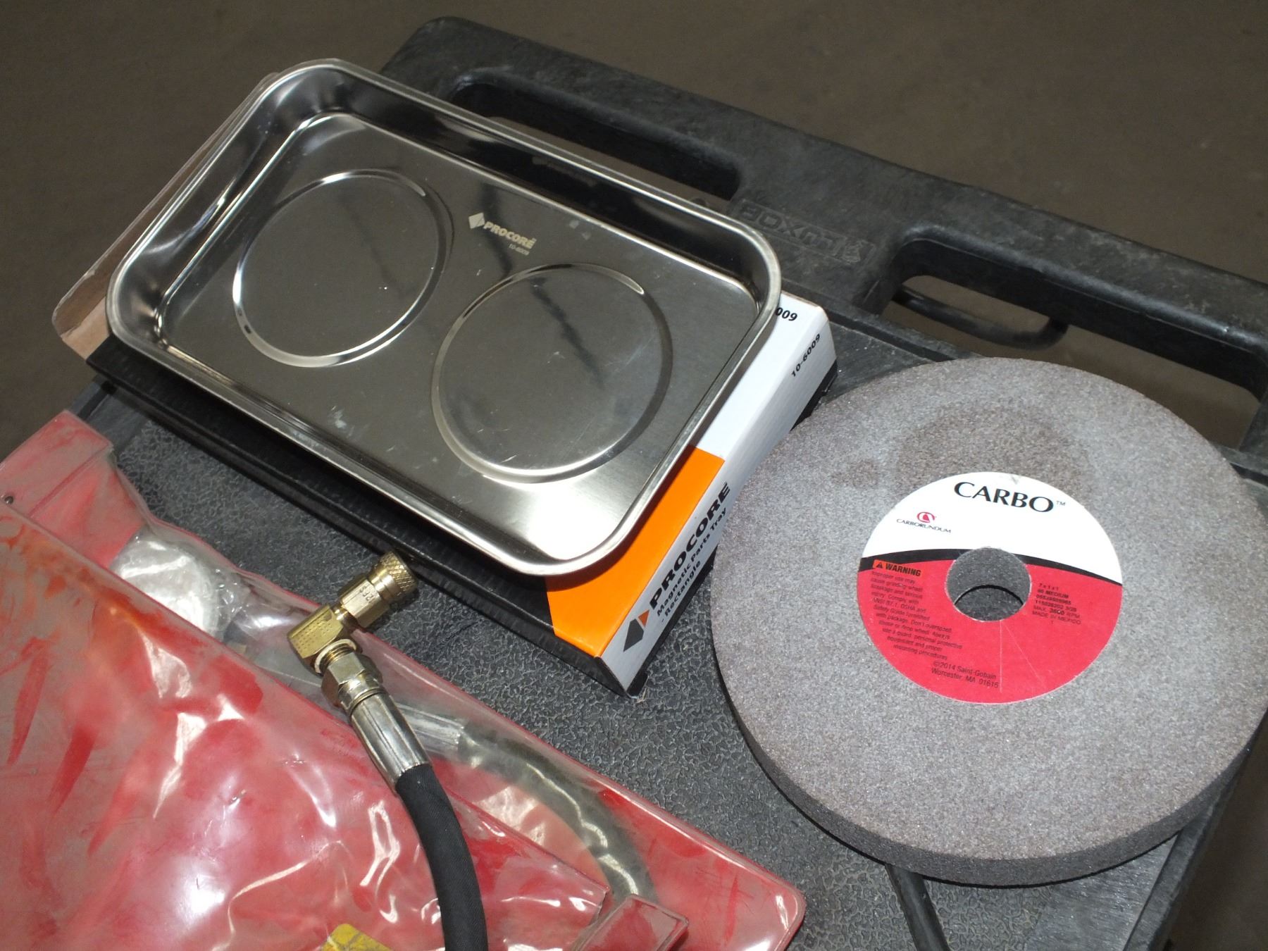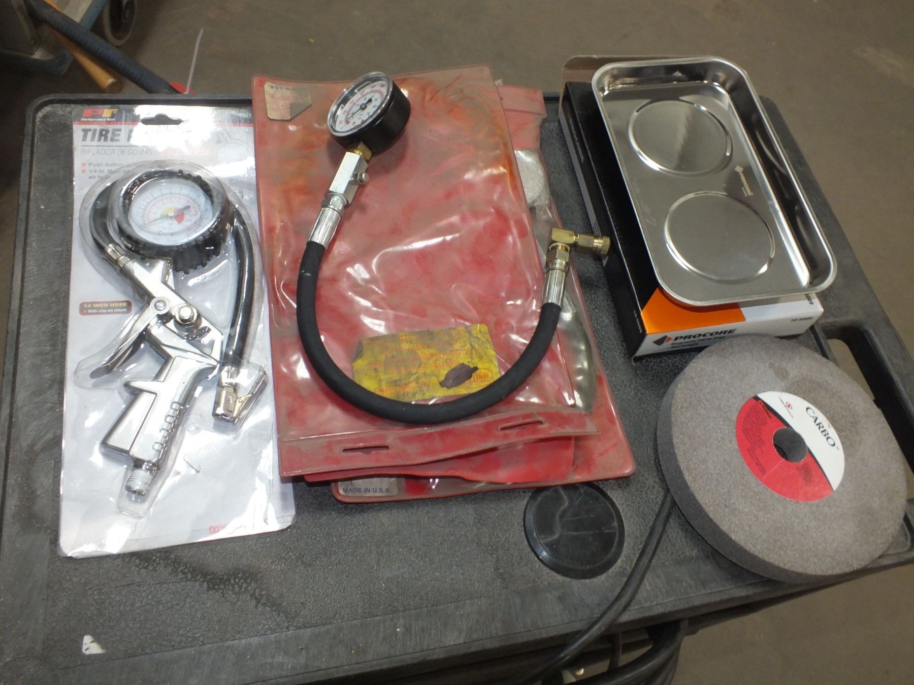 you get it all for one money, magnetic parts tray, 7x1x1 grinding wheel, tire inflator and 2 compression testers...store returns