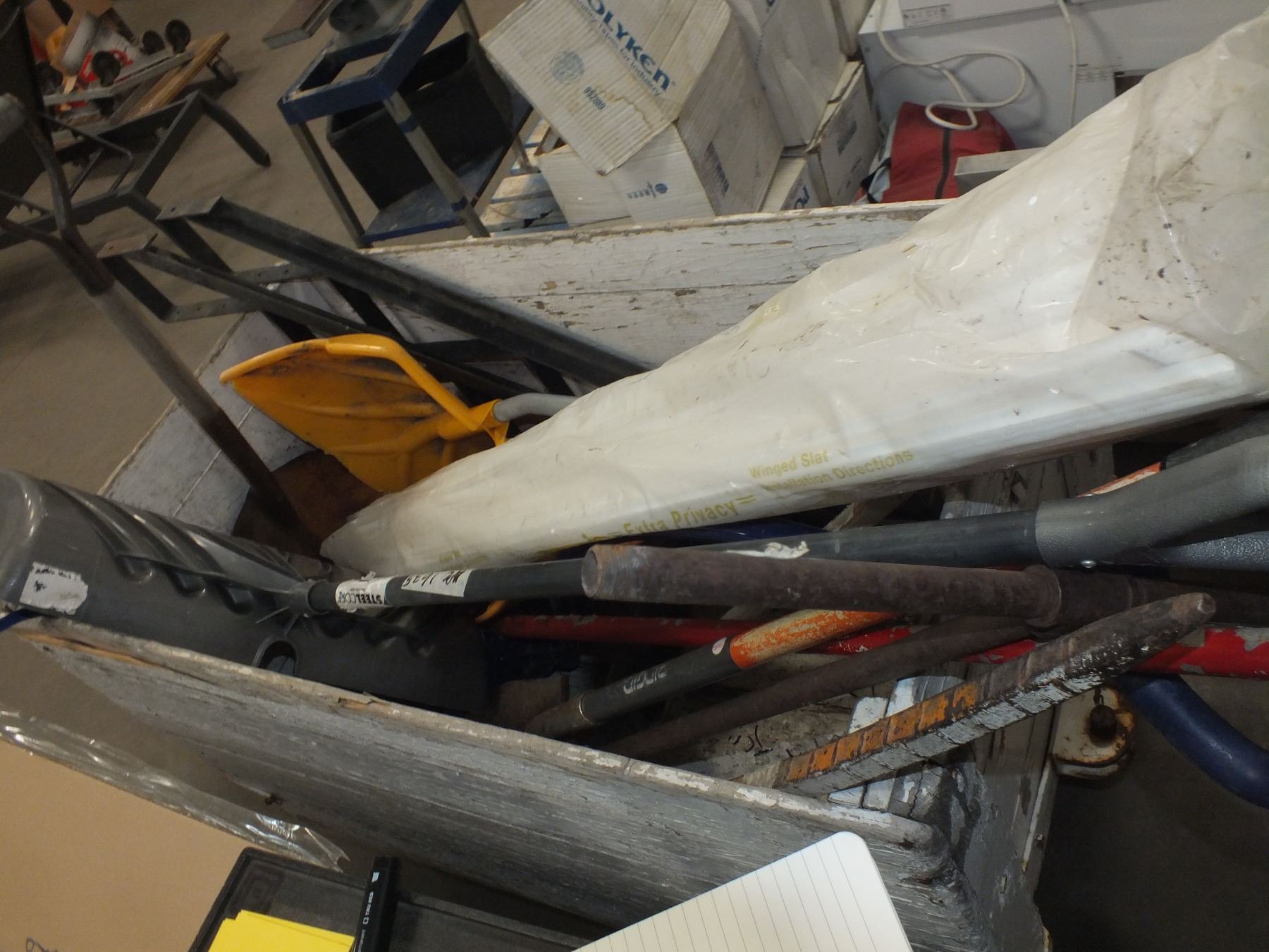 you get it all for one money, snow shovels, plastic fence slats, pry bar, spade shovel, stair frames, post hole digger, you get everything but the white cart...used