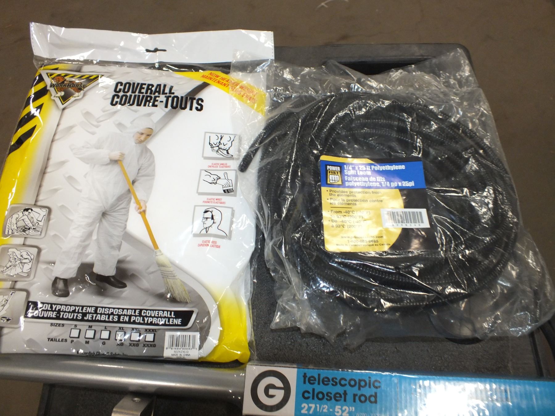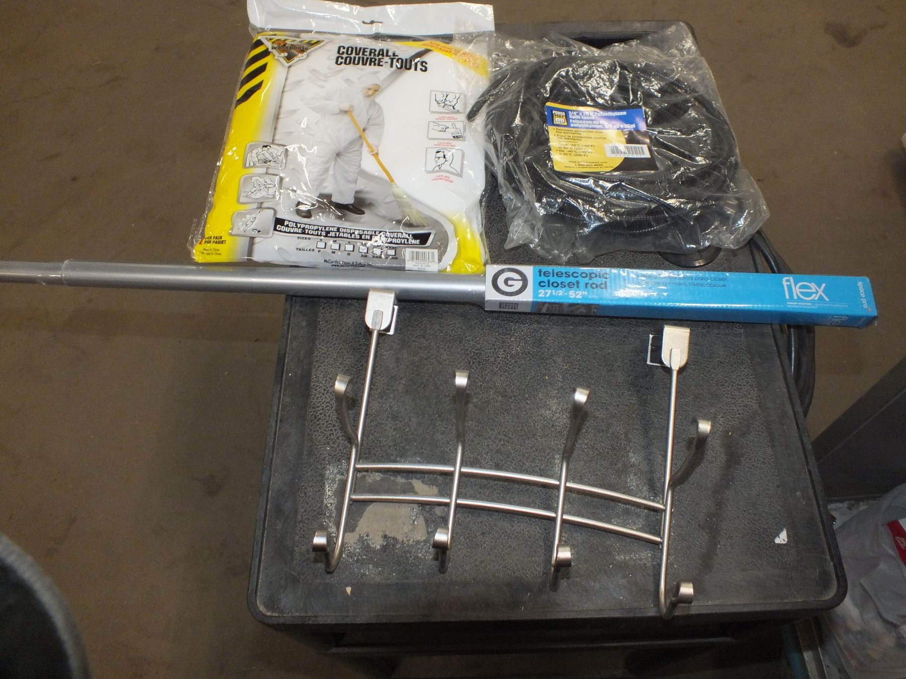 you get it all for one money, disposable coveralls, telescopic shower rod, back of door coat hanger, roll of split loom...new/used