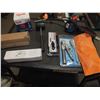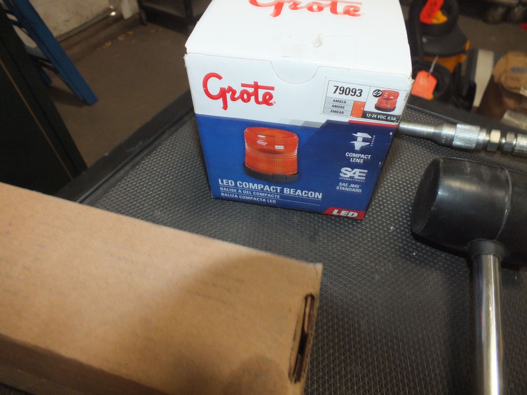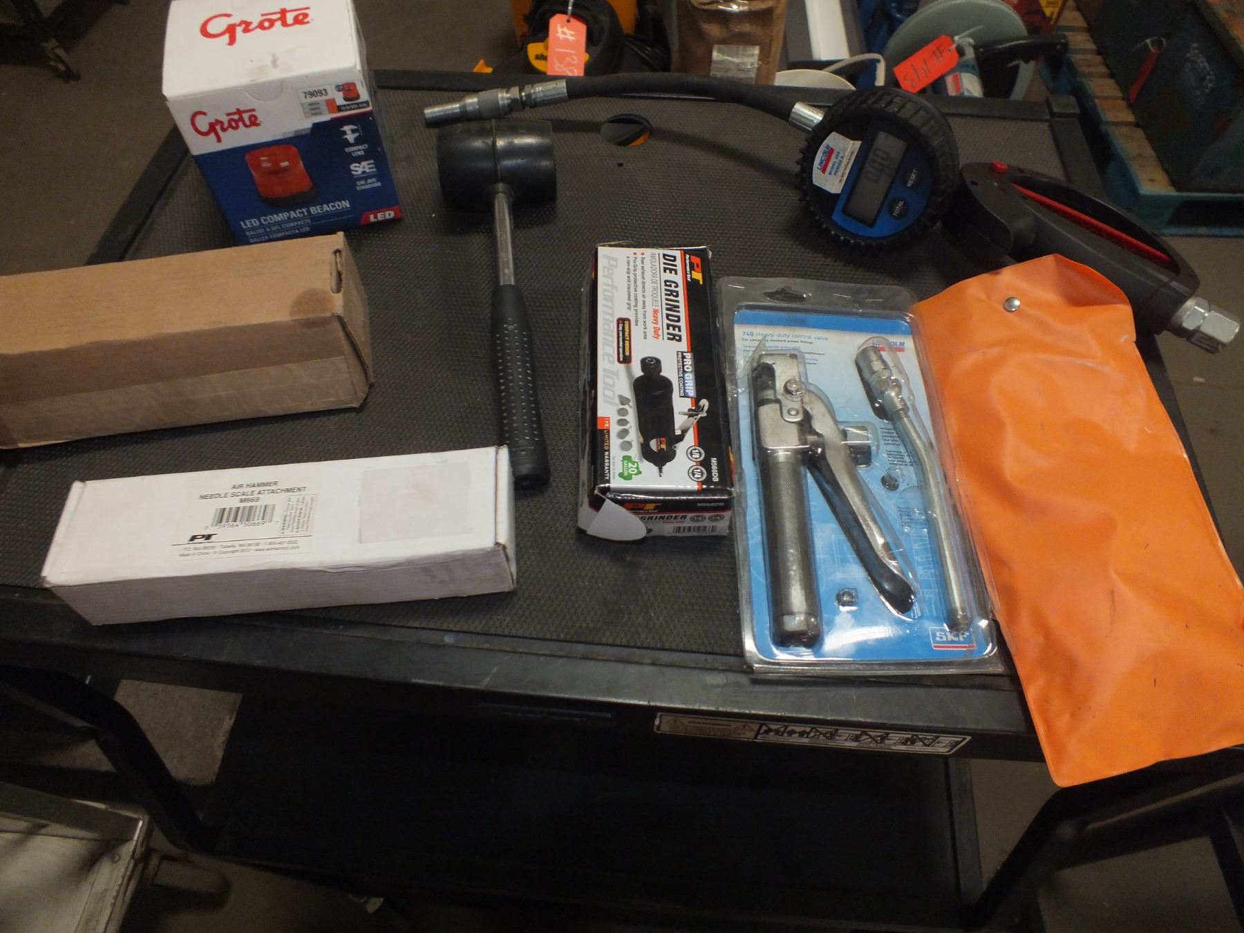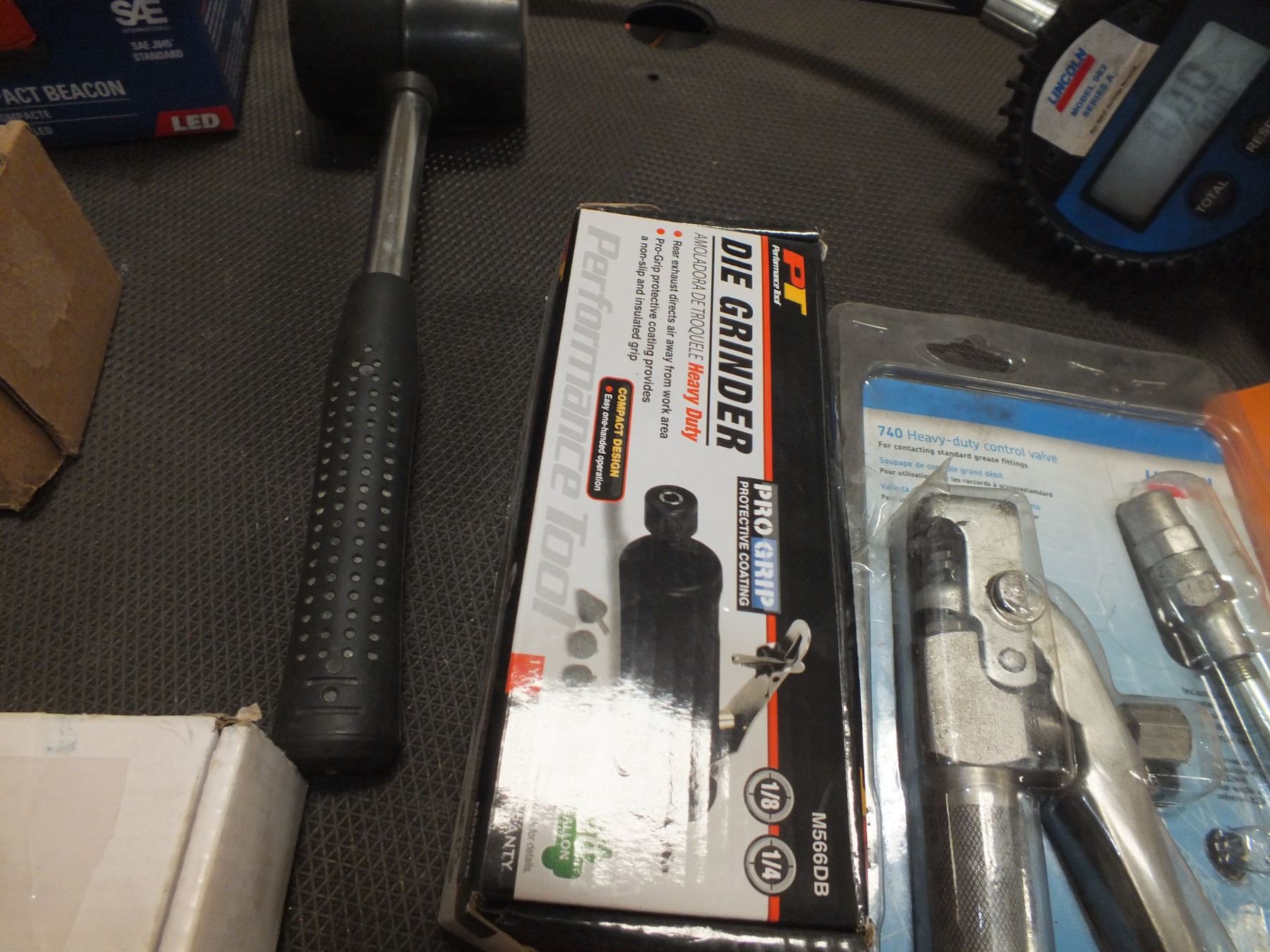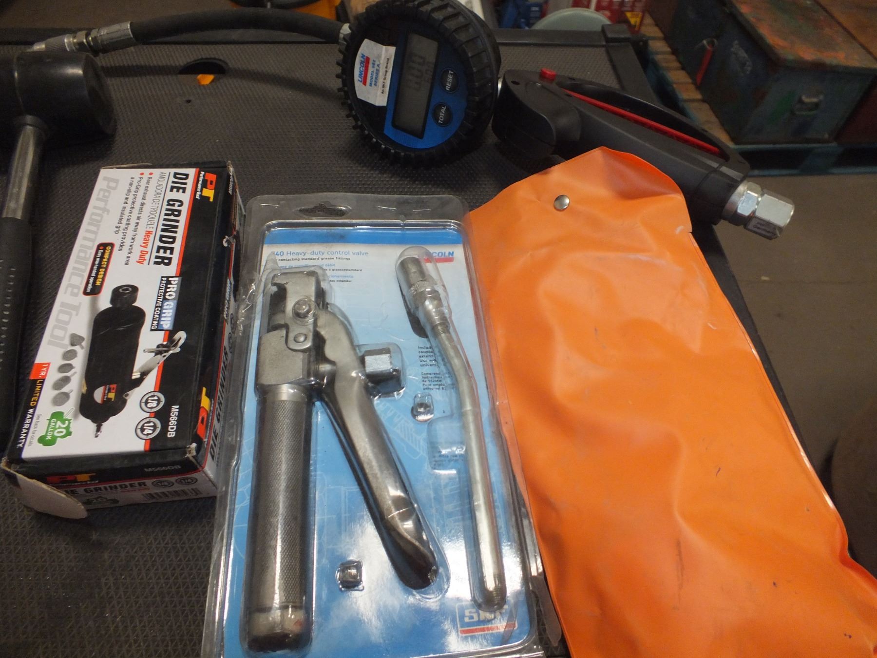 you get it all for one money, small orange beacon light, die grinder, Lincoln digital nozzle, pulling attachment, rubber mallet, heavy duty control valve, air hammer needle scale, ...store returns condition unknown....new/used