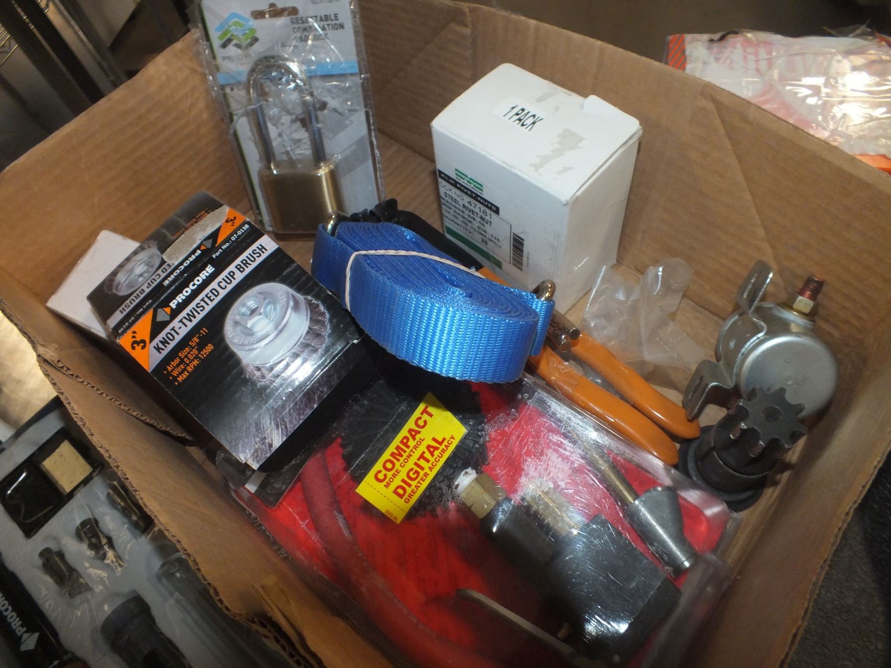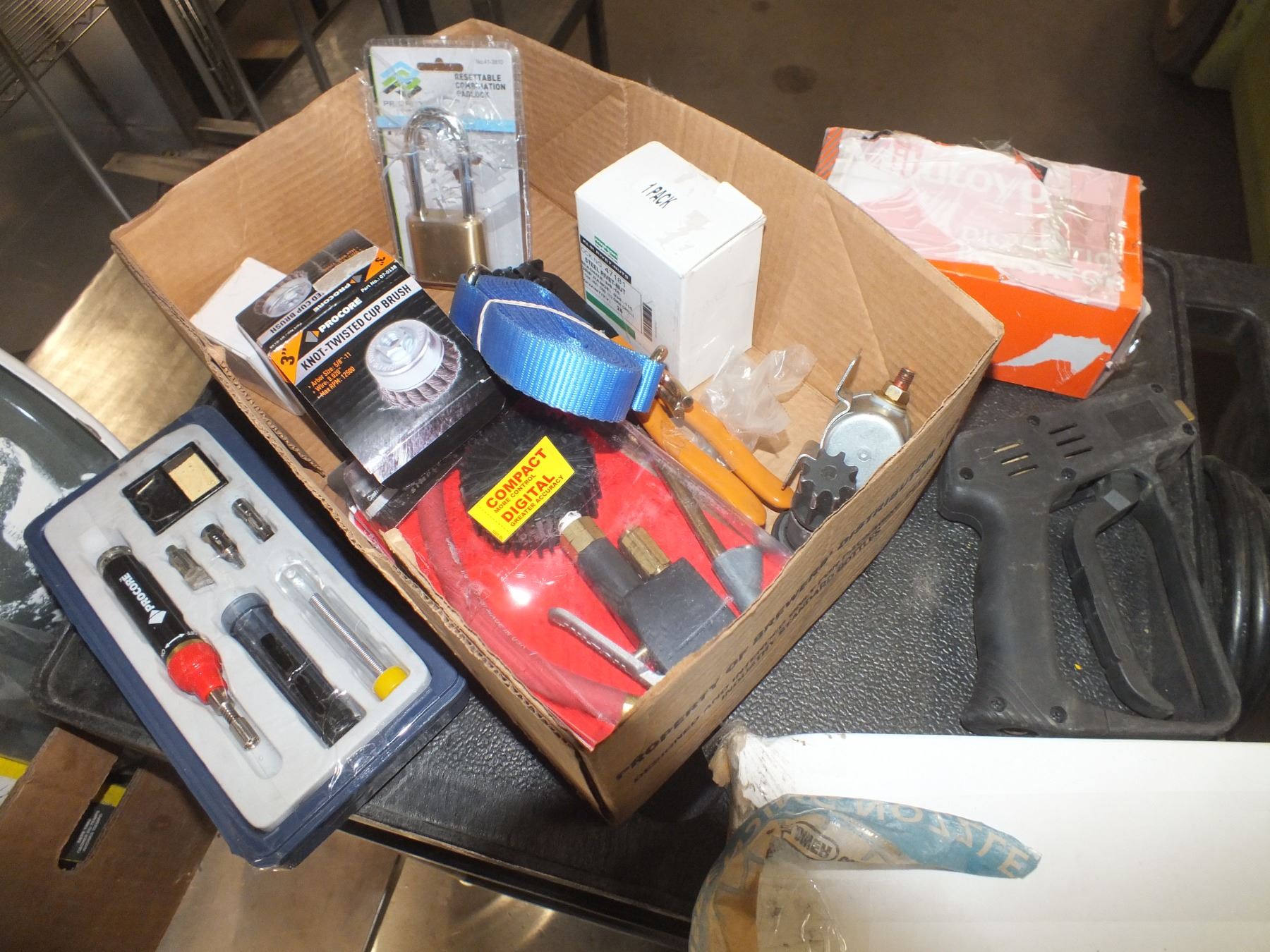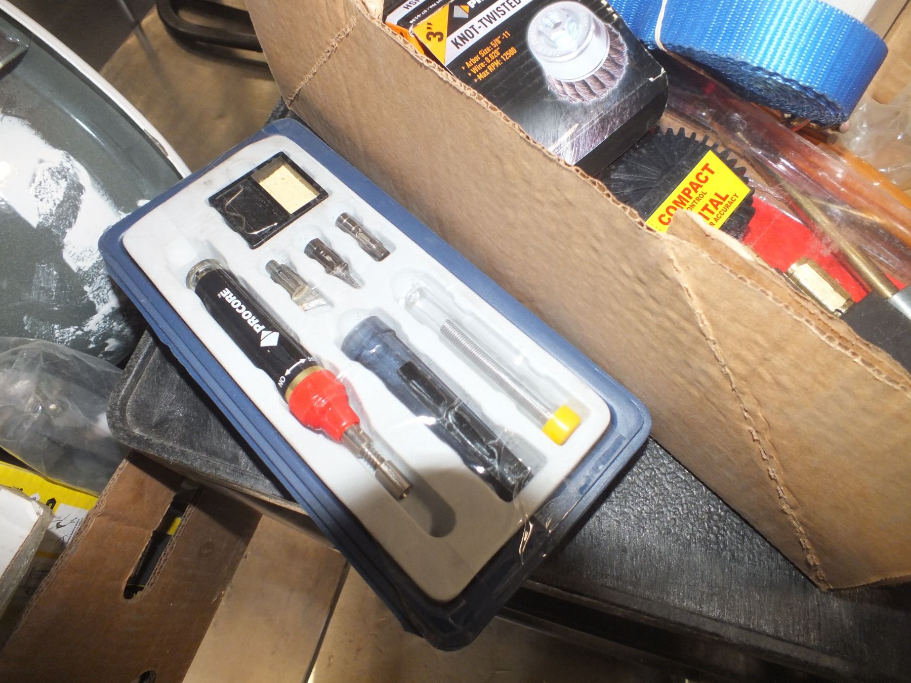 you get it all for one money, soldering iron, paddle lock, crimping tool, air chuck, small strap, 3" wire brush for drill, rivetter, pressure washer gun....store returns....new/used