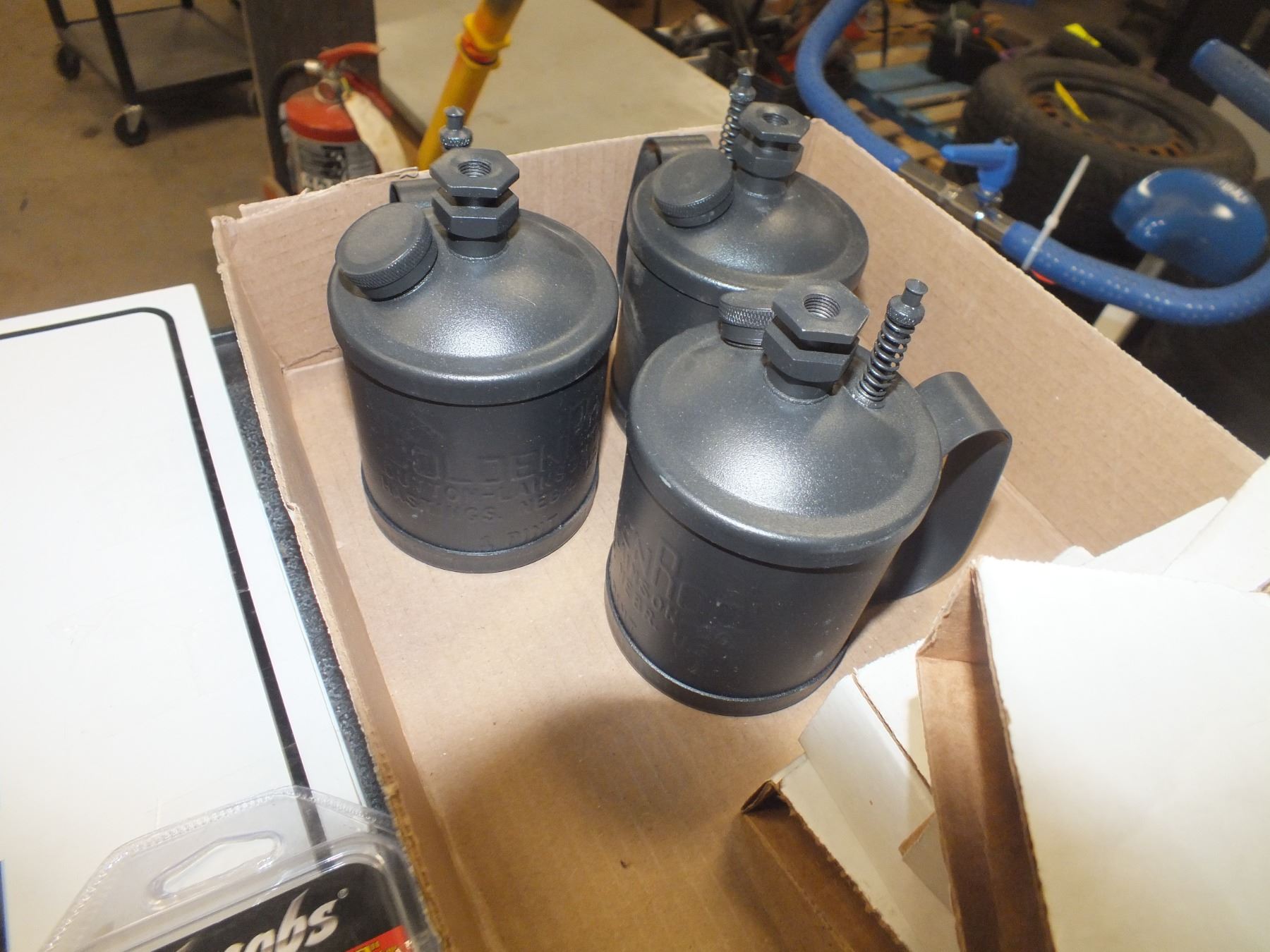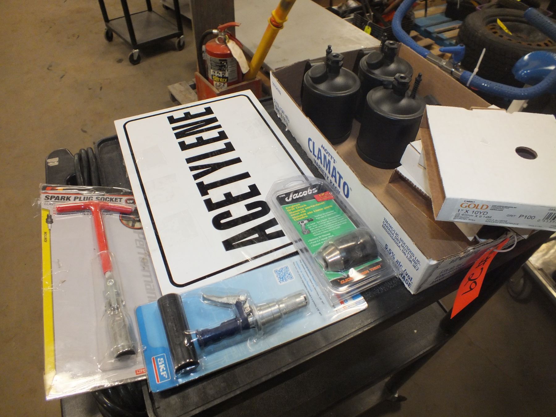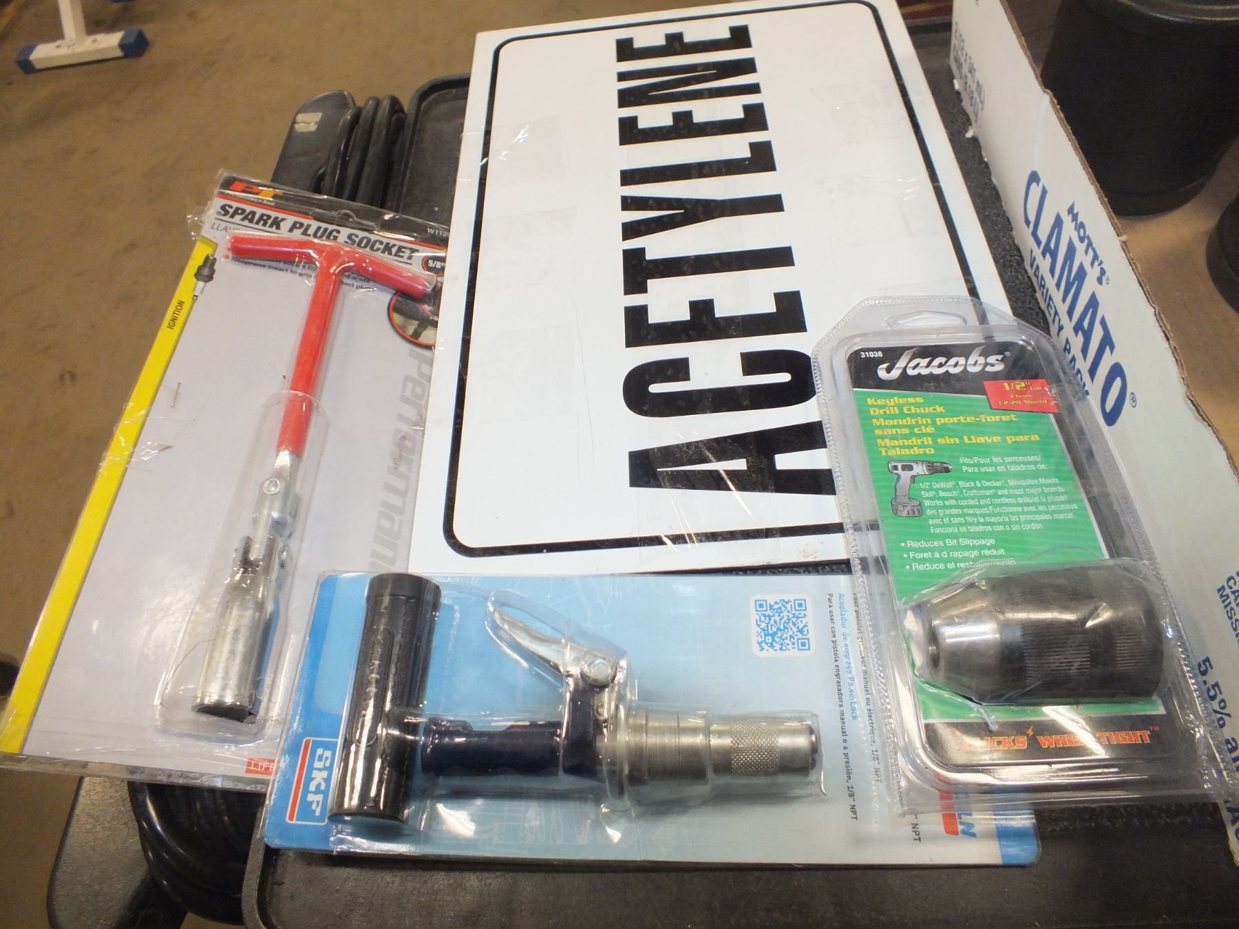 you get 3 oil cans no spouts, 4 boxes of sand paper, spark plug wrench, drill chuck, grease coupler...used