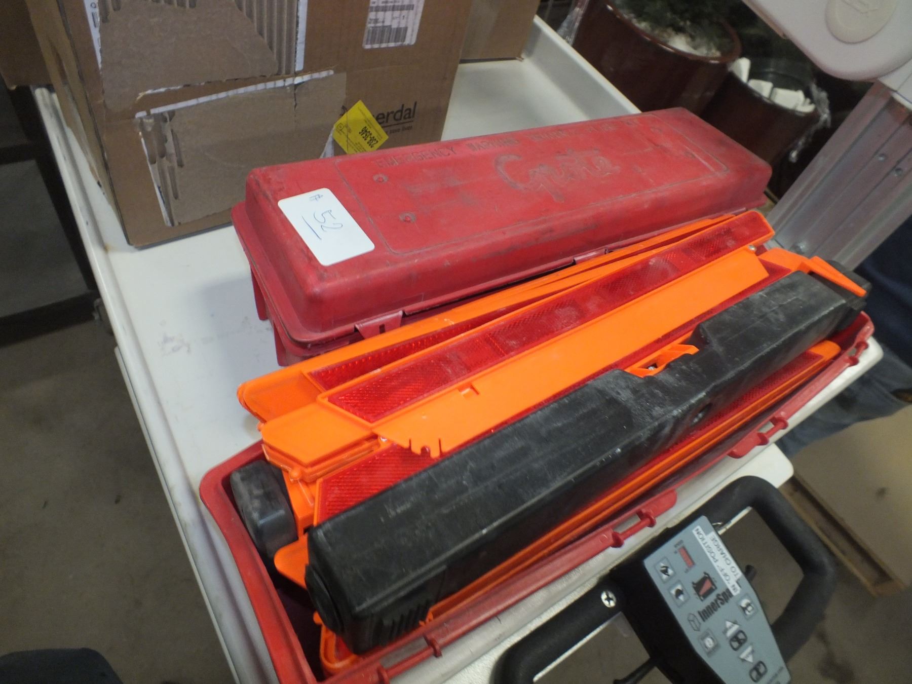 you get roadside triangles, box of flare tubes, and a small box of ice scrapers....used