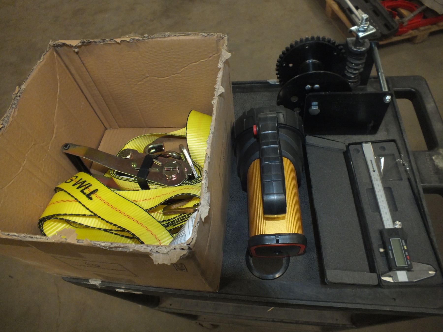 you get all for one money, ratchet tie down strap, flashlight, hand winch no handle, calipers...store returns...