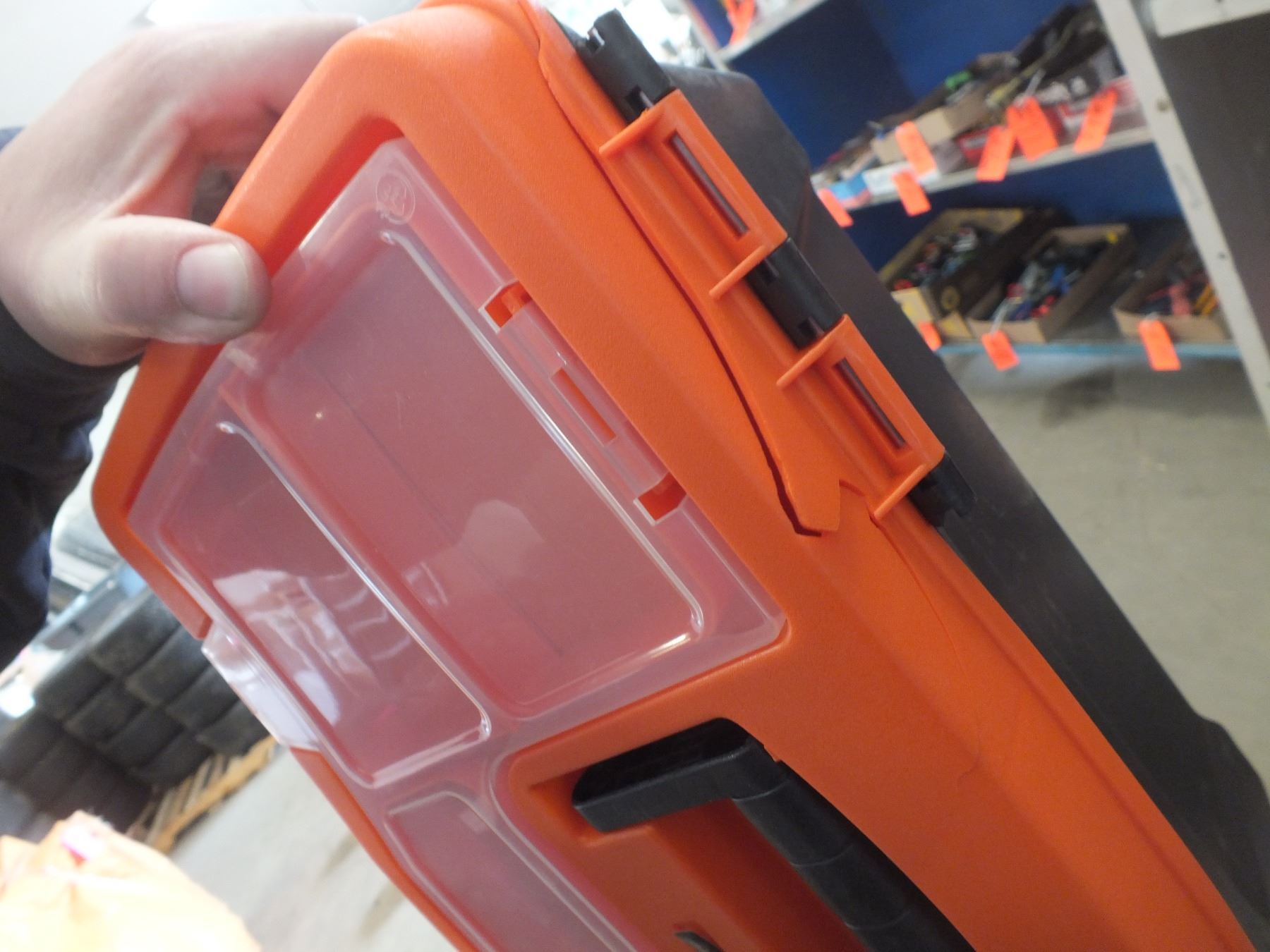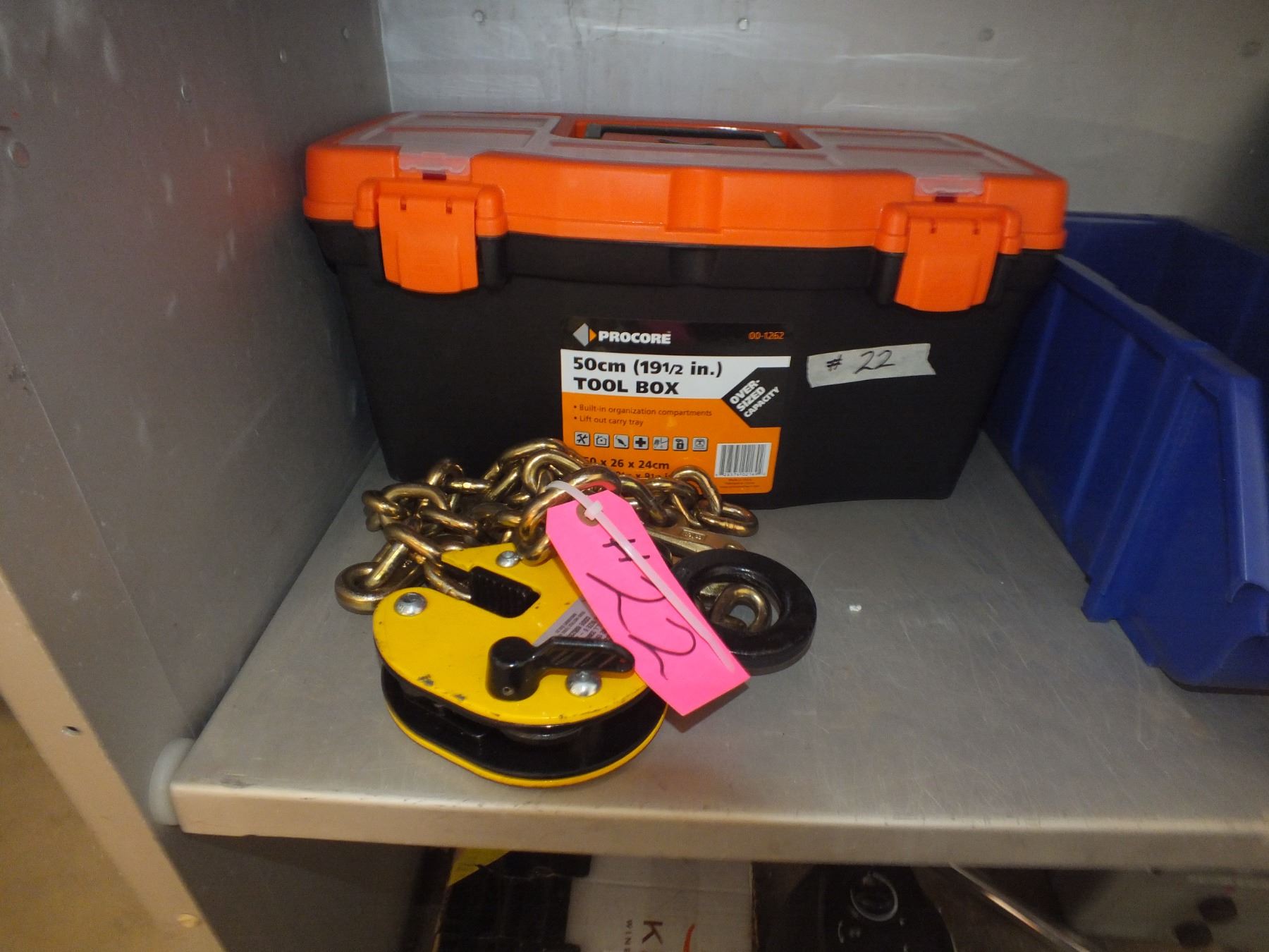 you get a plate clamp, small chain and a tool box, box is damaged...used