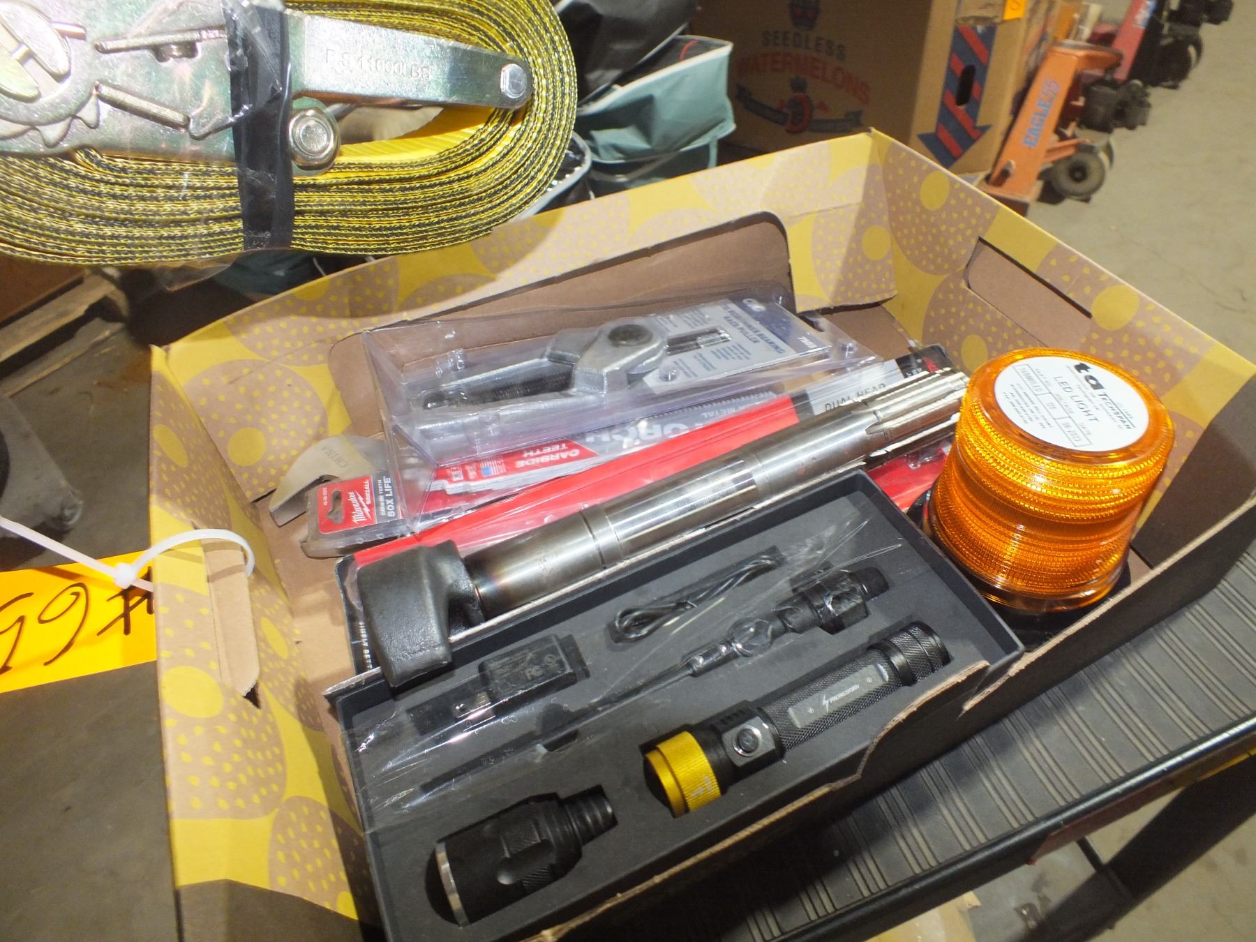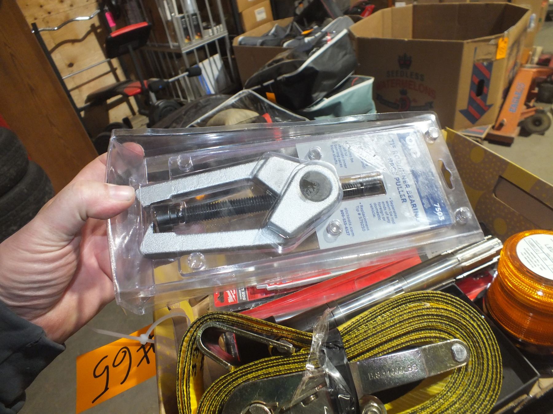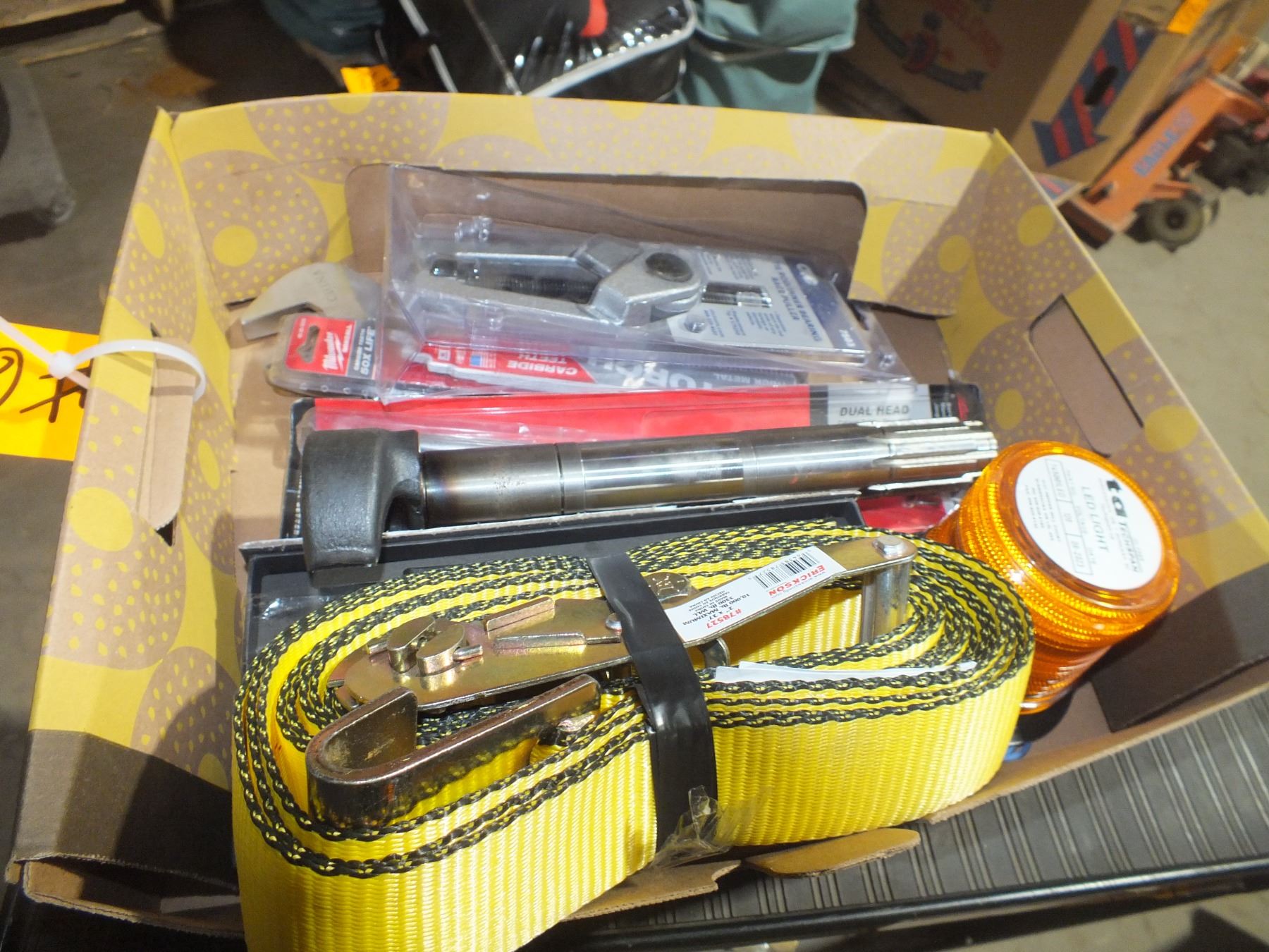 you get beacon light, tie rod inner bearing puller, Sawzall blades, ratchet tie down, flashlight, crescent wrench...used
