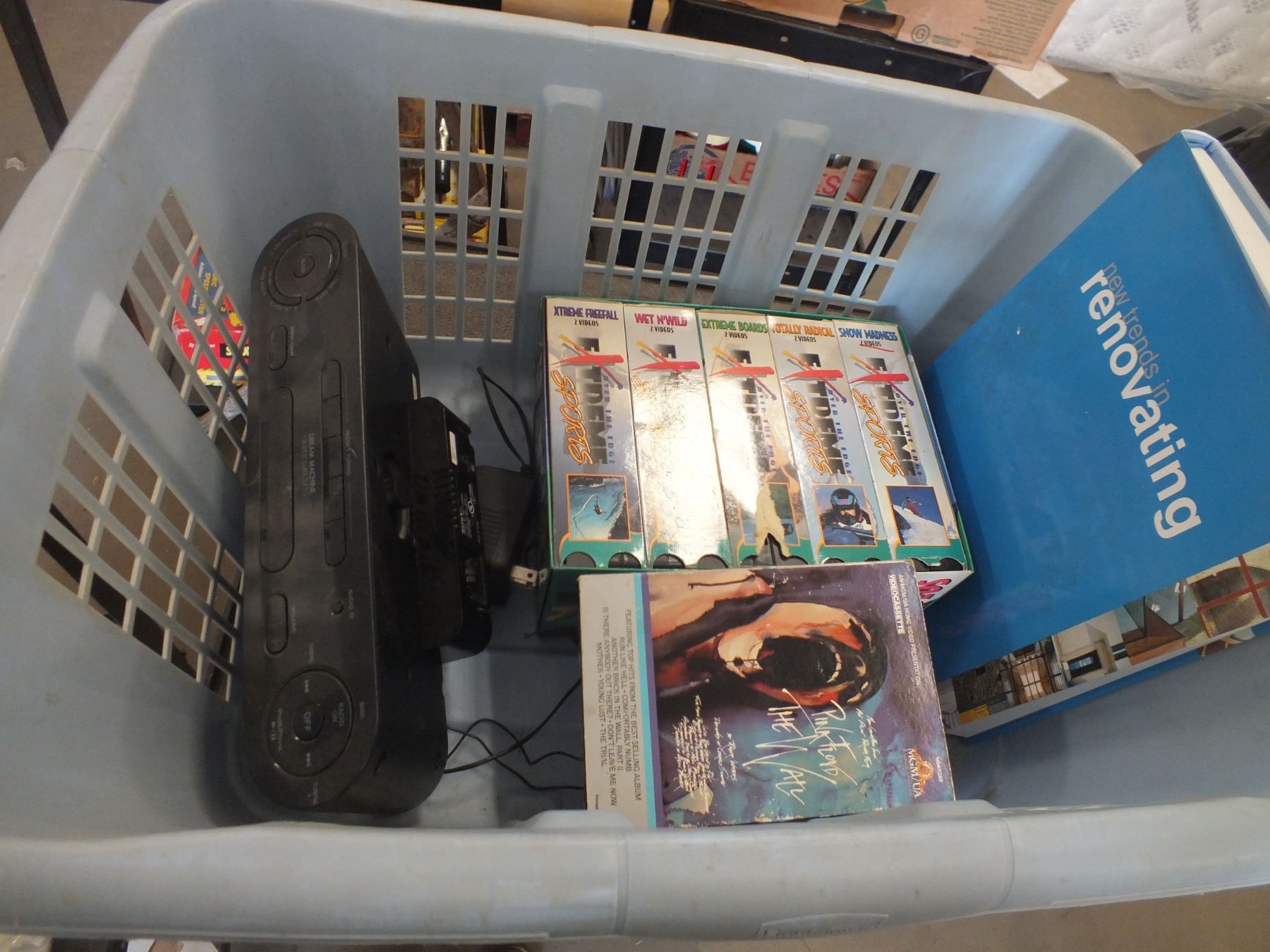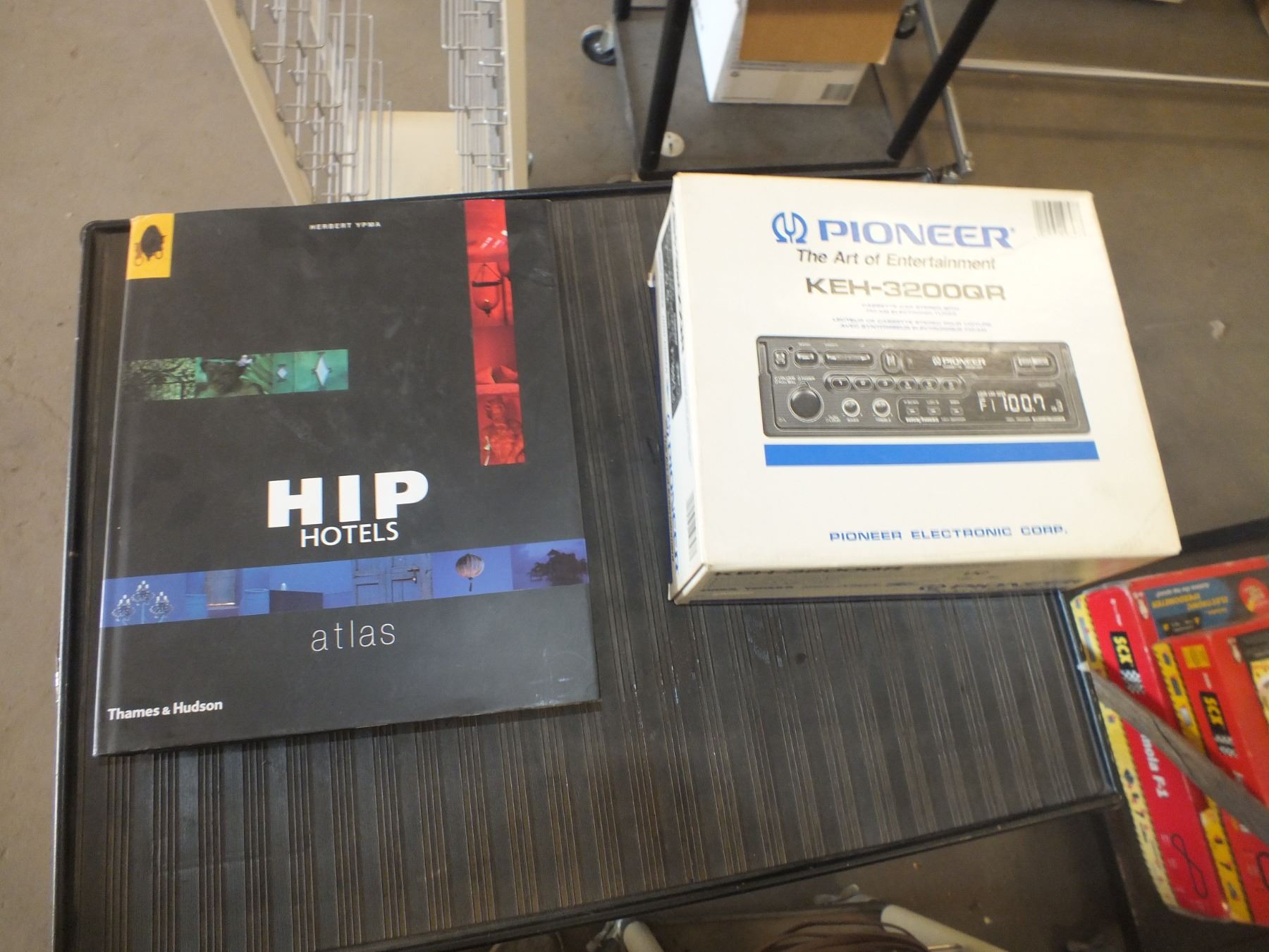 you get books, VHS tapes, Pioneer Cassette car Deck, and a Sony docking station...used
