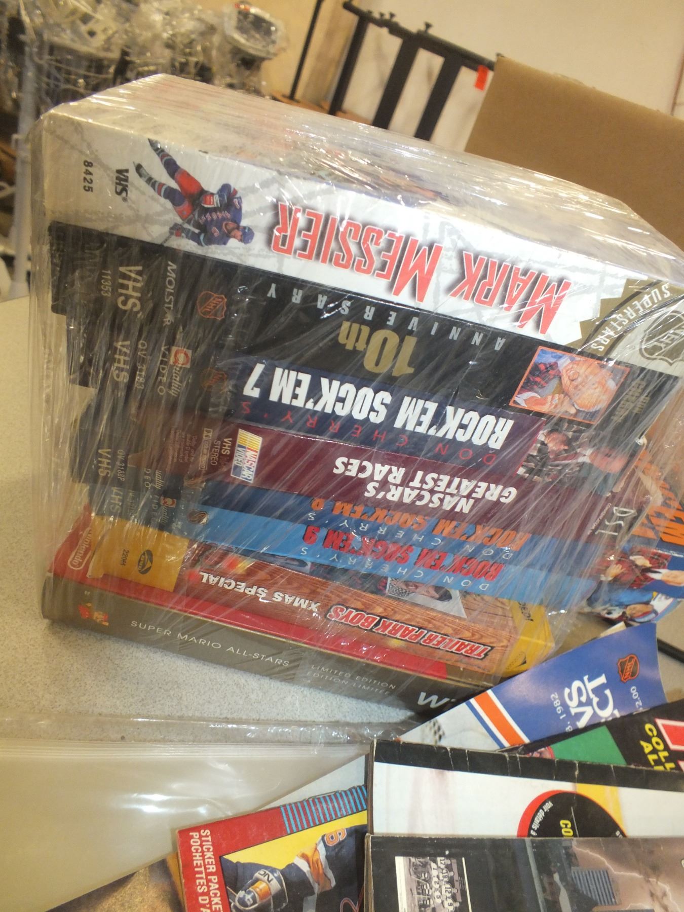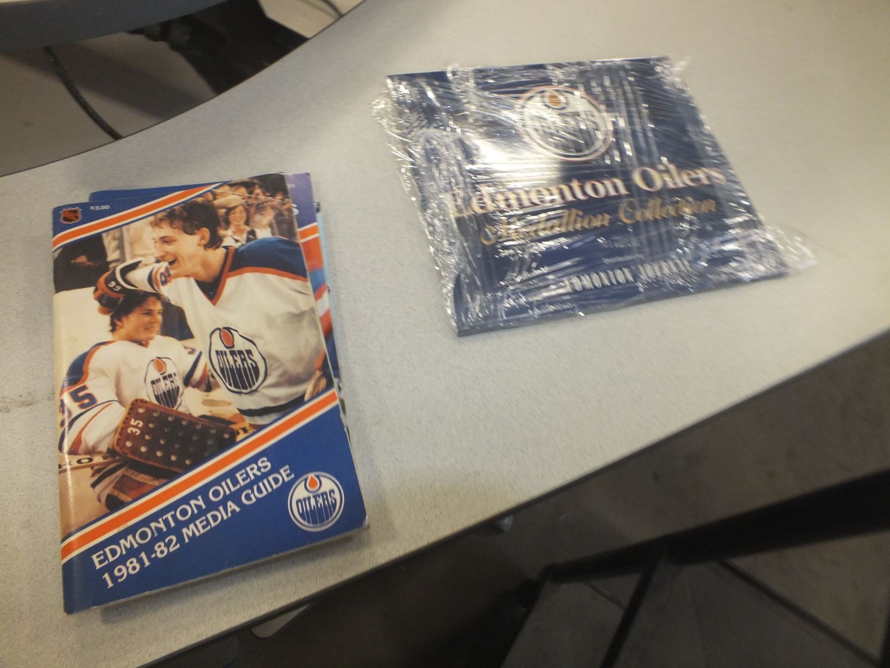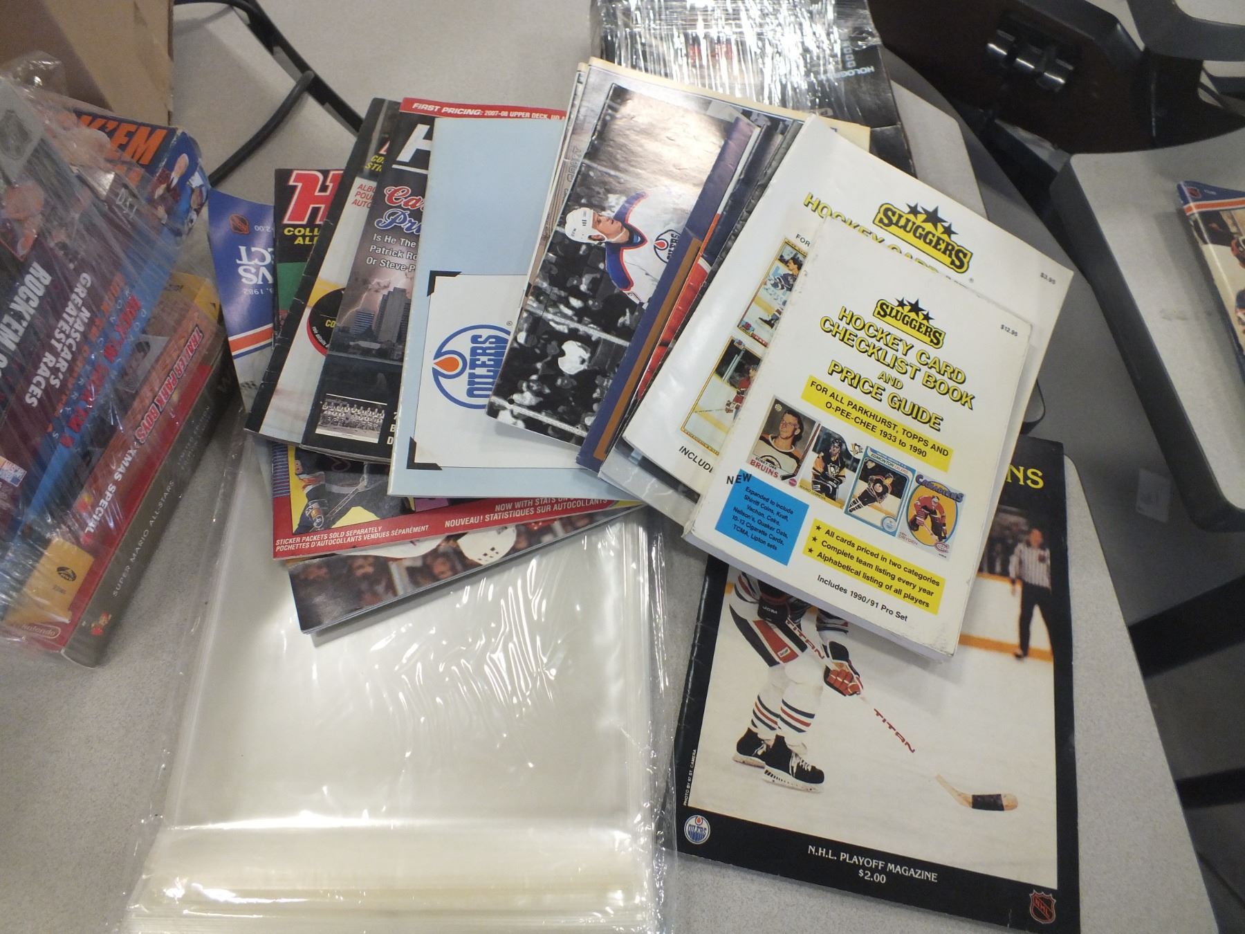 you get assorted hockey magazines, Edmonton oiler calendrers, programs, check lists, assorted nhl hockey movies, magazine sleeves....sold as is / where is...used
