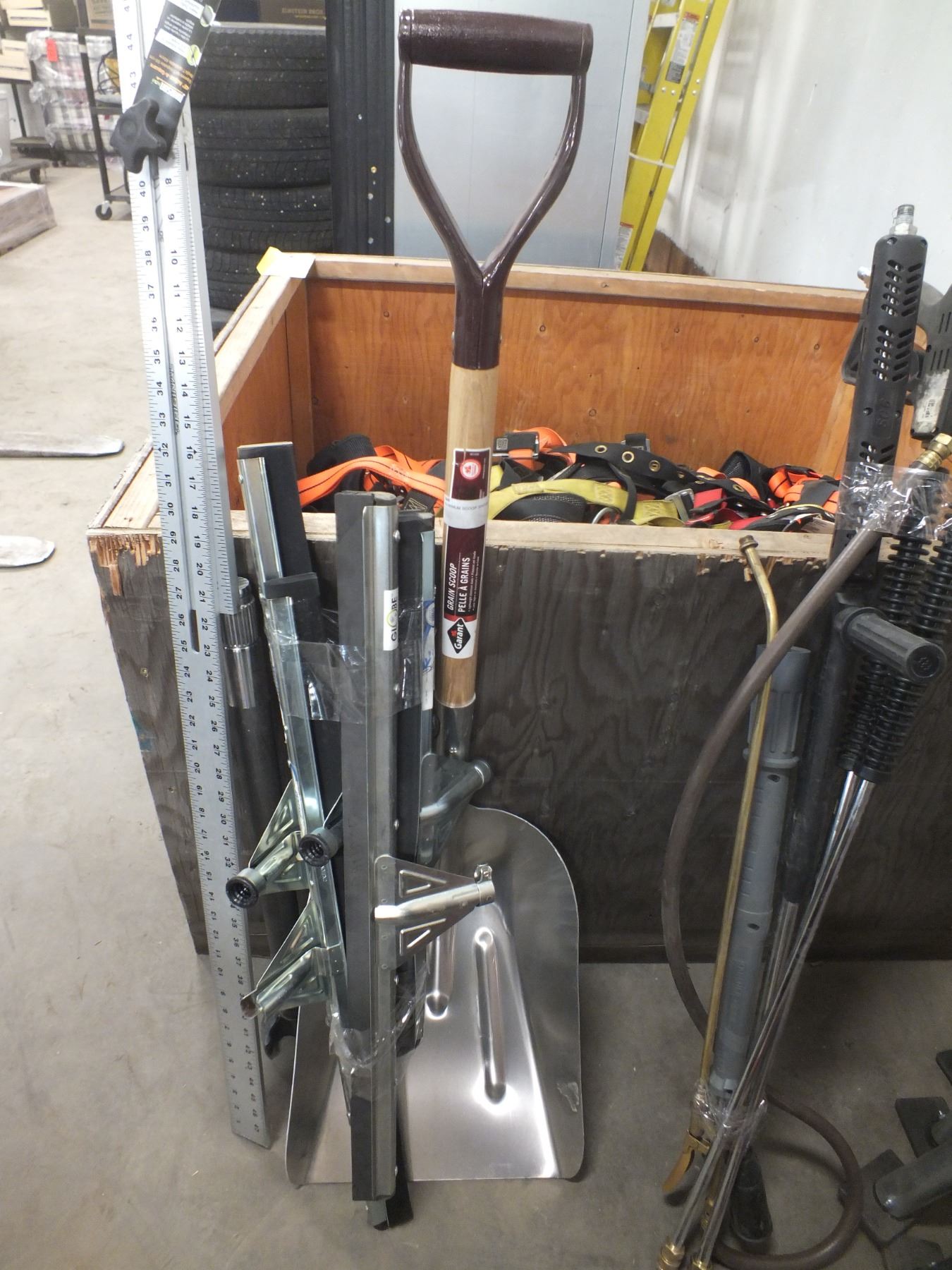 you get a square shovel, five squeegee heads, 1 large bit, 48" drywall square...new/used...sold as is / where is..