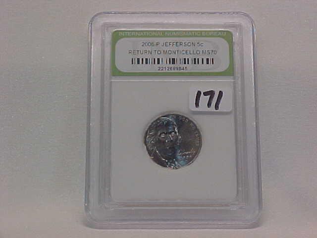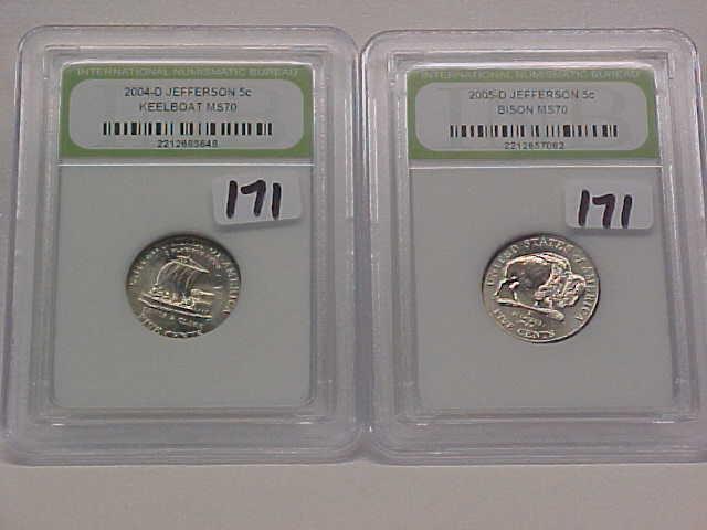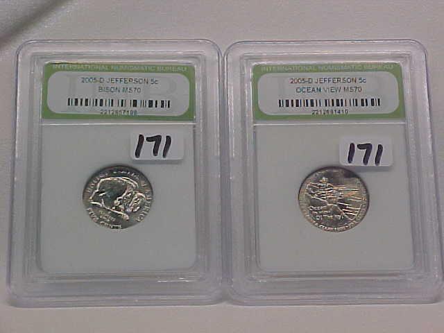 Mix INB Slabs (not sealed): 2 Washington Quarters (81S PF70 Cameo, 87D MS70); 5 Jefferson Nickels all MS70 (04D Boat, 2-05D Bison, 05D Ocean, 06 Monticello)