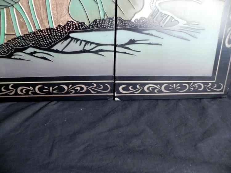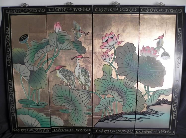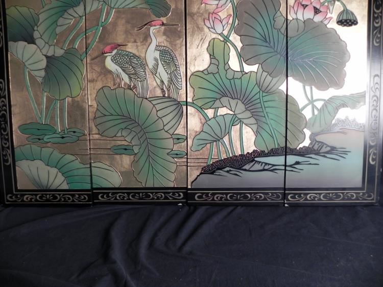 We are offering this 4 piece set of wall art. It seems to be Asian in style, and it is mixed media with it being raised on wood. It is unsigned but we believe it is at least 50 years old. Any of the 4 pieces could easily stand alone.---Medium: Mixed Media -Image Size: 12" x 36" each, 48" x 36" together -Image Condition: Good, Some Minor Scratches and Wear -
