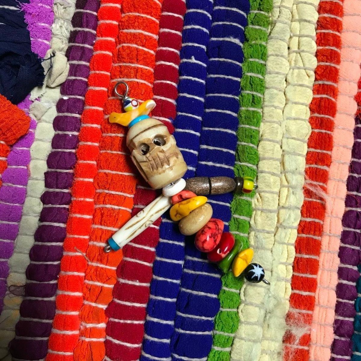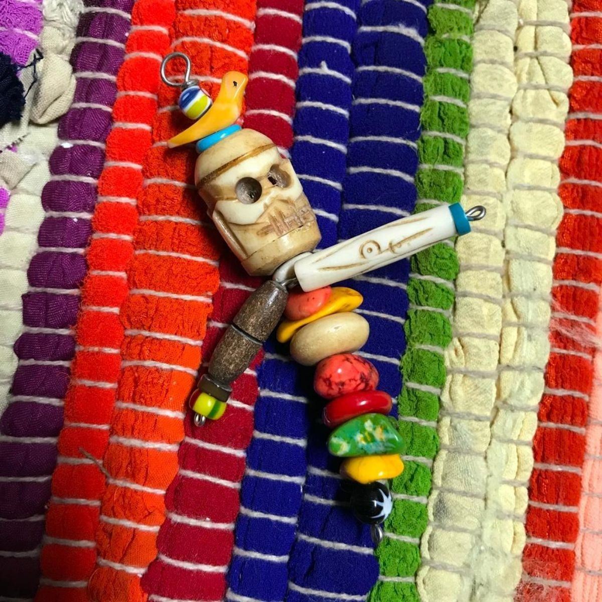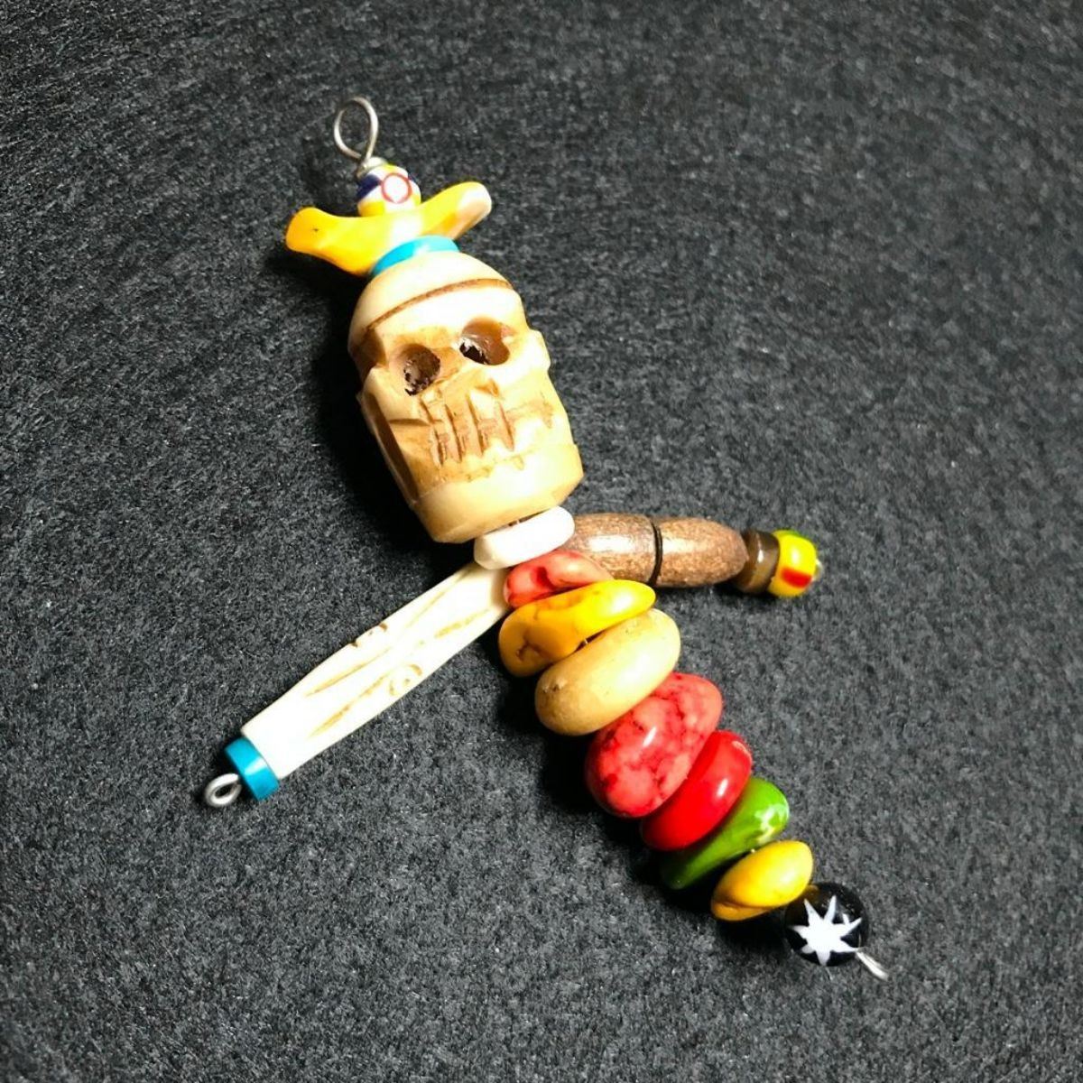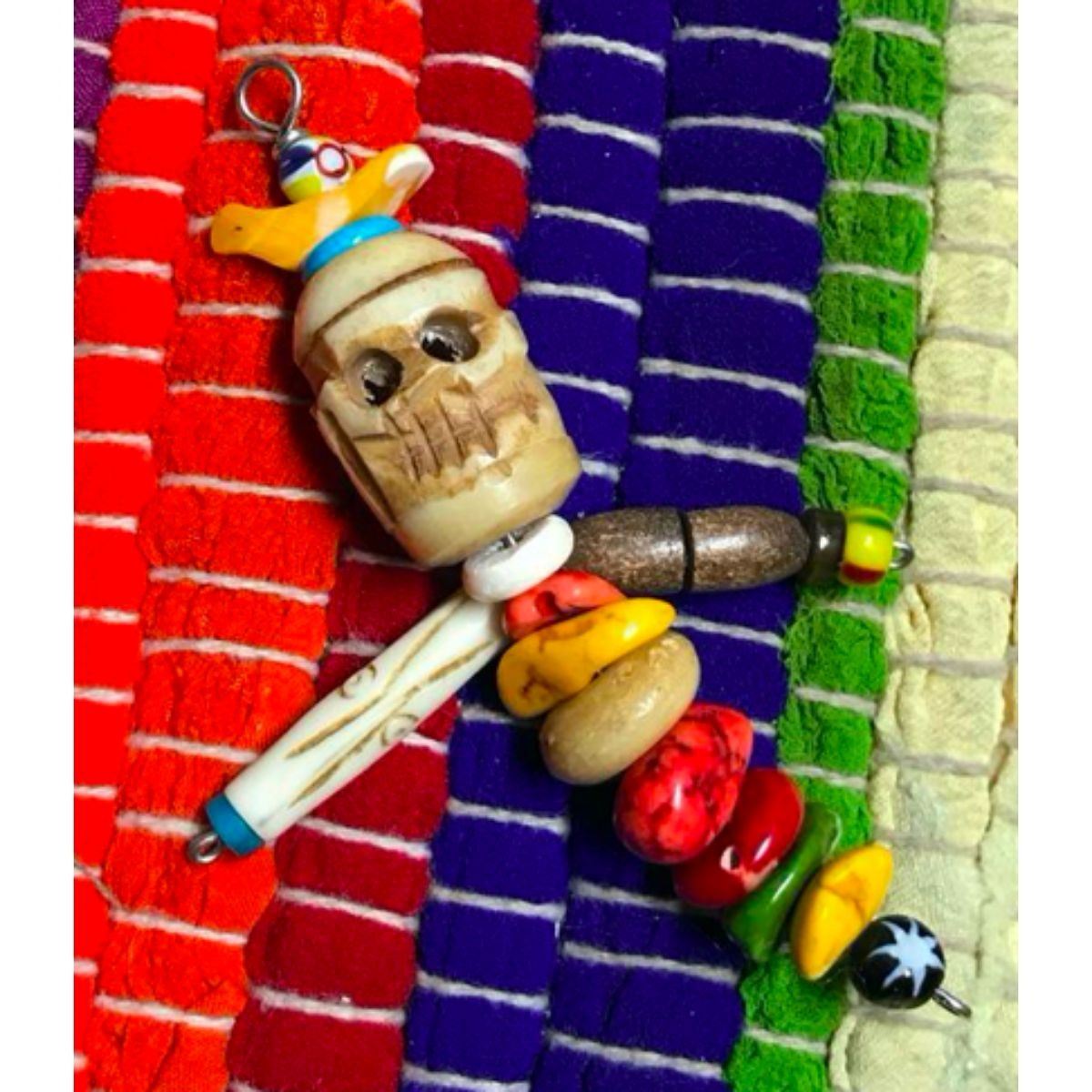 Colorful artisan-made skeleton pendant, created using carved bone, wood, glass & polished, dyed rocks. 3 1/4" L X 2 1/4" W. Â