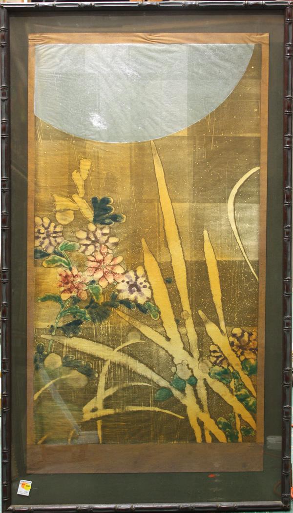Framed mixed media on paper, Asian Floral Landscape, 1977, by Martin Green (American, 20th Century), signed and dated lower right, overall: 61''h x 31''w