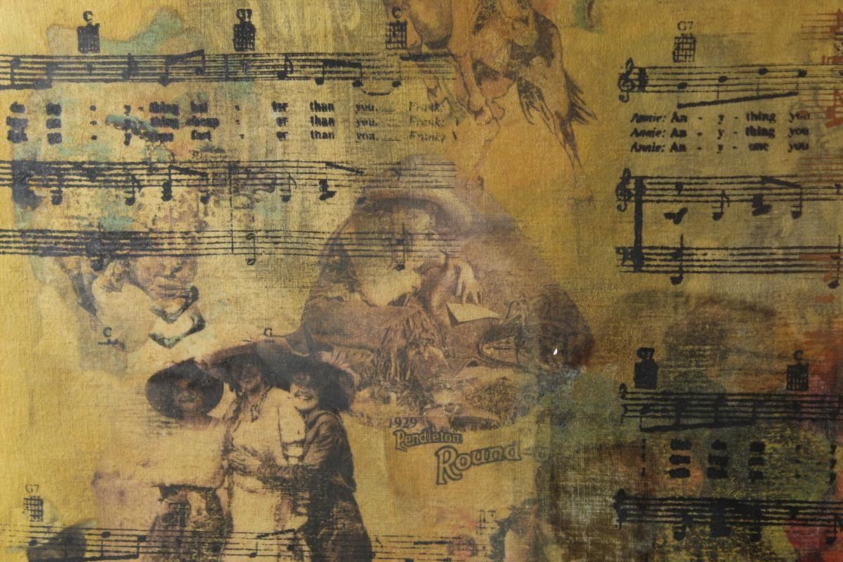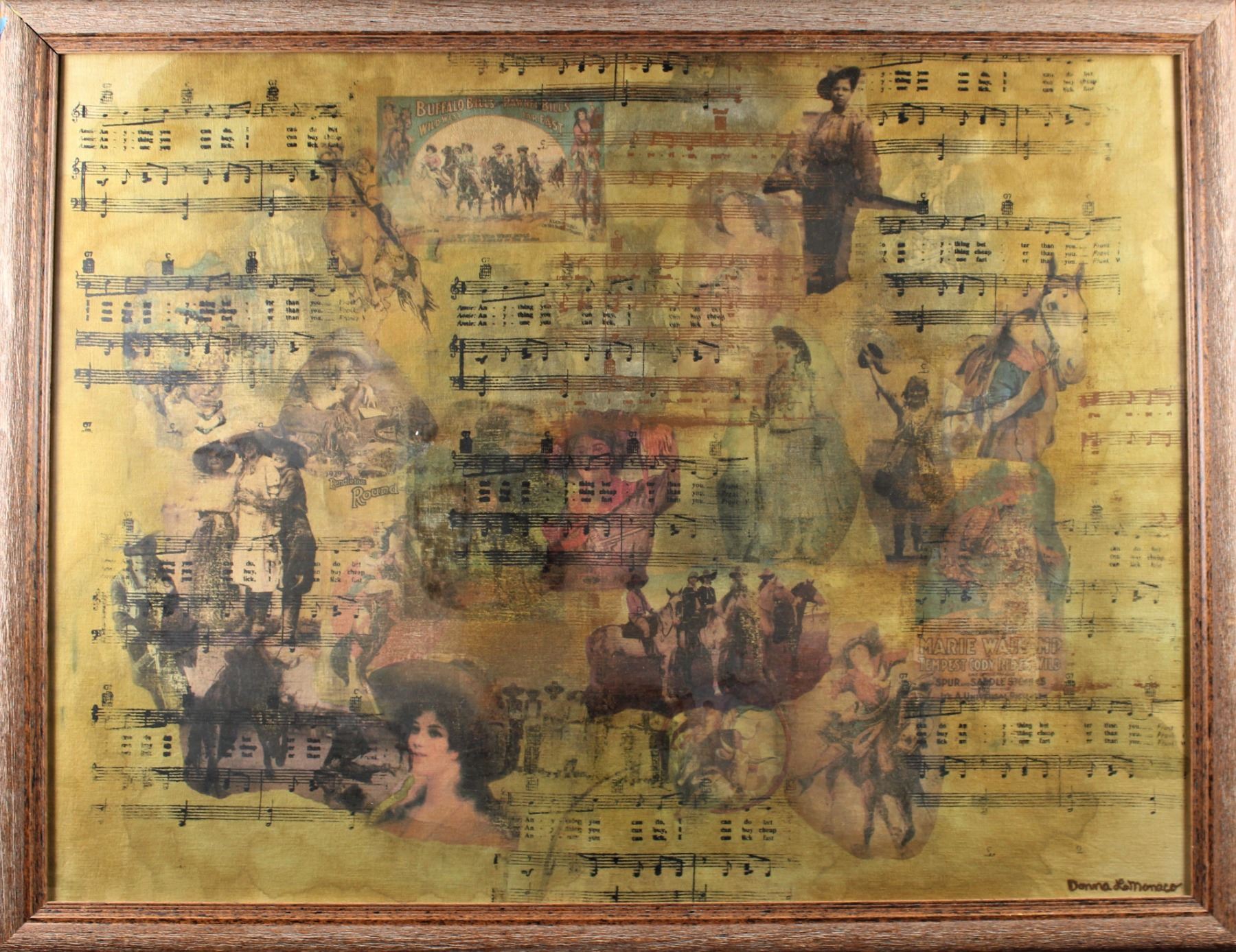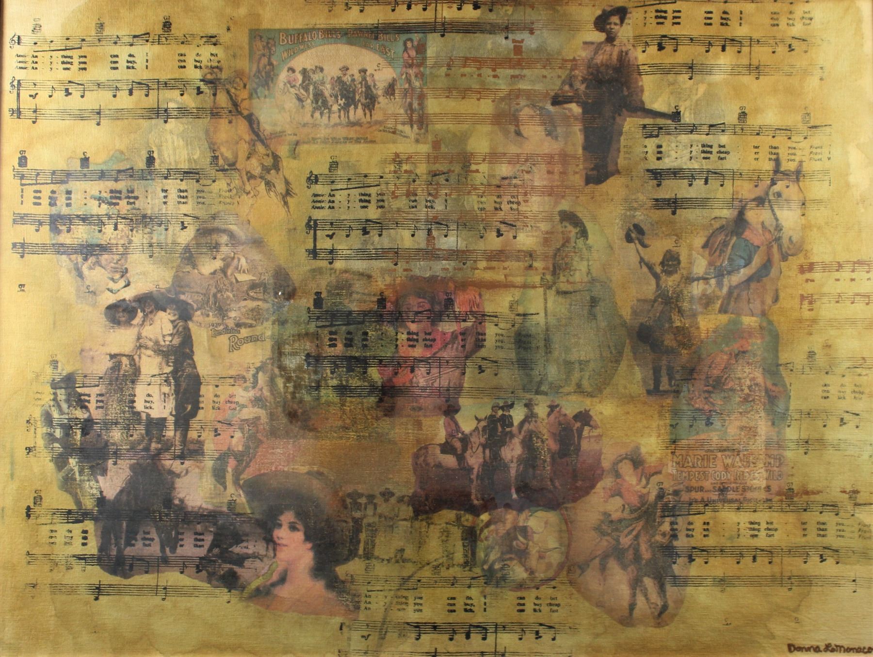 Fun montage consisting of images of Buffalo Bill's Wild West and figures, laid over top of sheet music. Appears to be xylene-transfer printed onto fabric, with watercolor wash. Signed lower right: Donna LoMonaco.
