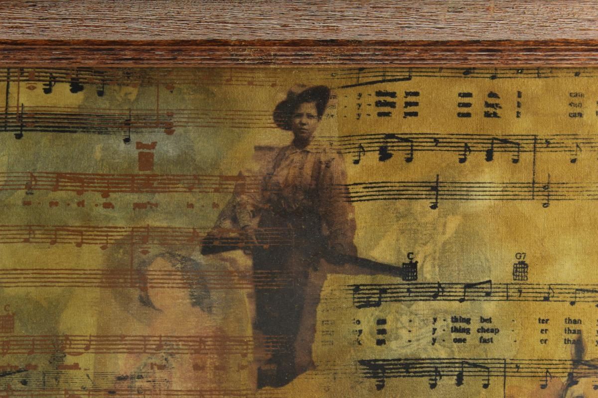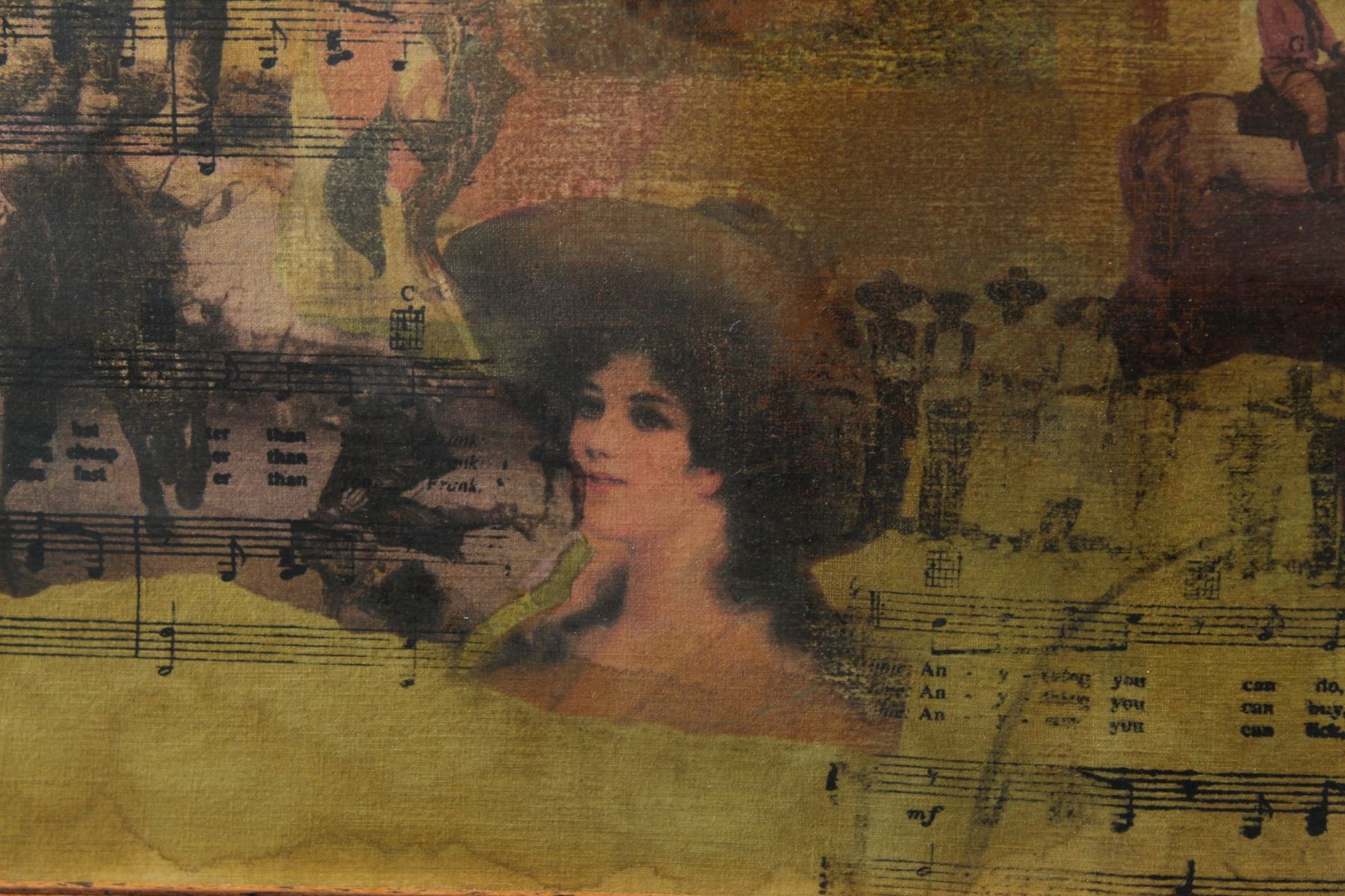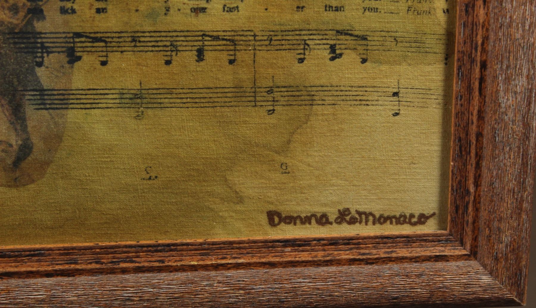 Fun montage consisting of images of Buffalo Bill's Wild West and figures, laid over top of sheet music. Appears to be xylene-transfer printed onto fabric, with watercolor wash. Signed lower right: Donna LoMonaco.