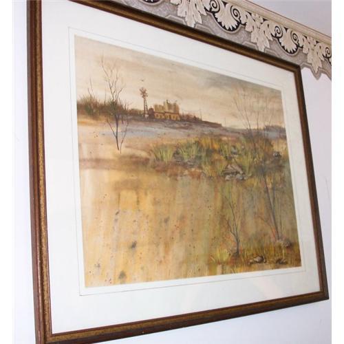 20th Century mixed media artwork. "Swamp with Windmill". Gold leaf wood frame with off white matting behind glass. Signed B. Wypesek. Beautiful!! A-1