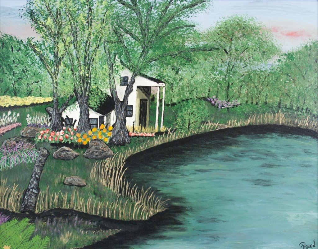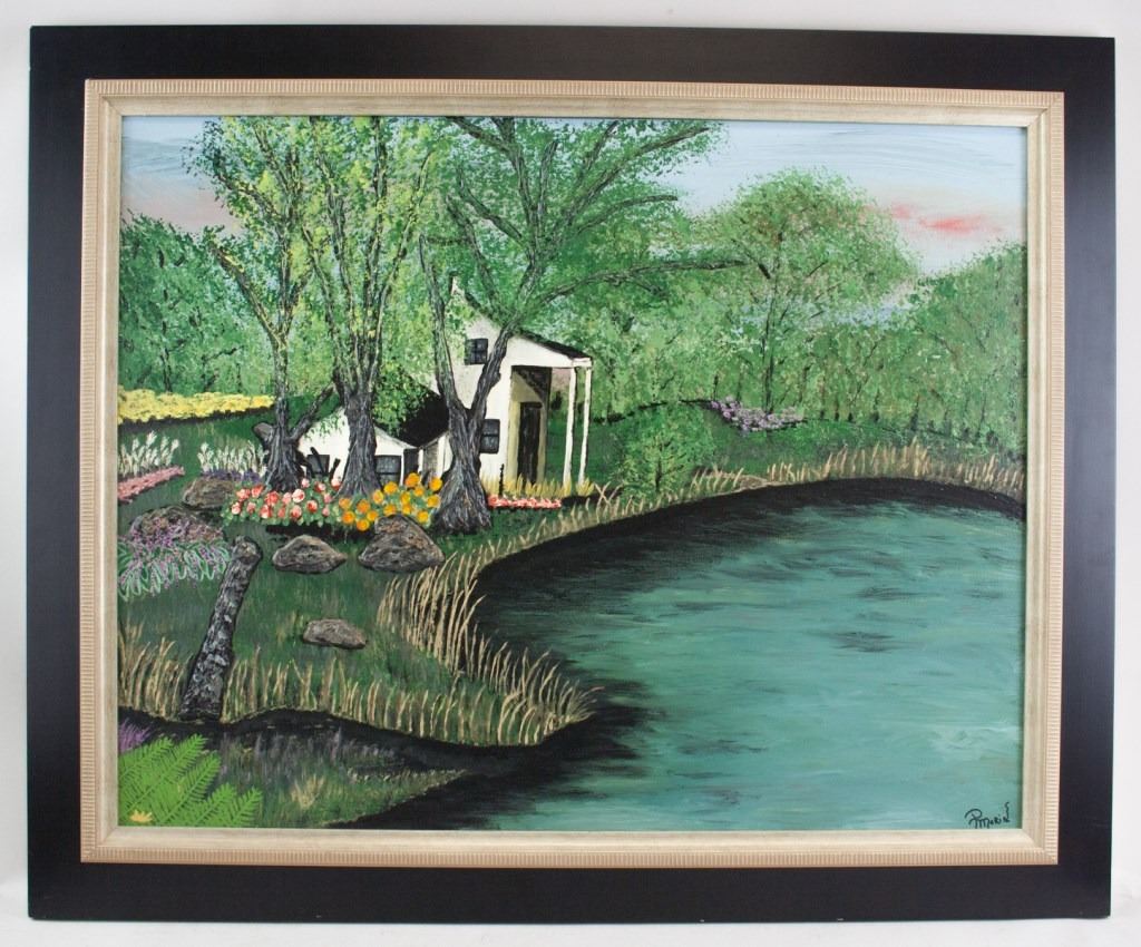 Mixed media on canvas, framed. Featuring lakeside house. Signed "PMorin" to the bottom right corner. Canvas size: 54 x 70 cm (21.5 x 27.5 inches). Frame size: 69 x 84 cm (27 x 33 inches).
