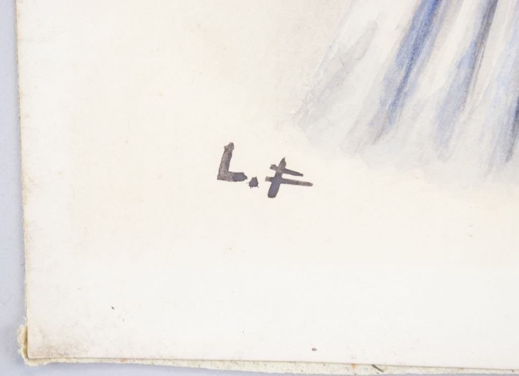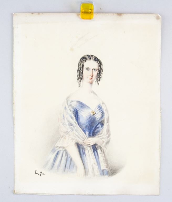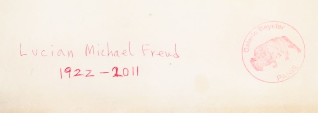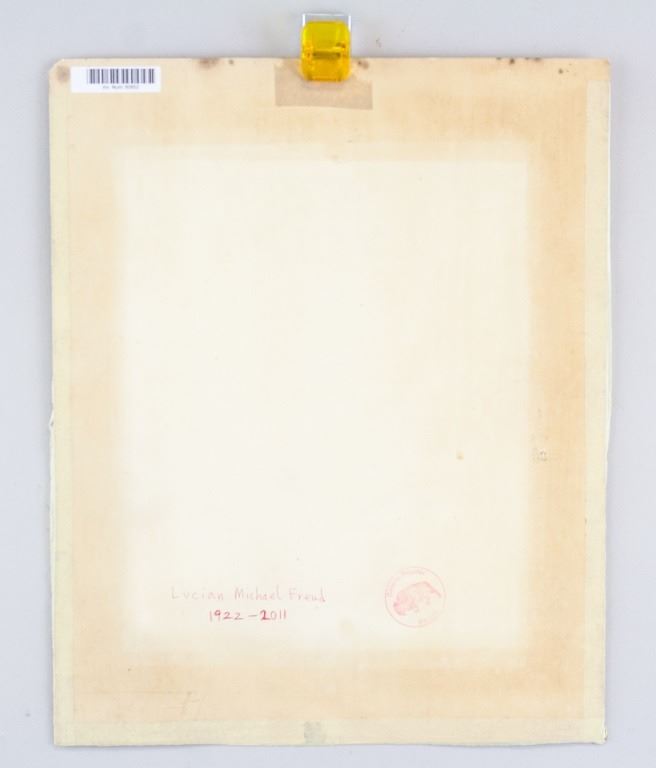 Mixed media on paper. Featuring portrait of a woman in a blue dress with a shawl. Signed "L.F" to the bottom left corner. "Lucian Michel Freud / 1922-2011" inscribed on verso. Stamped "Galerie Beyeler PARIS" on verso. 34 x 27 cm (13.5 11 inch).