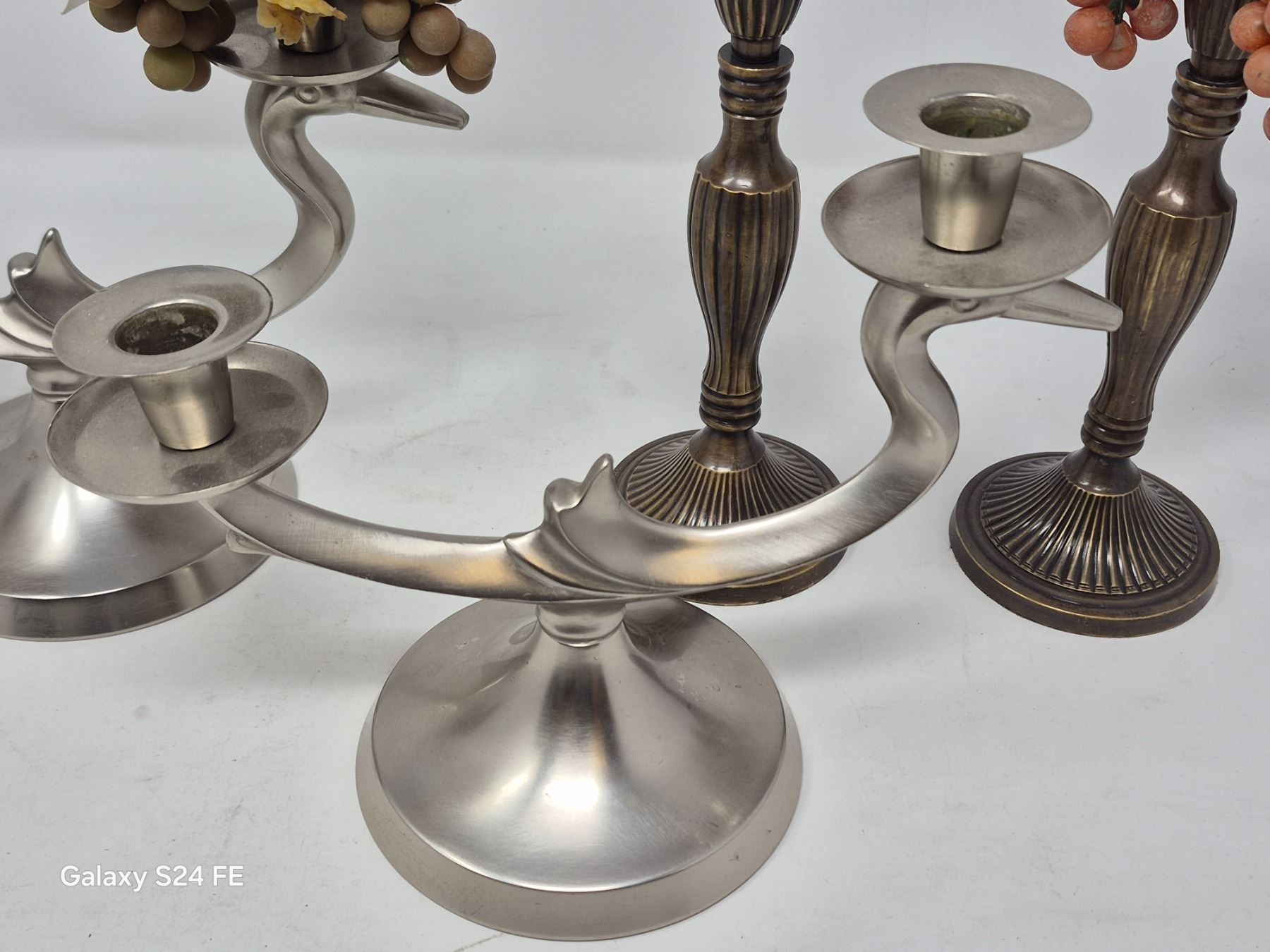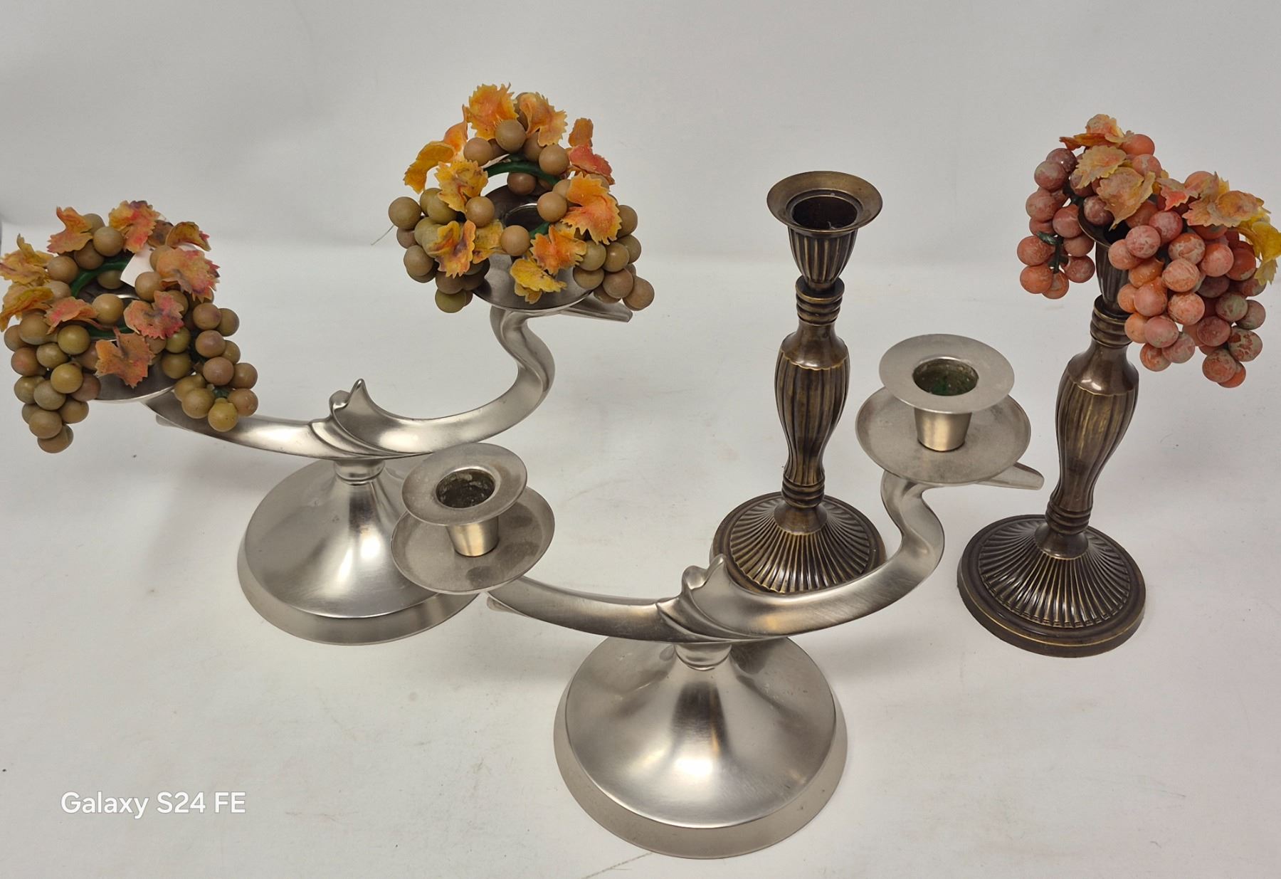 Assorted candleholder set including 2 brushed metal double-arm holders with swooping design and 2 ribbed bronze-tone singles. Adorned with faux grapevine wreaths. Great for eclectic or vintage décor!