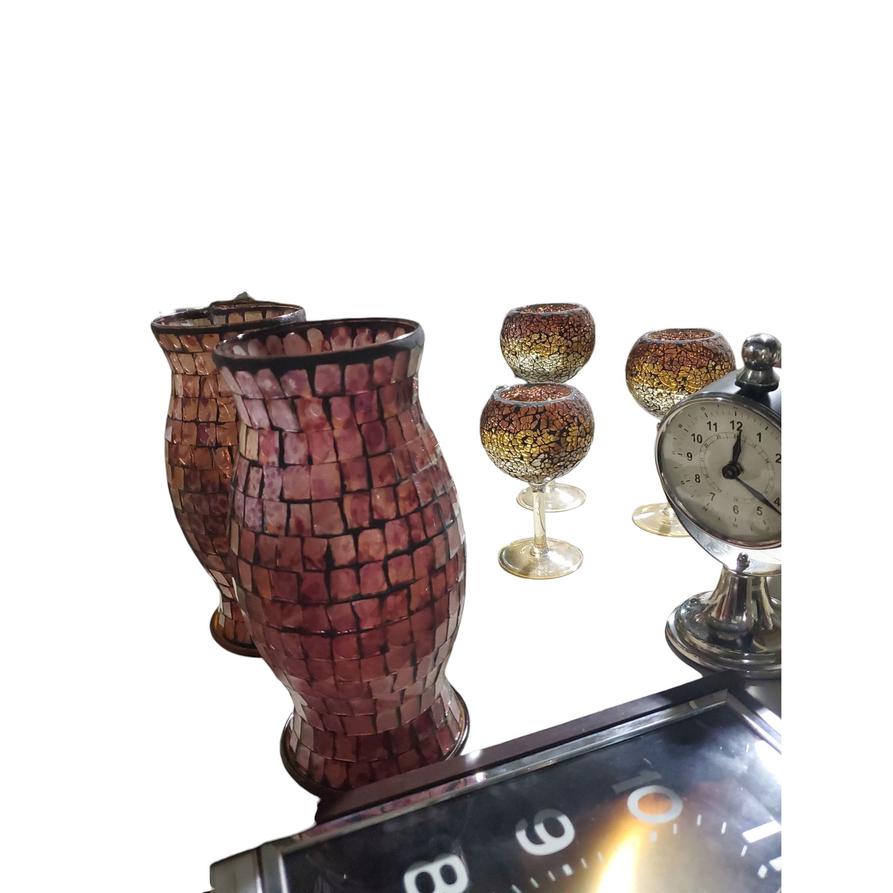 Mixed Misc Items: Clocks & Home Decor - Mosaic Vases, Bulova Transistor and General Electric Wall Clock (Model 2501A),and More