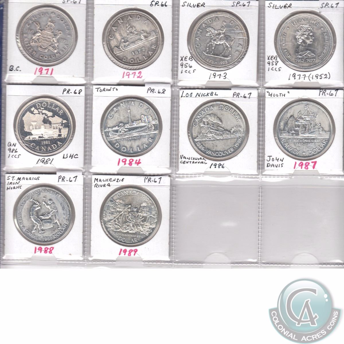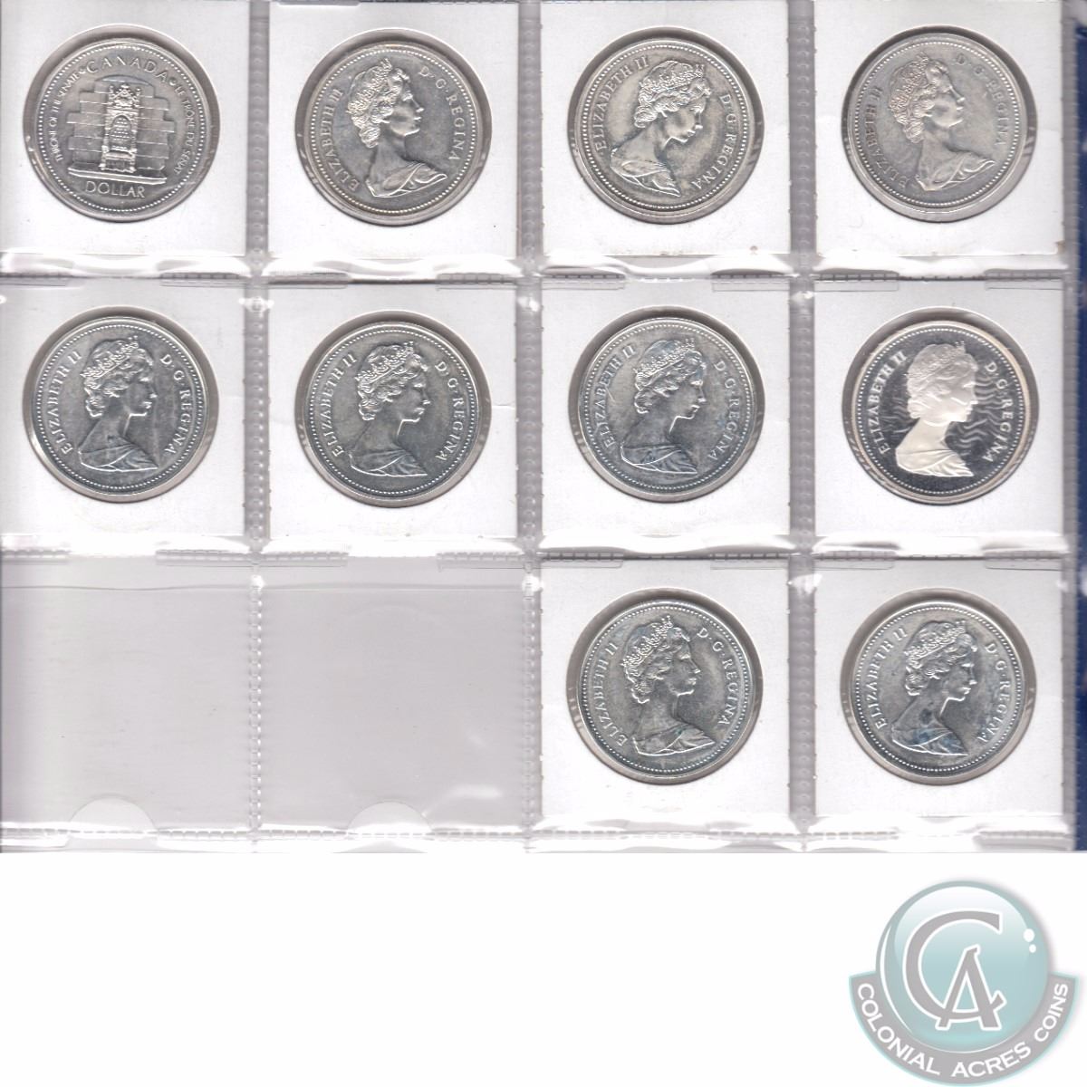 Mixed Page of 10x Canada Commemorative Specimen and Proof Silver Dollars Dated 1971-1989 (Coins are toned) 10pcs
