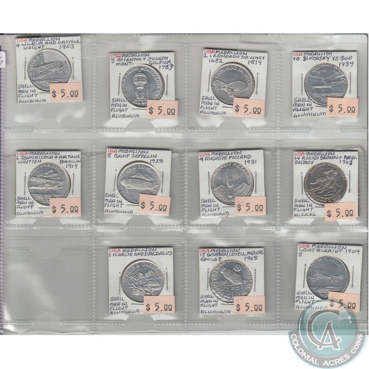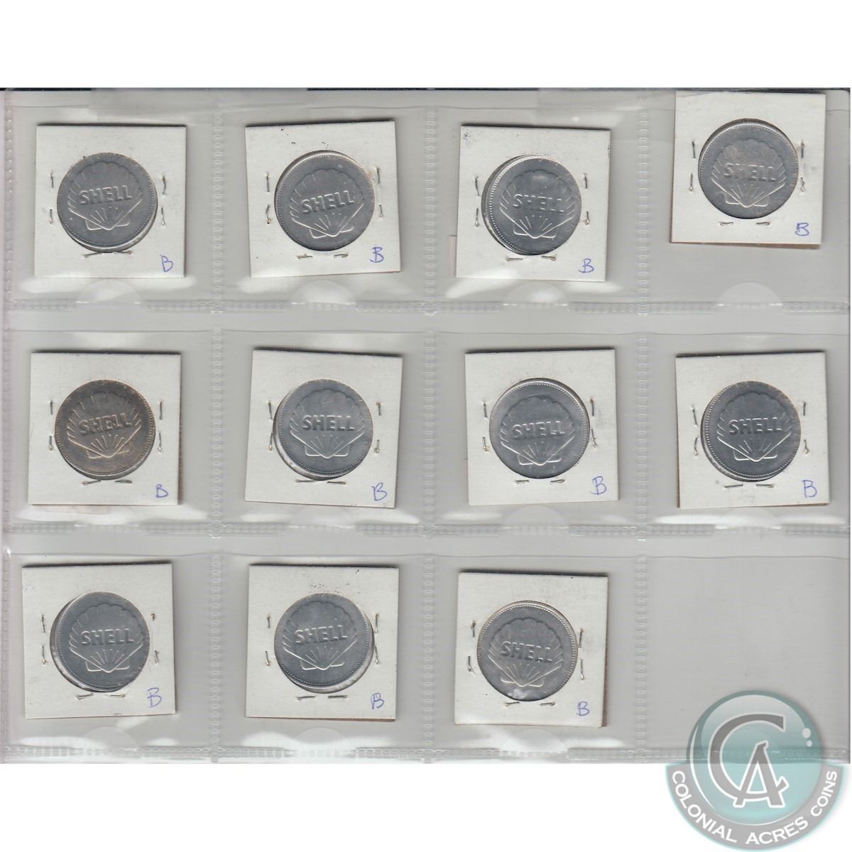Mixed Page of 11x Shell Gas Station "Man in Flight" Aluminum Tokens. Sold as is, No Returns.