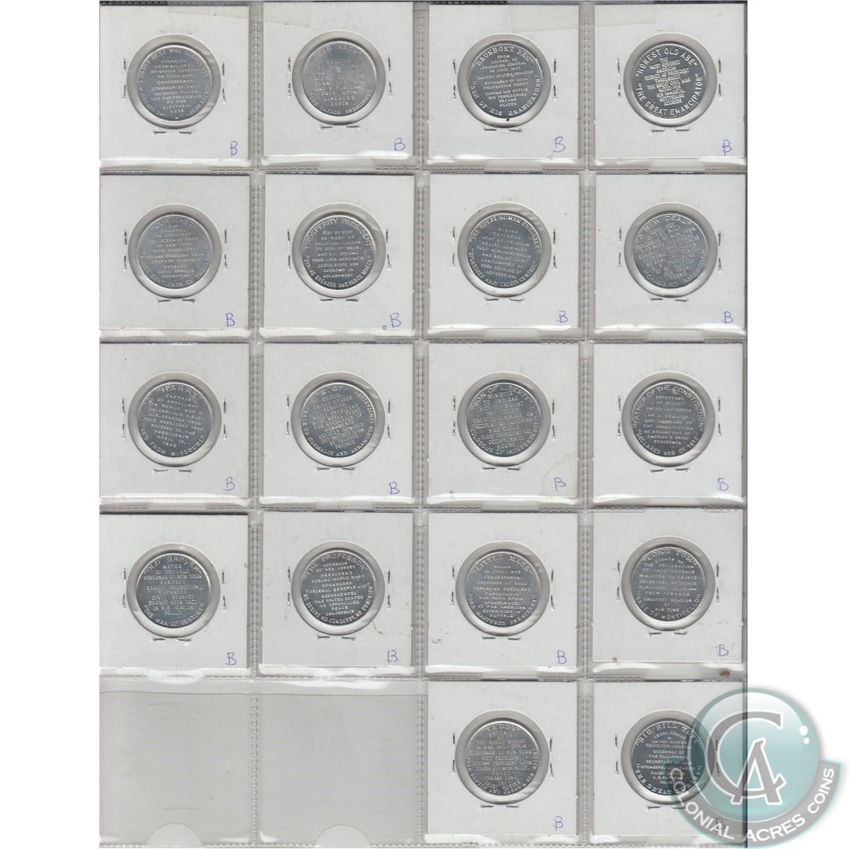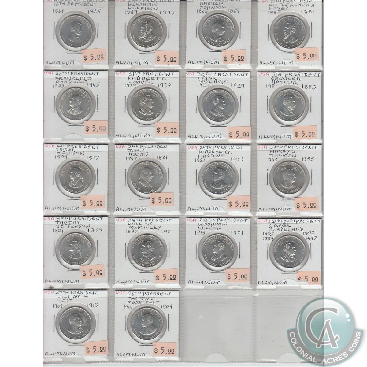 Mixed Page of 18x USA Commemorative Presidential Aluminum Tokens. Sold as is, No Returns.