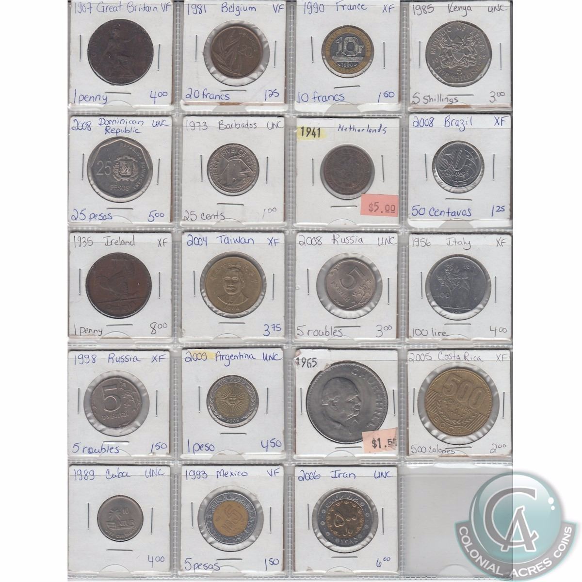 Mixed Page of 19x Various Mixed World Coins-oldest date 1907. Please view scan, no return on this item.