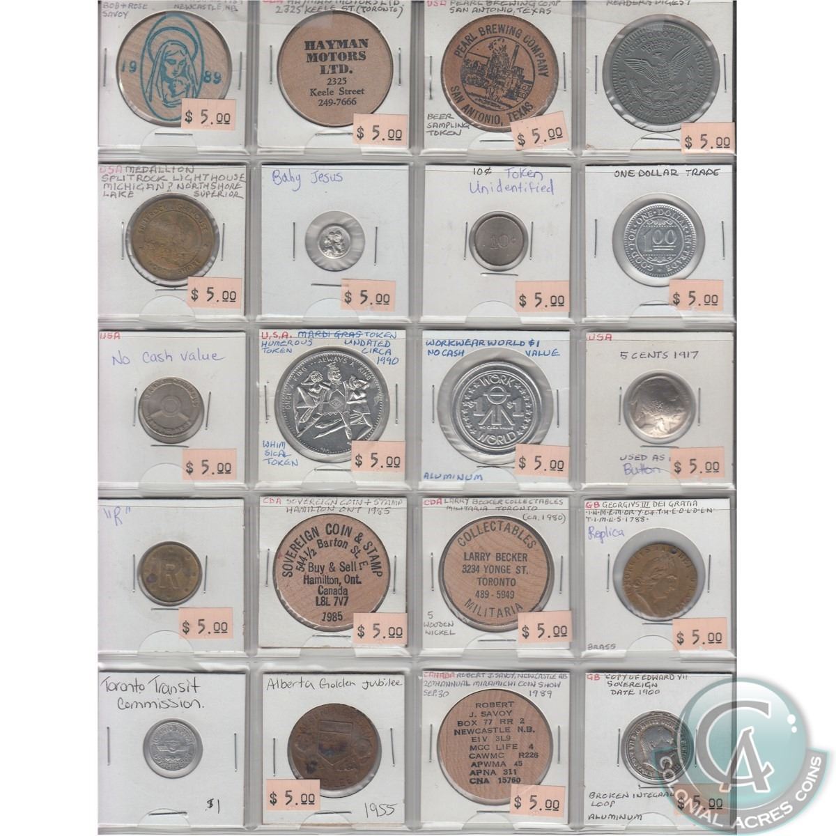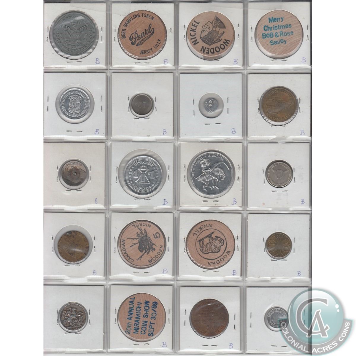 Mixed Page of 20 x Various Tokens and Wooden Nickels. Sold as is, No Returns.