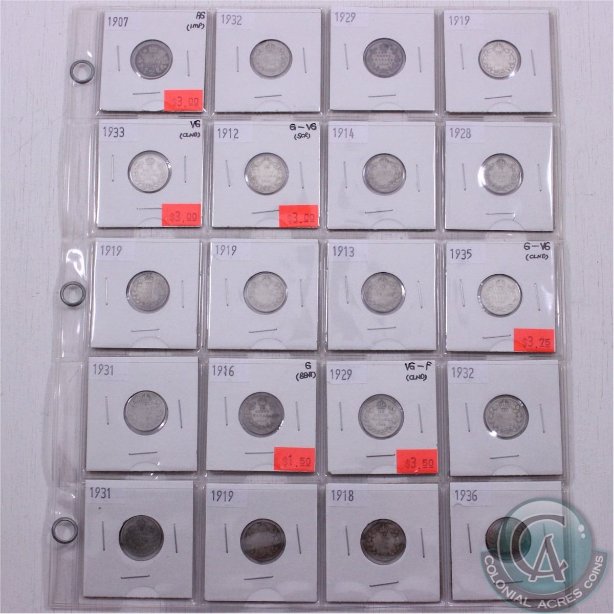 Mixed Page of 20x Canadian 10-cent coins. Dates range from 1907 to 1936. Page sold as is. (20pcs)