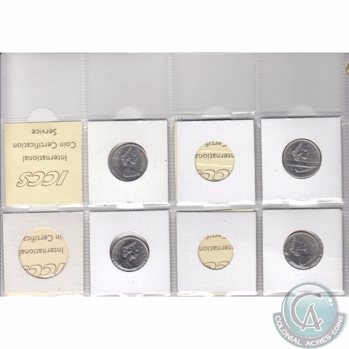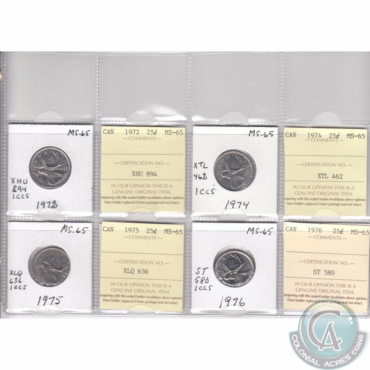 Mixed Page of 4x Canada 25-cent Dated 1972-1976 ICCS Certified MS-65. These coins were initially Certified by ICCS, however the coins were removed from the ICCS Holders. 4pcs (includes ICCS Certificate).
