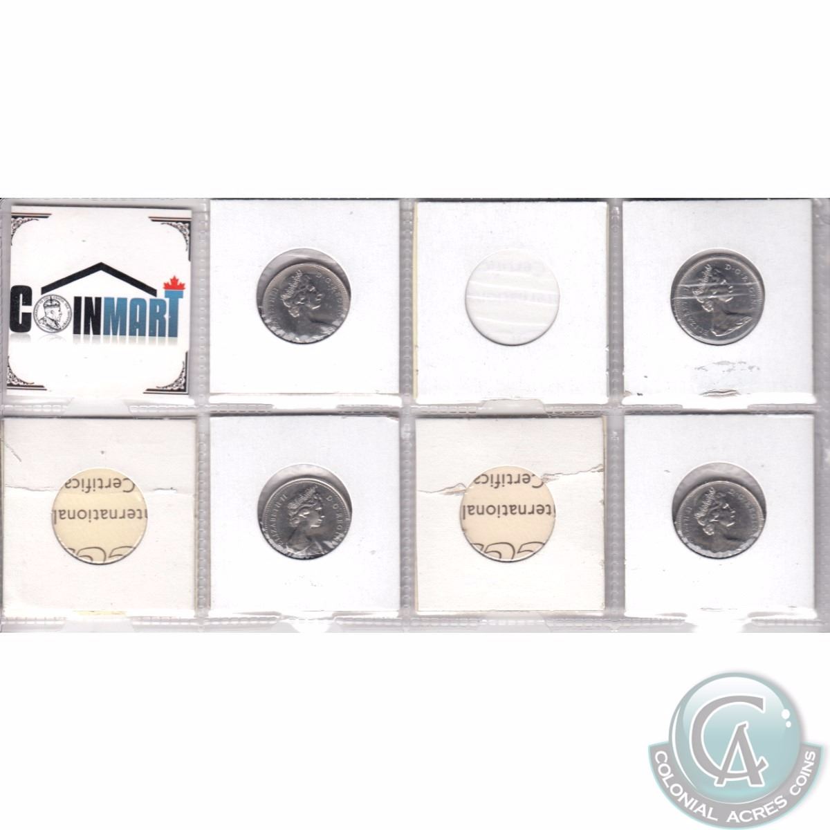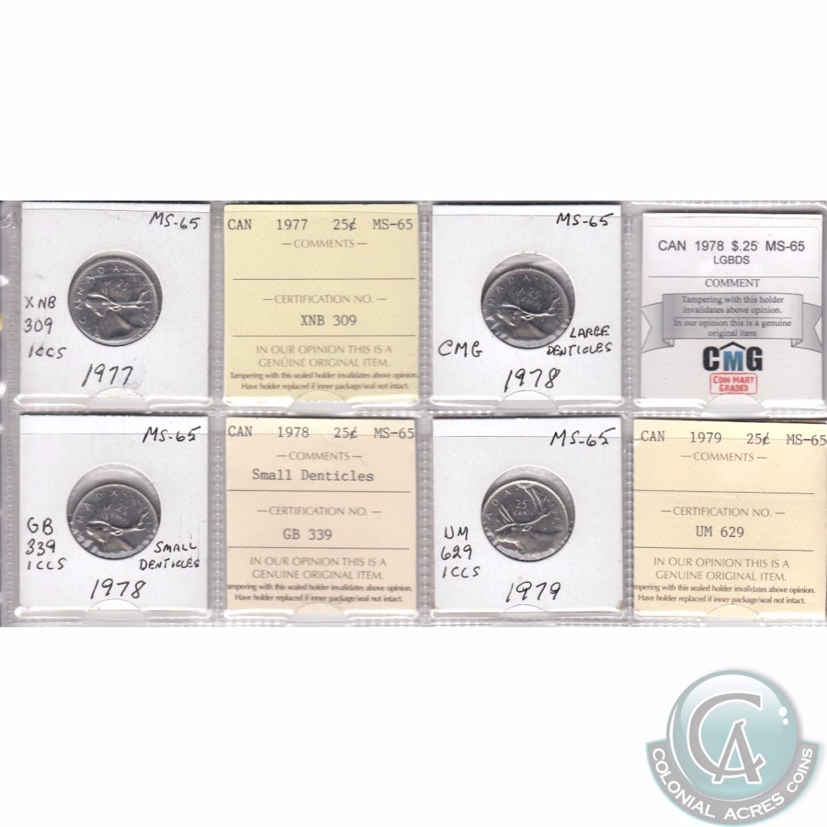 Mixed Page of 4x Canada 25-cent Dated 1977-1979 ICCS/CMG Certified MS-65. These coins were initially Certified by ICCS, however the coins were removed from the ICCS Holders. 4pcs
