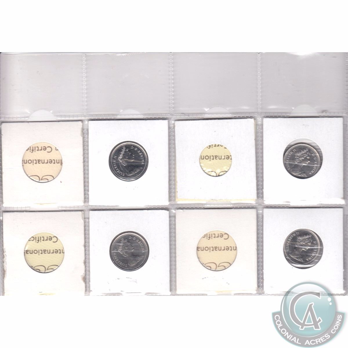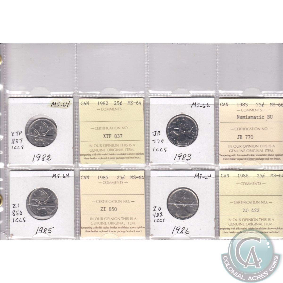 Mixed Page of 4x Canada 25-cent Dated 1982-1986 ICCS Certified MS-64 & MS-66 Numismatic BU. These coins were initially Certified by ICCS, however the coins were removed from the ICCS Holders. 4pcs (includes ICCS Certificate).