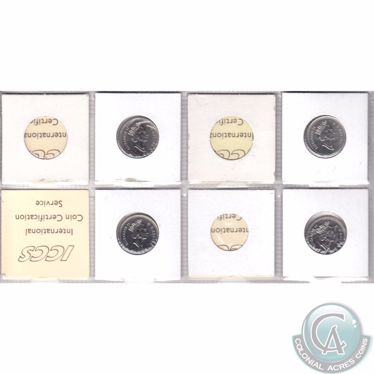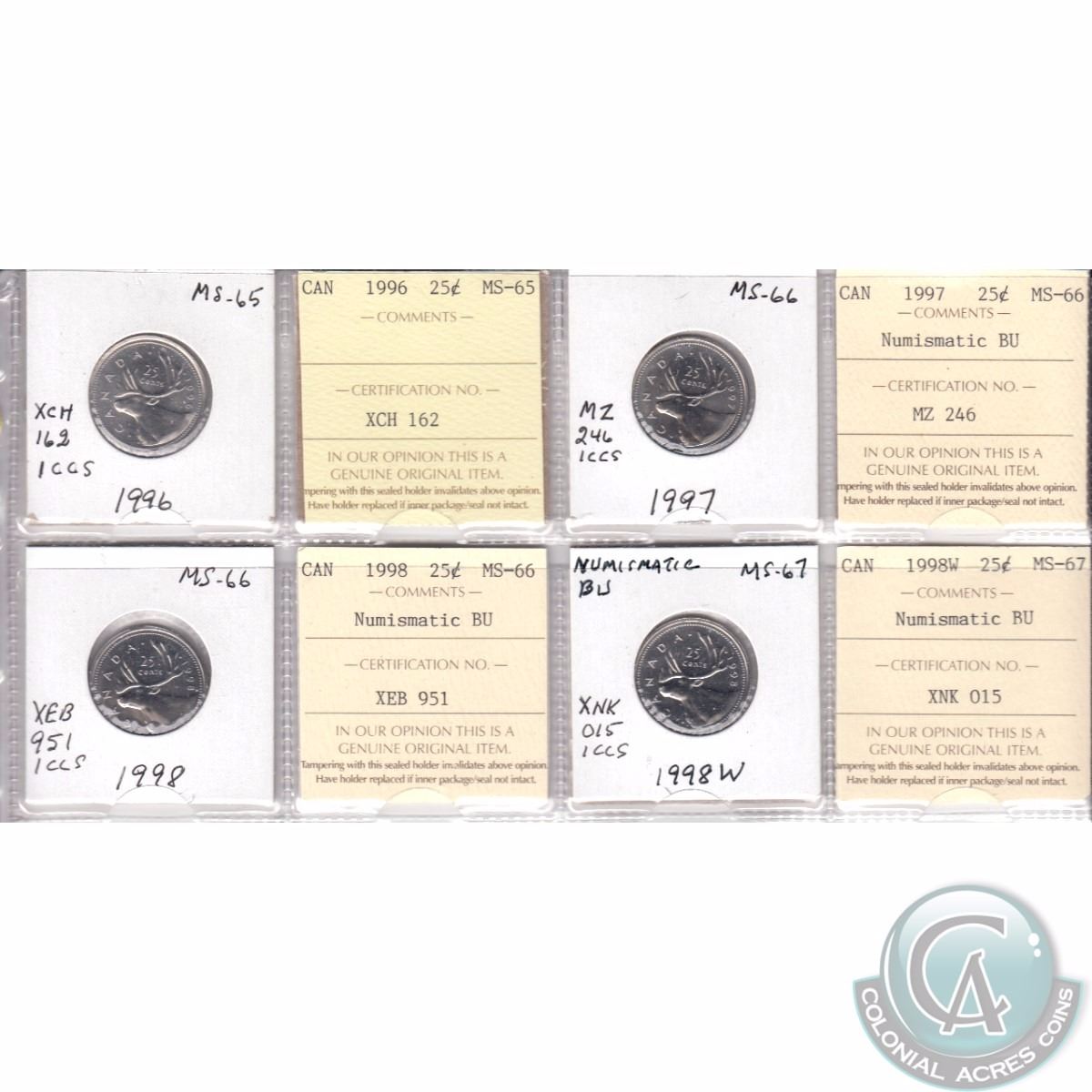 Mixed Page of 4x Canada 25-cent Dated 1996-1998 ICCS Certified MS-65, MS-66 Numismatic BU & MS-67 Numismatic BU. These coins were initially Certified by ICCS, however the coins were removed from the ICCS Holders. 4pcs (includes ICCS Certificate).