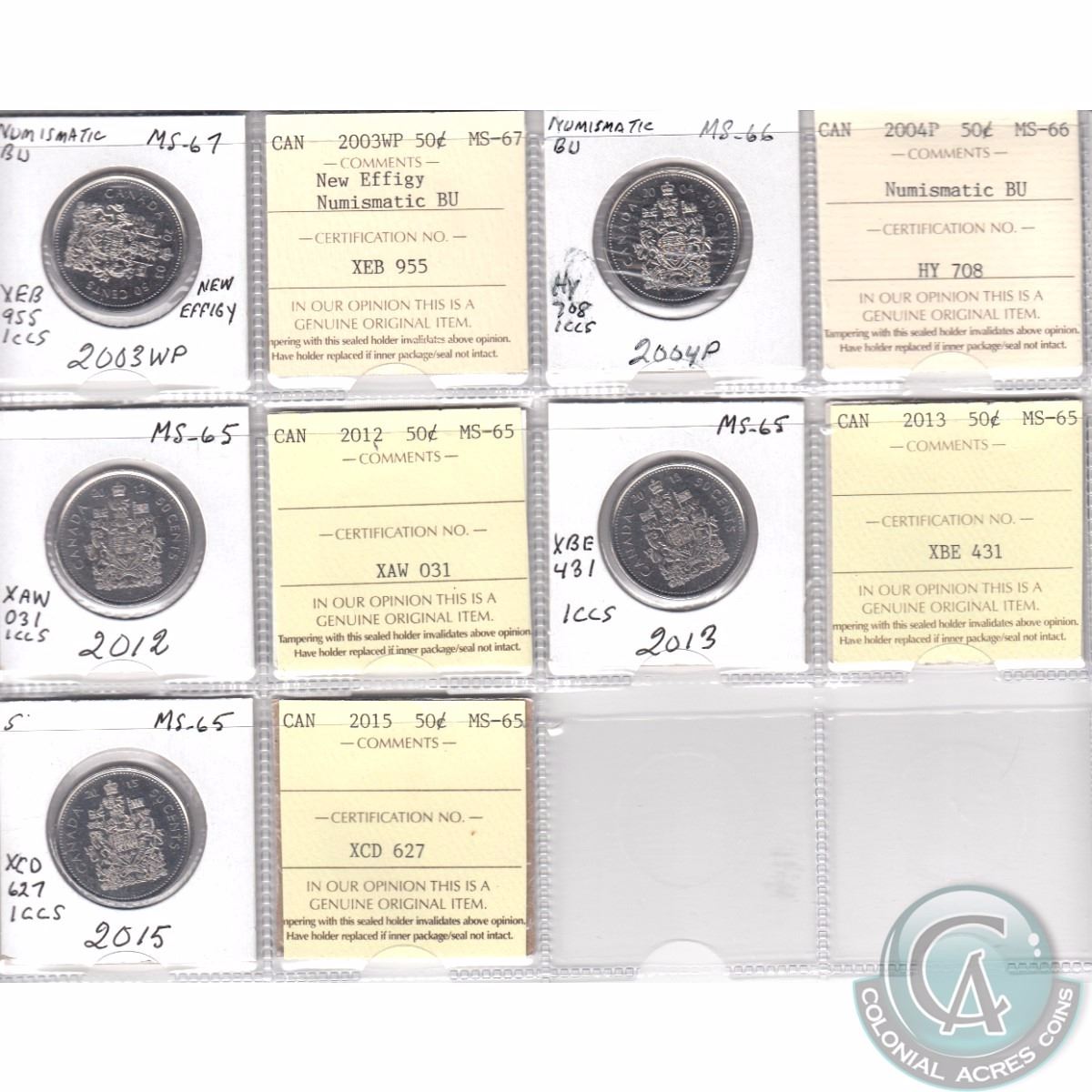 Mixed Page of 5x Canada 50-cent Dated 2003-2015 ICCS Certified MS-65 & MS-66/67 Numismatic BU. These coins were initially Certified by ICCS, however the coins were removed from the ICCS Holders. 5pcs (includes ICCS Certificate).